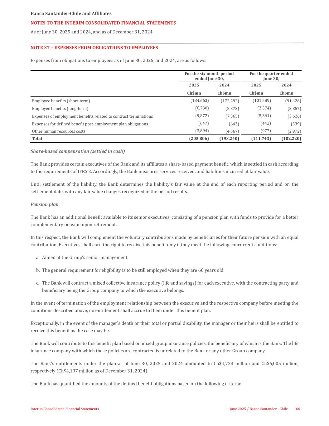Banco Santander-Chile and Affiliates NOTES TO THE INTERIM CONSOLIDATED FINANCIAL STATEMENTS As of June 30, 2025 and 2024, and as of December 31, 2024 Interim Consolidated Financial Statements June 2025 / Banco Santander - Chile 166 NOTE 37 EXPENSES FROM OBLIGATIONS TO EMPLOYEES Expenses from obligations to employees as of June 30, 2025, and 2024, are as follows: For the six-month period ended June 30, For the quarter ended June 30, 2025 2024 2025 2024 Ch$mn Ch$mn Ch$mn Ch$mn Employee benefits (short-term) (184,663) (172,292) (101,589) (91,426) Employee benefits (long-term) (6,730) (8,373) (3,374) (3,857) Expenses of employment benefits related to contract terminations (9,872) (7,365) (5,361) (3,626) Expenses for defined benefit post-employment plan obligations (647) (643) (442) (339) Other human resources costs (3,894) (4,567) (977) (2,972) Total (205,806) (193,240) (111,743) (102,220) Share-based compensation (settled in cash) The Bank provides certain executives of the Bank and its affiliates a share-based payment benefit, which is settled in cash according to the requirements of IFRS 2. Accordingly, the Bank measures services received, and liabilities incurred at fair value. Until settlement of the liability, the Bank determines the liability's fair value at the end of each reporting period and on the settlement date, with any fair value changes recognized in the period results. Pension plan The Bank has an additional benefit available to its senior executives, consisting of a pension plan with funds to provide for a better complementary pension upon retirement. In this respect, the Bank will complement the voluntary contributions made by beneficiaries for their future pension with an equal contribution. Executives shall earn the right to receive this benefit only if they meet the following concurrent conditions: a. Aimed at the Group's senior management. b. The general requirement for eligibility is to be still employed when they are 60 years old. c. The Bank will contract a mixed collective insurance policy (life and savings) for each executive, with the contracting party and beneficiary being the Group company to which the executive belongs. In the event of termination of the employment relationship between the executive and the respective company before meeting the conditions described above, no entitlement shall accrue to them under this benefit plan. Exceptionally, in the event of the manager's death or their total or partial disability, the manager or their heirs shall be entitled to receive this benefit as the case may be. The Bank will contribute to this benefit plan based on mixed group insurance policies, the beneficiary of which is the Bank. The life insurance company with which these policies are contracted is unrelated to the Bank or any other Group company. The Bank's entitlements under the plan as of June 30, 2025 and 2024 amounted to Ch$4,723 million and Ch$6,005 million, respectively (Ch$4,107 million as of December 31, 2024). The Bank has quantified the amounts of the defined benefit obligations based on the following criteria: