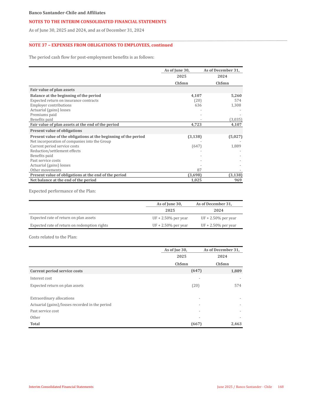 Banco Santander-Chile and Affiliates NOTES TO THE INTERIM CONSOLIDATED FINANCIAL STATEMENTS As of June 30, 2025 and 2024, and as of December 31, 2024 Interim Consolidated Financial Statements June 2025 / Banco Santander - Chile 168 NOTE 37 EXPENSES FROM OBLIGATIONS TO EMPLOYEES, continued The period cash flow for post-employment benefits is as follows: As of June 30, As of December 31, 2025 2024 Ch$mn Ch$mn Fair value of plan assets Balance at the beginning of the period 4,107 5,260 Expected return on insurance contracts (20) 574 Employer contributions 636 1,308 Actuarial (gains) losses - - Premiums paid - - Benefits paid - (3,035) Fair value of plan assets at the end of the period 4,723 4,107 Present value of obligations Present value of the obligations at the beginning of the period (3,138) (5,027) Net incorporation of companies into the Group - - Current period service costs (647) 1,889 Reduction/settlement effects - - Benefits paid - - Past service costs - - Actuarial (gains) losses - - Other movements 87 - Present value of obligations at the end of the period (3,698) (3,138) Net balance at the end of the period 1,025 969 Expected performance of the Plan: As of June 30, As of December 31, 2025 2024 Expected rate of return on plan assets UF + 2.50% per year UF + 2.50% per year Expected rate of return on redemption rights UF + 2.50% per year UF + 2.50% per year Costs related to the Plan: As of Jue 30, As of December 31, 2025 2024 Ch$mn Ch$mn Current period service costs (647) 1,889 Interest cost - - Expected return on plan assets (20) 574 Extraordinary allocations - - Actuarial (gains)/losses recorded in the period - - Past service cost - - Other - - Total (667) 2,463