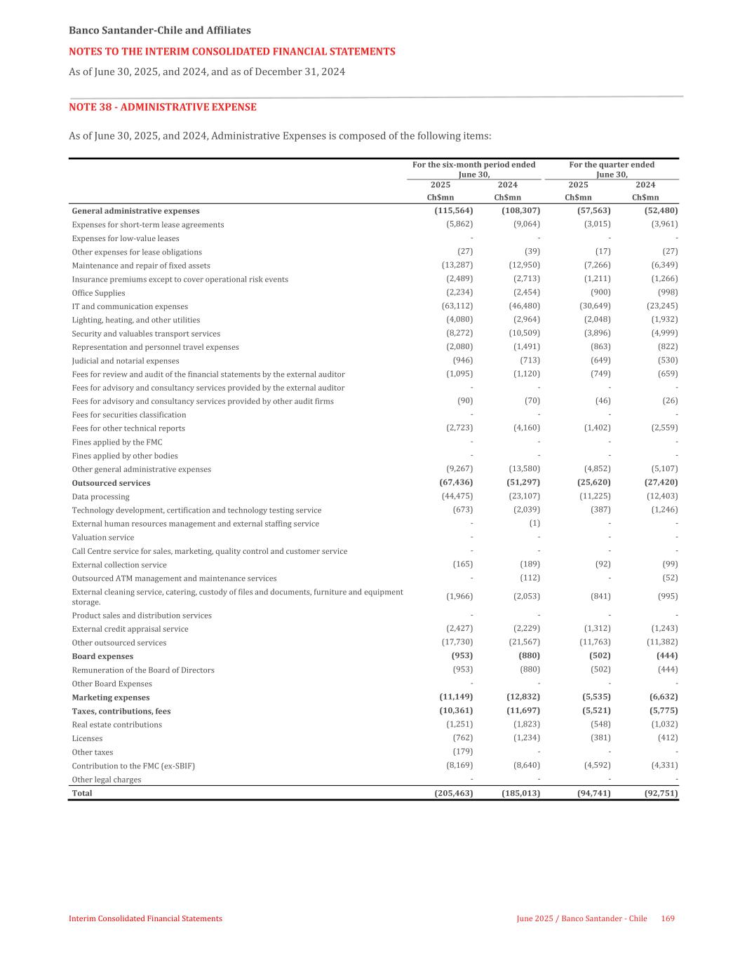 Banco Santander-Chile and Affiliates NOTES TO THE INTERIM CONSOLIDATED FINANCIAL STATEMENTS As of June 30, 2025, and 2024, and as of December 31, 2024 Interim Consolidated Financial Statements June 2025 / Banco Santander - Chile 169 NOTE 38 - ADMINISTRATIVE EXPENSE As of June 30, 2025, and 2024, Administrative Expenses is composed of the following items: For the six-month period ended June 30, For the quarter ended June 30, 2025 2024 2025 2024 Ch$mn Ch$mn Ch$mn Ch$mn General administrative expenses (115,564) (108,307) (57,563) (52,480) Expenses for short-term lease agreements (5,862) (9,064) (3,015) (3,961) Expenses for low-value leases - - - - Other expenses for lease obligations (27) (39) (17) (27) Maintenance and repair of fixed assets (13,287) (12,950) (7,266) (6,349) Insurance premiums except to cover operational risk events (2,489) (2,713) (1,211) (1,266) Office Supplies (2,234) (2,454) (900) (998) IT and communication expenses (63,112) (46,480) (30,649) (23,245) Lighting, heating, and other utilities (4,080) (2,964) (2,048) (1,932) Security and valuables transport services (8,272) (10,509) (3,896) (4,999) Representation and personnel travel expenses (2,080) (1,491) (863) (822) Judicial and notarial expenses (946) (713) (649) (530) Fees for review and audit of the financial statements by the external auditor (1,095) (1,120) (749) (659) Fees for advisory and consultancy services provided by the external auditor - - - - Fees for advisory and consultancy services provided by other audit firms (90) (70) (46) (26) Fees for securities classification - - - - Fees for other technical reports (2,723) (4,160) (1,402) (2,559) Fines applied by the FMC - - - - Fines applied by other bodies - - - - Other general administrative expenses (9,267) (13,580) (4,852) (5,107) Outsourced services (67,436) (51,297) (25,620) (27,420) Data processing (44,475) (23,107) (11,225) (12,403) Technology development, certification and technology testing service (673) (2,039) (387) (1,246) External human resources management and external staffing service - (1) - - Valuation service - - - - Call Centre service for sales, marketing, quality control and customer service - - - - External collection service (165) (189) (92) (99) Outsourced ATM management and maintenance services - (112) - (52) External cleaning service, catering, custody of files and documents, furniture and equipment storage. (1,966) (2,053) (841) (995) Product sales and distribution services - - - - External credit appraisal service (2,427) (2,229) (1,312) (1,243) Other outsourced services (17,730) (21,567) (11,763) (11,382) Board expenses (953) (880) (502) (444) Remuneration of the Board of Directors (953) (880) (502) (444) Other Board Expenses - - - - Marketing expenses (11,149) (12,832) (5,535) (6,632) Taxes, contributions, fees (10,361) (11,697) (5,521) (5,775) Real estate contributions (1,251) (1,823) (548) (1,032) Licenses (762) (1,234) (381) (412) Other taxes (179) - - - Contribution to the FMC (ex-SBIF) (8,169) (8,640) (4,592) (4,331) Other legal charges - - - - Total (205,463) (185,013) (94,741) (92,751)