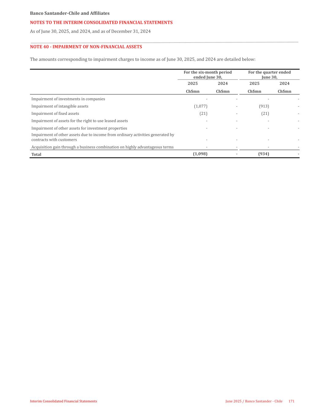 Banco Santander-Chile and Affiliates NOTES TO THE INTERIM CONSOLIDATED FINANCIAL STATEMENTS As of June 30, 2025, and 2024, and as of December 31, 2024 Interim Consolidated Financial Statements June 2025 / Banco Santander - Chile 171 NOTE 40 - IMPAIRMENT OF NON-FINANCIAL ASSETS The amounts corresponding to impairment charges to income as of June 30, 2025, and 2024 are detailed below: For the six-month period ended June 30, For the quarter ended June 30, 2025 2024 2025 2024 Ch$mn Ch$mn Ch$mn Ch$mn Impairment of investments in companies - - - - Impairment of intangible assets (1,077) - (913) - Impairment of fixed assets (21) - (21) - Impairment of assets for the right to use leased assets - - - - Impairment of other assets for investment properties - - - - Impairment of other assets due to income from ordinary activities generated by contracts with customers - - - - Acquisition gain through a business combination on highly advantageous terms - - - - Total (1,098) - (934) -