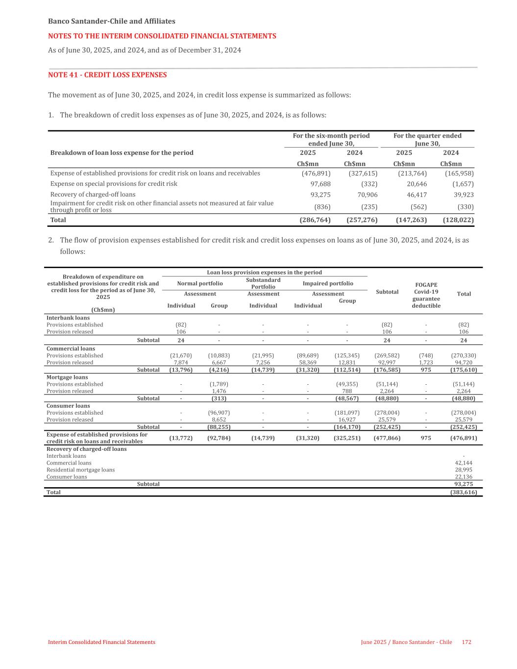 Banco Santander-Chile and Affiliates NOTES TO THE INTERIM CONSOLIDATED FINANCIAL STATEMENTS As of June 30, 2025, and 2024, and as of December 31, 2024 Interim Consolidated Financial Statements June 2025 / Banco Santander - Chile 172 NOTE 41 - CREDIT LOSS EXPENSES The movement as of June 30, 2025, and 2024, in credit loss expense is summarized as follows: 1. The breakdown of credit loss expenses as of June 30, 2025, and 2024, is as follows: For the six-month period ended June 30, For the quarter ended June 30, Breakdown of loan loss expense for the period 2025 2024 2025 2024 Ch$mn Ch$mn Ch$mn Ch$mn Expense of established provisions for credit risk on loans and receivables (476,891) (327,615) (213,764) (165,958) Expense on special provisions for credit risk 97,688 (332) 20,646 (1,657) Recovery of charged-off loans 93,275 70,906 46,417 39,923 Impairment for credit risk on other financial assets not measured at fair value through profit or loss (836) (235) (562) (330) Total (286,764) (257,276) (147,263) (128,022) 2. The flow of provision expenses established for credit risk and credit loss expenses on loans as of June 30, 2025, and 2024, is as follows: Breakdown of expenditure on established provisions for credit risk and credit loss for the period as of June 30, 2025 Loan loss provision expenses in the period Normal portfolio Substandard Portfolio Impaired portfolio Subtotal FOGAPE Covid-19 guarantee deductible Assessment Assessment Assessment Total Individual Group Individual Individual Group (Ch$mn) Interbank loans Provisions established (82) - - - - (82) - (82) Provision released 106 - - - - 106 - 106 Subtotal 24 - - - - 24 - 24 Commercial loans Provisions established (21,670) (10,883) (21,995) (89,689) (125,345) (269,582) (748) (270,330) Provision released 7,874 6,667 7,256 58,369 12,831 92,997 1,723 94,720 Subtotal (13,796) (4,216) (14,739) (31,320) (112,514) (176,585) 975 (175,610) Mortgage loans Provisions established - (1,789) - - (49,355) (51,144) - (51,144) Provision released - 1,476 - - 788 2,264 - 2,264 Subtotal - (313) - - (48,567) (48,880) - (48,880) Consumer loans Provisions established - (96,907) - - (181,097) (278,004) - (278,004) Provision released - 8,652 - - 16,927 25,579 - 25,579 Subtotal - (88,255) - - (164,170) (252,425) - (252,425) Expense of established provisions for credit risk on loans and receivables (13,772) (92,784) (14,739) (31,320) (325,251) (477,866) 975 (476,891) Recovery of charged-off loans Interbank loans - Commercial loans 42,144 Residential mortgage loans 28,995 Consumer loans 22,136 Subtotal 93,275 Total (383,616)