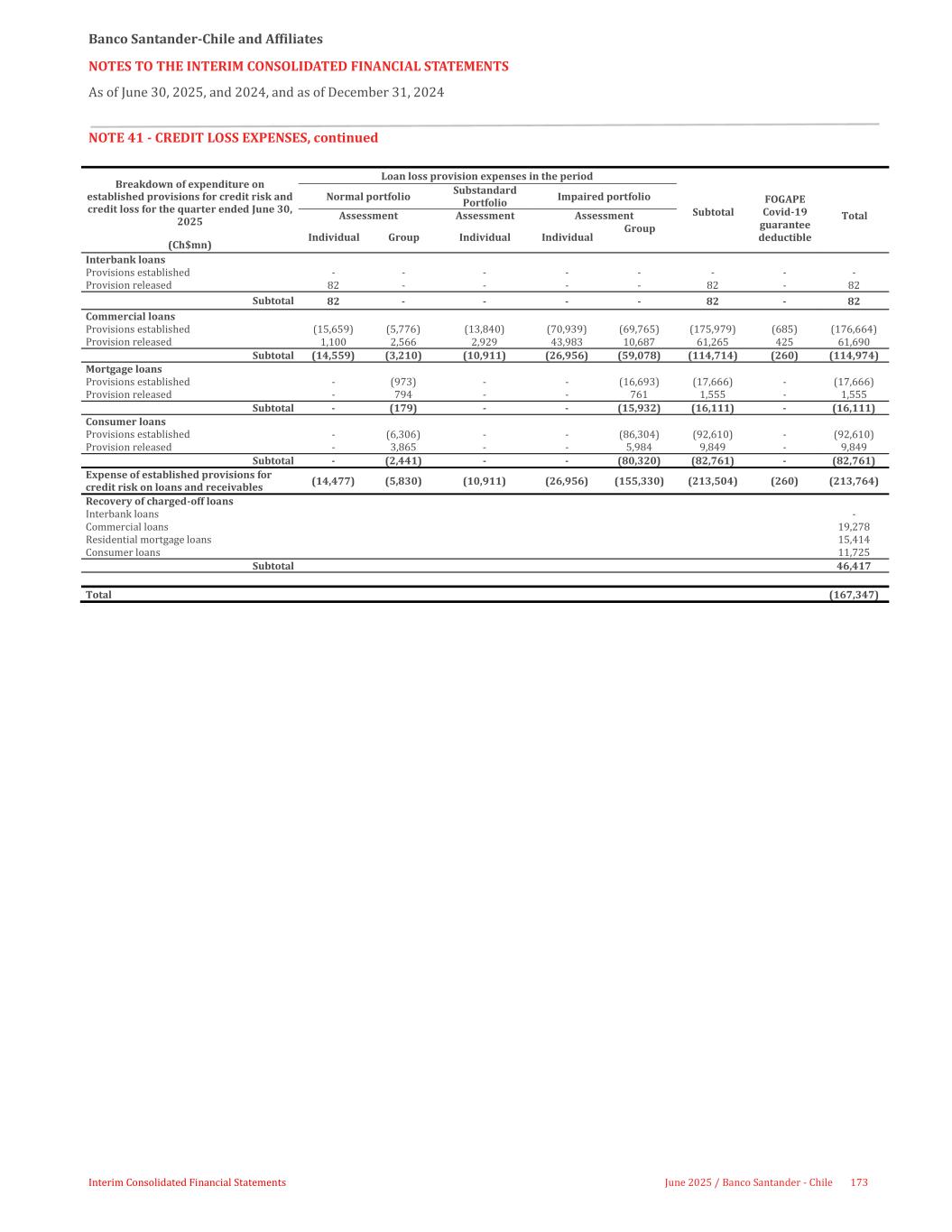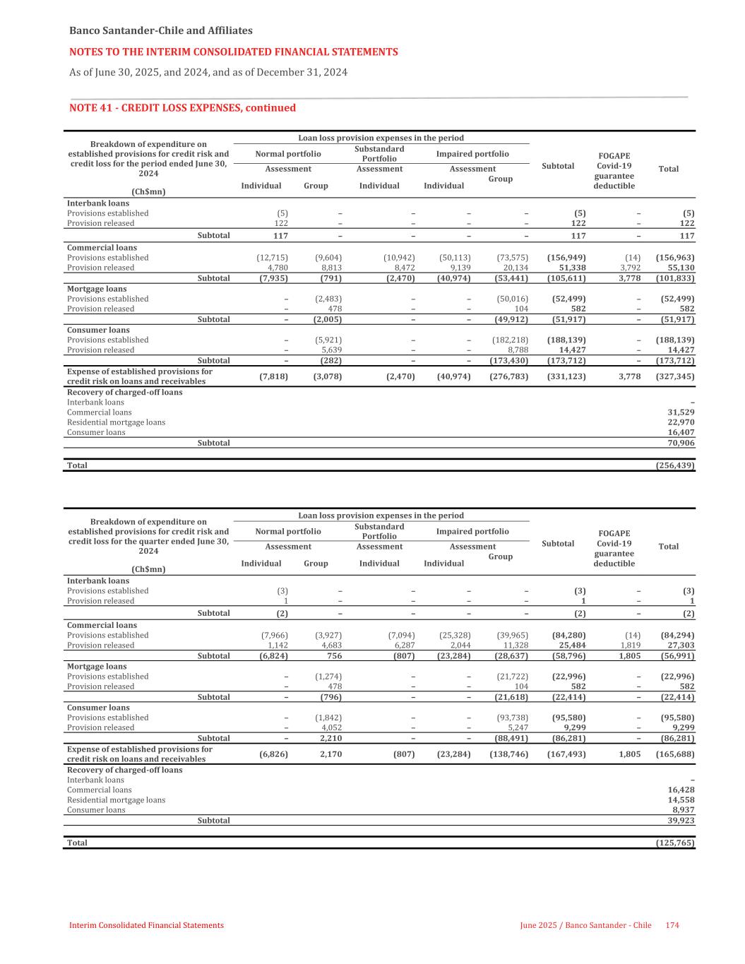 Banco Santander-Chile and Affiliates NOTES TO THE INTERIM CONSOLIDATED FINANCIAL STATEMENTS As of June 30, 2025, and 2024, and as of December 31, 2024 Interim Consolidated Financial Statements June 2025 / Banco Santander - Chile 173 NOTE 41 - CREDIT LOSS EXPENSES, continued Breakdown of expenditure on established provisions for credit risk and credit loss for the quarter ended June 30, 2025 Loan loss provision expenses in the period Normal portfolio Substandard Portfolio Impaired portfolio Subtotal FOGAPE Covid-19 guarantee deductible Assessment Assessment Assessment Total Individual Group Individual Individual Group (Ch$mn) Interbank loans Provisions established - - - - - - - - Provision released 82 - - - - 82 - 82 Subtotal 82 - - - - 82 - 82 Commercial loans Provisions established (15,659) (5,776) (13,840) (70,939) (69,765) (175,979) (685) (176,664) Provision released 1,100 2,566 2,929 43,983 10,687 61,265 425 61,690 Subtotal (14,559) (3,210) (10,911) (26,956) (59,078) (114,714) (260) (114,974) Mortgage loans Provisions established - (973) - - (16,693) (17,666) - (17,666) Provision released - 794 - - 761 1,555 - 1,555 Subtotal - (179) - - (15,932) (16,111) - (16,111) Consumer loans Provisions established - (6,306) - - (86,304) (92,610) - (92,610) Provision released - 3,865 - - 5,984 9,849 - 9,849 Subtotal - (2,441) - - (80,320) (82,761) - (82,761) Expense of established provisions for credit risk on loans and receivables (14,477) (5,830) (10,911) (26,956) (155,330) (213,504) (260) (213,764) Recovery of charged-off loans Interbank loans - Commercial loans 19,278 Residential mortgage loans 15,414 Consumer loans 11,725 Subtotal 46,417 Total (167,347)