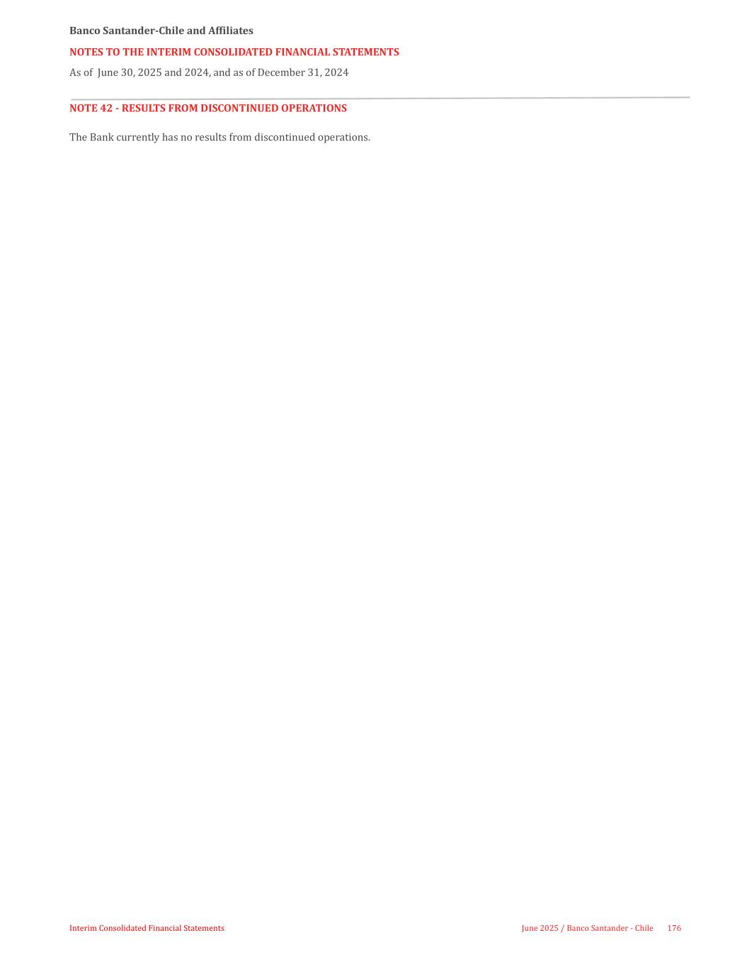 Banco Santander-Chile and Affiliates NOTES TO THE INTERIM CONSOLIDATED FINANCIAL STATEMENTS As of June 30, 2025 and 2024, and as of December 31, 2024 Interim Consolidated Financial Statements June 2025 / Banco Santander - Chile 176 NOTE 42 - RESULTS FROM DISCONTINUED OPERATIONS The Bank currently has no results from discontinued operations.