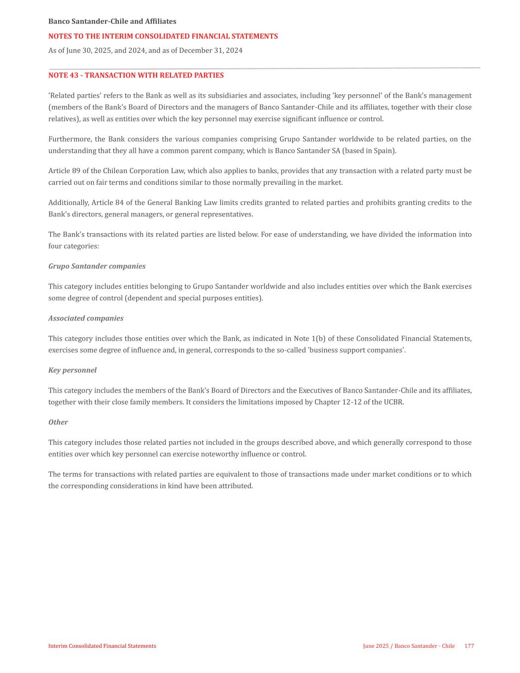 Banco Santander-Chile and Affiliates NOTES TO THE INTERIM CONSOLIDATED FINANCIAL STATEMENTS As of June 30, 2025, and 2024, and as of December 31, 2024 Interim Consolidated Financial Statements June 2025 / Banco Santander - Chile 177 NOTE 43 - TRANSACTION WITH RELATED PARTIES 'Related parties' refers to the Bank as well as its subsidiaries and associates, including 'key personnel' of the Bank's management (members of the Bank's Board of Directors and the managers of Banco Santander-Chile and its affiliates, together with their close relatives), as well as entities over which the key personnel may exercise significant influence or control. Furthermore, the Bank considers the various companies comprising Grupo Santander worldwide to be related parties, on the understanding that they all have a common parent company, which is Banco Santander SA (based in Spain). Article 89 of the Chilean Corporation Law, which also applies to banks, provides that any transaction with a related party must be carried out on fair terms and conditions similar to those normally prevailing in the market. Additionally, Article 84 of the General Banking Law limits credits granted to related parties and prohibits granting credits to the Bank's directors, general managers, or general representatives. The Bank's transactions with its related parties are listed below. For ease of understanding, we have divided the information into four categories: Grupo Santander companies This category includes entities belonging to Grupo Santander worldwide and also includes entities over which the Bank exercises some degree of control (dependent and special purposes entities). Associated companies This category includes those entities over which the Bank, as indicated in Note 1(b) of these Consolidated Financial Statements, exercises some degree of influence and, in general, corresponds to the so-called 'business support companies'. Key personnel -Chile and its affiliates, together with their close family members. It considers the limitations imposed by Chapter 12-12 of the UCBR. Other This category includes those related parties not included in the groups described above, and which generally correspond to those entities over which key personnel can exercise noteworthy influence or control. The terms for transactions with related parties are equivalent to those of transactions made under market conditions or to which the corresponding considerations in kind have been attributed.