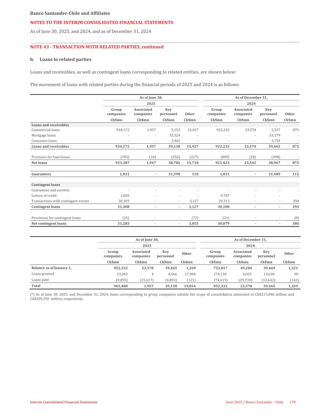 Banco Santander-Chile and Affiliates NOTES TO THE INTERIM CONSOLIDATED FINANCIAL STATEMENTS As of June 30, 2025, and 2024, and as of December 31, 2024 Interim Consolidated Financial Statements June 2025 / Banco Santander - Chile 178 NOTE 43 - TRANSACTION WITH RELATED PARTIES, continued b. Loans to related parties Loans and receivables, as well as contingent loans corresponding to related entities, are shown below: The movement of loans with related parties during the financial periods of 2025 and 2024 is as follows: As of June 30, As of December 31, 2025 2024 Group companies Associated companies Key personnel Other Group companies Associated companies Key personnel Other Ch$mn Ch$mn Ch$mn Ch$mn Ch$mn Ch$mn Ch$mn Ch$mn Loans and receivables Commercial loans 934,172 1,957 3,152 15,927 922,232 23,570 2,557 875 Mortgage loans - - 32,524 - - - 33,179 - Consumer loans - - 3,462 - - - 3,729 - Loans and receivables 934,172 1,957 39,138 15,927 922,232 23,570 39,465 875 Provision for loan losses (785) (10) (356) (217) (809) (28) (498) - Net loans 933,387 1,947 38,782 15,710 921,423 23,542 38,967 875 Guarantees 1,031 - 31,590 110 1,031 - 31,489 115 Contingent loans Guarantees and sureties - - - - - - - - Letters of credit 1,005 - - - 9,787 - - - Transactions with contingent events 30,303 - - 3,127 20,313 - - 394 Contingent loans 31,308 - - 3,127 30,100 - - 394 Provisions for contingent loans (25) - - (72) (21) - - (8) Net contingent loans 31,283 - - 3,055 30,079 - - 386 As of June 30, As of December 31, 2025 2024 Group companies Associated companies Key personnel Other Group companies Associated companies Key personnel Other Ch$mn Ch$mn Ch$mn Ch$mn Ch$mn Ch$mn Ch$mn Ch$mn Balance as of January 1, 952,332 23,570 39,465 1,269 752,817 49,284 39,469 1,321 Loans granted 23,043 4 4,566 17,906 274,130 4,025 13,638 90 Loans paid (9,895) (21,617) (4,893) (121) (74,615) (29,739) (13,642) (142) Total 965,480 1,957 39,138 19,054 952,332 23,570 39,465 1,269 (*) As of June 30, 2025, and December 31, 2024, loans corresponding to group companies outside the scope of consolidation amounted to Ch$215,846 million and Ch$209,358 million, respectively.