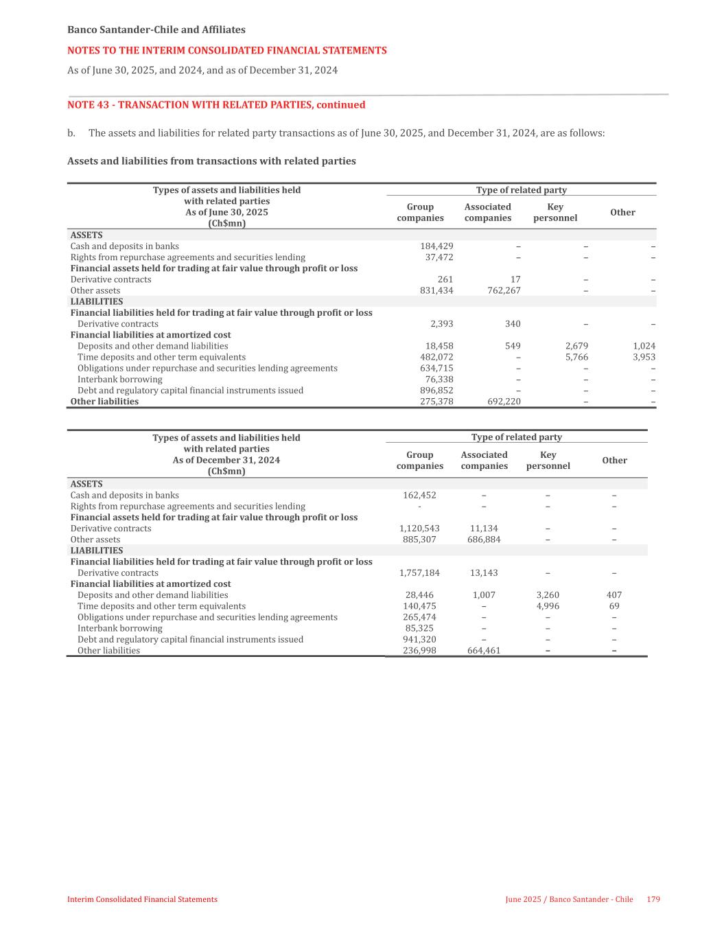 Banco Santander-Chile and Affiliates NOTES TO THE INTERIM CONSOLIDATED FINANCIAL STATEMENTS As of June 30, 2025, and 2024, and as of December 31, 2024 Interim Consolidated Financial Statements June 2025 / Banco Santander - Chile 179 NOTE 43 - TRANSACTION WITH RELATED PARTIES, continued b. The assets and liabilities for related party transactions as of June 30, 2025, and December 31, 2024, are as follows: Assets and liabilities from transactions with related parties Types of assets and liabilities held with related parties As of June 30, 2025 (Ch$mn) Type of related party Group companies Associated companies Key personnel Other ASSETS Cash and deposits in banks 184,429 Rights from repurchase agreements and securities lending 37,472 Financial assets held for trading at fair value through profit or loss Derivative contracts 261 17 Other assets 831,434 762,267 LIABILITIES Financial liabilities held for trading at fair value through profit or loss Derivative contracts 2,393 340 Financial liabilities at amortized cost Deposits and other demand liabilities 18,458 549 2,679 1,024 Time deposits and other term equivalents 482,072 5,766 3,953 Obligations under repurchase and securities lending agreements 634,715 Interbank borrowing 76,338 Debt and regulatory capital financial instruments issued 896,852 Other liabilities 275,378 692,220 Types of assets and liabilities held with related parties As of December 31, 2024 (Ch$mn) Type of related party Group companies Associated companies Key personnel Other ASSETS Cash and deposits in banks 162,452 Rights from repurchase agreements and securities lending - Financial assets held for trading at fair value through profit or loss Derivative contracts 1,120,543 11,134 Other assets 885,307 686,884 LIABILITIES Financial liabilities held for trading at fair value through profit or loss Derivative contracts 1,757,184 13,143 Financial liabilities at amortized cost Deposits and other demand liabilities 28,446 1,007 3,260 407 Time deposits and other term equivalents 140,475 4,996 69 Obligations under repurchase and securities lending agreements 265,474 Interbank borrowing 85,325 Debt and regulatory capital financial instruments issued 941,320 Other liabilities 236,998 664,461