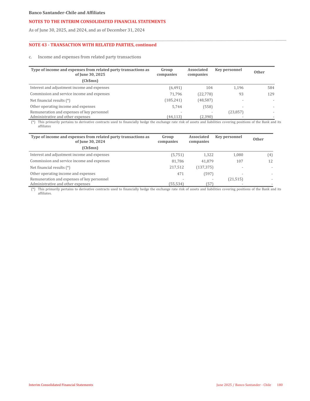 Banco Santander-Chile and Affiliates NOTES TO THE INTERIM CONSOLIDATED FINANCIAL STATEMENTS As of June 30, 2025, and 2024, and as of December 31, 2024 Interim Consolidated Financial Statements June 2025 / Banco Santander - Chile 180 NOTE 43 - TRANSACTION WITH RELATED PARTIES, continued c. Income and expenses from related party transactions Type of income and expenses from related party transactions as of June 30, 2025 Group companies Associated companies Key personnel Other (Ch$mn) Interest and adjustment income and expenses (6,491) 104 1,196 584 Commission and service income and expenses 71,796 (22,778) 93 129 Net financial results (*) (185,241) (48,587) - - Other operating income and expenses 5,744 (558) - - Remuneration and expenses of key personnel - - (23,857) - Administrative and other expenses (44,113) (2,390) - - (*) This primarily pertains to derivative contracts used to financially hedge the exchange rate risk of assets and liabilities covering positions of the Bank and its affiliates Type of income and expenses from related party transactions as of June 30, 2024 Group companies Associated companies Key personnel Other (Ch$mn) Interest and adjustment income and expenses (5,751) 1,322 1,080 (4) Commission and service income and expenses 81,786 41,879 107 12 Net financial results (*) 217,512 (137,375) - - Other operating income and expenses 471 (597) - - Remuneration and expenses of key personnel - - (21,515) - Administrative and other expenses (55,534) (57) - - (*) This primarily pertains to derivative contracts used to financially hedge the exchange rate risk of assets and liabilities covering positions of the Bank and its affiliates.