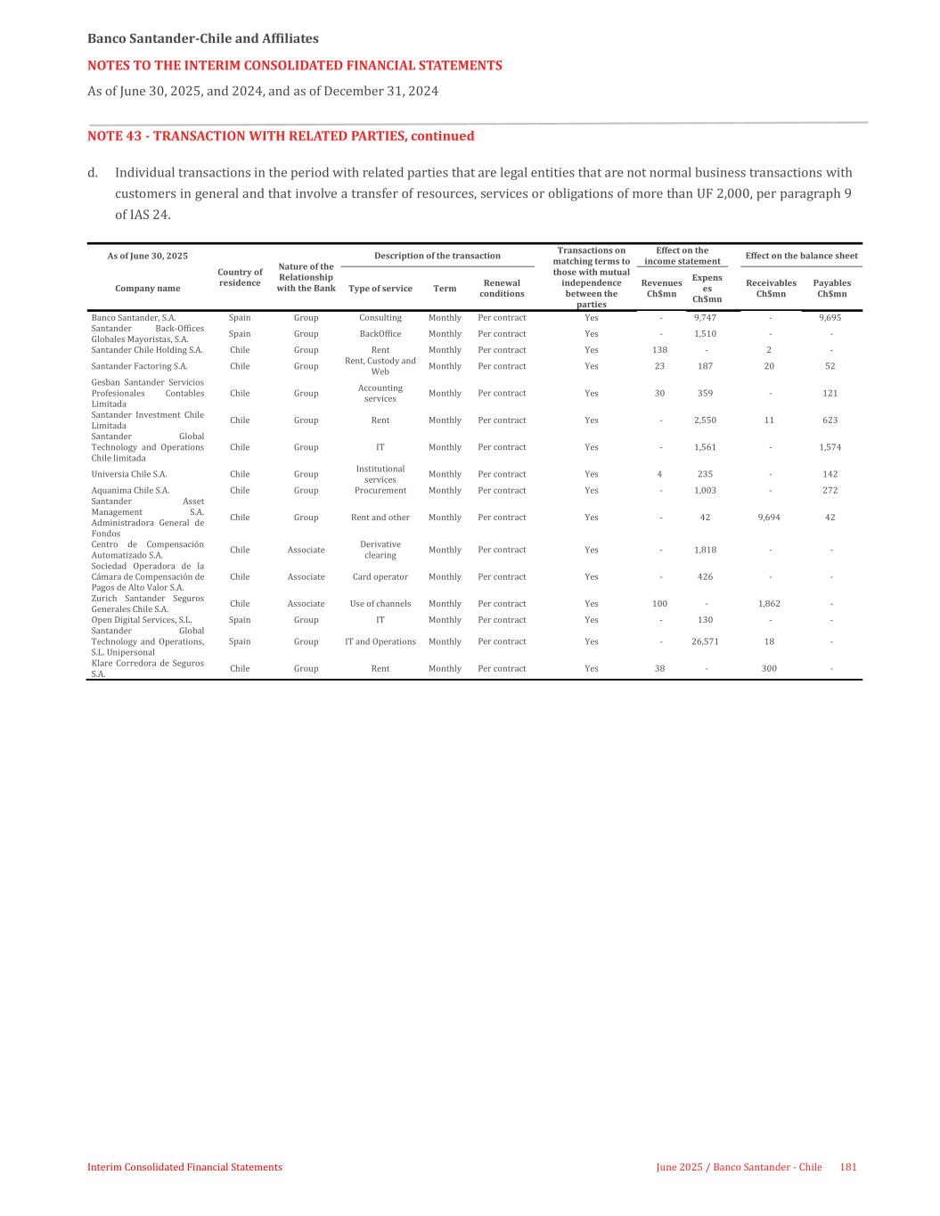Banco Santander-Chile and Affiliates NOTES TO THE INTERIM CONSOLIDATED FINANCIAL STATEMENTS As of June 30, 2025, and 2024, and as of December 31, 2024 Interim Consolidated Financial Statements June 2025 / Banco Santander - Chile 181 NOTE 43 - TRANSACTION WITH RELATED PARTIES, continued d. Individual transactions in the period with related parties that are legal entities that are not normal business transactions with customers in general and that involve a transfer of resources, services or obligations of more than UF 2,000, per paragraph 9 of IAS 24. As of June 30, 2025 Country of residence Nature of the Relationship with the Bank Description of the transaction Transactions on matching terms to those with mutual independence between the parties Effect on the income statement Effect on the balance sheet Company name Type of service Term Renewal conditions Revenues Ch$mn Expens es Ch$mn Receivables Ch$mn Payables Ch$mn Banco Santander, S.A. Spain Group Consulting Monthly Per contract Yes - 9,747 - 9,695 Santander Back-Offices Globales Mayoristas, S.A. Spain Group BackOffice Monthly Per contract Yes - 1,510 - - Santander Chile Holding S.A. Chile Group Rent Monthly Per contract Yes 138 - 2 - Santander Factoring S.A. Chile Group Rent, Custody and Web Monthly Per contract Yes 23 187 20 52 Gesban Santander Servicios Profesionales Contables Limitada Chile Group Accounting services Monthly Per contract Yes 30 359 - 121 Santander Investment Chile Limitada Chile Group Rent Monthly Per contract Yes - 2,550 11 623 Santander Global Technology and Operations Chile limitada Chile Group IT Monthly Per contract Yes - 1,561 - 1,574 Universia Chile S.A. Chile Group Institutional services Monthly Per contract Yes 4 235 - 142 Aquanima Chile S.A. Chile Group Procurement Monthly Per contract Yes - 1,003 - 272 Santander Asset Management S.A. Administradora General de Fondos Chile Group Rent and other Monthly Per contract Yes - 42 9,694 42 Centro de Compensación Automatizado S.A. Chile Associate Derivative clearing Monthly Per contract Yes - 1,818 - - Sociedad Operadora de la Cámara de Compensación de Pagos de Alto Valor S.A. Chile Associate Card operator Monthly Per contract Yes - 426 - - Zurich Santander Seguros Generales Chile S.A. Chile Associate Use of channels Monthly Per contract Yes 100 - 1,862 - Open Digital Services, S.L. Spain Group IT Monthly Per contract Yes - 130 - - Santander Global Technology and Operations, S.L. Unipersonal Spain Group IT and Operations Monthly Per contract Yes - 26,571 18 - Klare Corredora de Seguros S.A. Chile Group Rent Monthly Per contract Yes 38 - 300 -