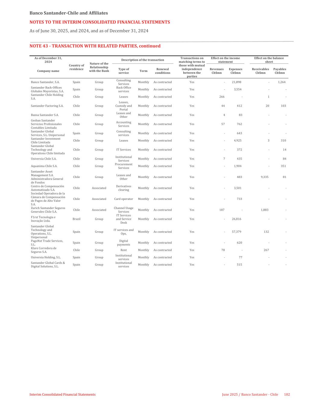 Banco Santander-Chile and Affiliates NOTES TO THE INTERIM CONSOLIDATED FINANCIAL STATEMENTS As of June 30, 2025, and 2024, and as of December 31, 2024 Interim Consolidated Financial Statements June 2025 / Banco Santander - Chile 182 NOTE 43 - TRANSACTION WITH RELATED PARTIES, continued As of December 31, 2024 Country of residence Nature of the Relationship with the Bank Description of the transaction Transactions on matching terms to those with mutual independence between the parties Effect on the income statement Effect on the balance sheet Company name Type of service Term Renewal conditions Revenues Ch$mn Expenses Ch$mn Receivables Ch$mn Payables Ch$mn Banco Santander, S.A. Spain Group Consulting Services Monthly As contracted Yes - 21,898 - 1,264 Santander Back-Offices Globales Mayoristas, S.A. Spain Group Back Office services Monthly As contracted Yes - 3,554 - - Santander Chile Holding S.A. Chile Group Leases Monthly As contracted Yes 266 - 1 - Santander Factoring S.A. Chile Group Leases, Custody and Portal Monthly As contracted Yes 44 412 20 103 Bansa Santander S.A. Chile Group Leases and Other Monthly As contracted Yes 4 83 - - Gesban Santander Servicios Profesionales Contables Limitada Chile Group Accounting Services Monthly As contracted Yes 57 762 - - Santander Global Services, S.L. Unipersonal Spain Group Consulting services Monthly As contracted Yes - 643 - - Santander Investment Chile Limitada Chile Group Leases Monthly As contracted Yes - 4,925 3 310 Santander Global Technology and Operations Chile limitada Chile Group IT Services Monthly As contracted Yes - 372 - 14 Universia Chile S.A. Chile Group Institutional Services Monthly As contracted Yes 7 435 - 84 Aquanima Chile S.A. Chile Group Procurement Services Monthly As contracted Yes - 1,904 - 351 Santander Asset Management S.A. Administradora General de Fondos Chile Group Leases and Other Monthly As contracted Yes - 483 9,335 81 Centro de Compensación Automatizado S.A. Chile Associated Derivatives clearing Monthly As contracted Yes - 3,501 - - Sociedad Operadora de la Cámara de Compensación de Pagos de Alto Valor S.A. Chile Associated Card operator Monthly As contracted Yes - 733 - - Zurich Santander Seguros Generales Chile S.A. Chile Associated Channel Usage Services Monthly As contracted Yes 187 - 1,883 - F1rst Tecnologia e Inovação Ltda. Brazil Group IT Services and Service Desk Monthly As contracted Yes - 26,816 - - Santander Global Technology and Operations, S.L. Unipersonal Spain Group IT services and Ops, Monthly As contracted Yes - 57,379 132 - PagoNxt Trade Services, S.L. Spain Group Digital payments Monthly As contracted Yes - 620 - - Klare Corredora de Seguros S.A. Chile Group Rent Monthly As contracted Yes 78 - 267 - Universia Holding, S.L. Spain Group Institutional services Monthly As contracted Yes - 77 - - Santander Global Cards & Digital Solutions, S.L. Spain Group Institutional services Monthly As contracted Yes - 515 - -