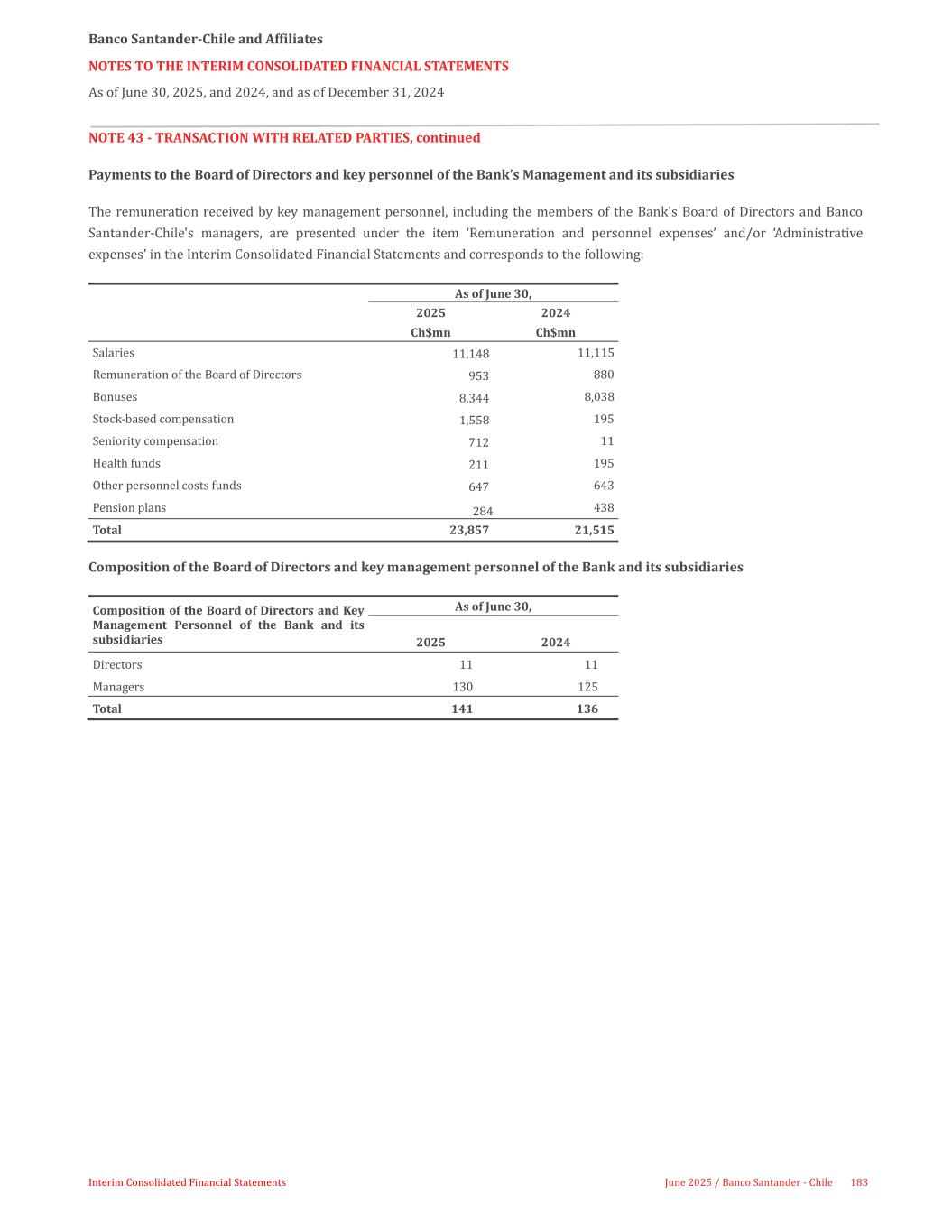 Banco Santander-Chile and Affiliates NOTES TO THE INTERIM CONSOLIDATED FINANCIAL STATEMENTS As of June 30, 2025, and 2024, and as of December 31, 2024 Interim Consolidated Financial Statements June 2025 / Banco Santander - Chile 183 NOTE 43 - TRANSACTION WITH RELATED PARTIES, continued The remuneration received by key management personnel, including the members of the Bank's Board of Directors and Banco Santander- nterim Consolidated Financial Statements and corresponds to the following: As of June 30, 2025 2024 Ch$mn Ch$mn Salaries 11,148 11,115 Remuneration of the Board of Directors 953 880 Bonuses 8,344 8,038 Stock-based compensation 1,558 195 Seniority compensation 712 11 Health funds 211 195 Other personnel costs funds 647 643 Pension plans 284 438 Total 23,857 21,515 Composition of the Board of Directors and key management personnel of the Bank and its subsidiaries Composition of the Board of Directors and Key Management Personnel of the Bank and its subsidiaries As of June 30, 2025 2024 Directors 11 11 Managers 130 125 Total 141 136