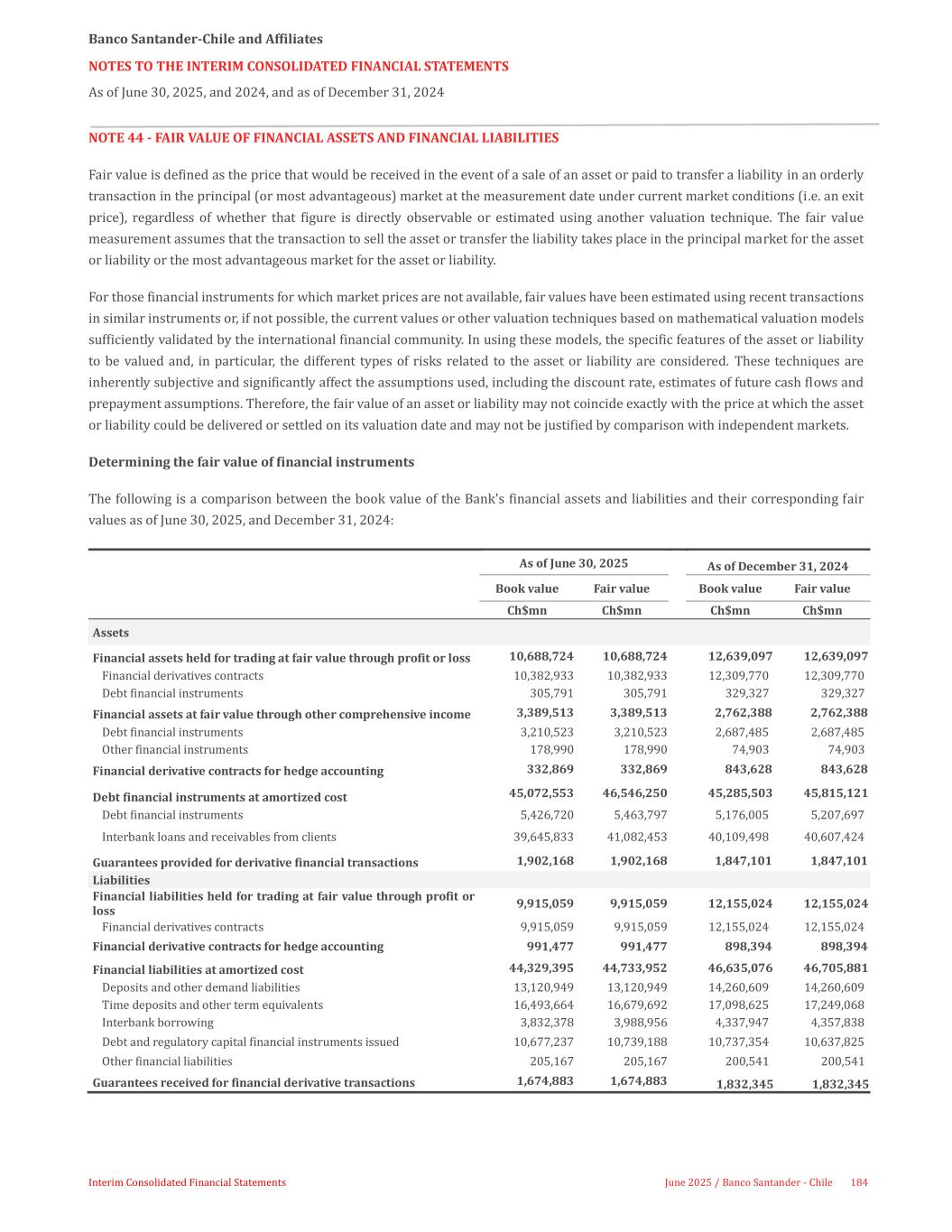 Banco Santander-Chile and Affiliates NOTES TO THE INTERIM CONSOLIDATED FINANCIAL STATEMENTS As of June 30, 2025, and 2024, and as of December 31, 2024 Interim Consolidated Financial Statements June 2025 / Banco Santander - Chile 184 NOTE 44 - FAIR VALUE OF FINANCIAL ASSETS AND FINANCIAL LIABILITIES Fair value is defined as the price that would be received in the event of a sale of an asset or paid to transfer a liability in an orderly transaction in the principal (or most advantageous) market at the measurement date under current market conditions (i.e. an exit price), regardless of whether that figure is directly observable or estimated using another valuation technique. The fair value measurement assumes that the transaction to sell the asset or transfer the liability takes place in the principal market for the asset or liability or the most advantageous market for the asset or liability. For those financial instruments for which market prices are not available, fair values have been estimated using recent transactions in similar instruments or, if not possible, the current values or other valuation techniques based on mathematical valuation models sufficiently validated by the international financial community. In using these models, the specific features of the asset or liability to be valued and, in particular, the different types of risks related to the asset or liability are considered. These techniques are inherently subjective and significantly affect the assumptions used, including the discount rate, estimates of future cash flows and prepayment assumptions. Therefore, the fair value of an asset or liability may not coincide exactly with the price at which the asset or liability could be delivered or settled on its valuation date and may not be justified by comparison with independent markets. Determining the fair value of financial instruments The following is a comparison between the book value of the Bank's financial assets and liabilities and their corresponding fair values as of June 30, 2025, and December 31, 2024: As of June 30, 2025 As of December 31, 2024 Book value Fair value Book value Fair value Ch$mn Ch$mn Ch$mn Ch$mn Assets Financial assets held for trading at fair value through profit or loss 10,688,724 10,688,724 12,639,097 12,639,097 Financial derivatives contracts 10,382,933 10,382,933 12,309,770 12,309,770 Debt financial instruments 305,791 305,791 329,327 329,327 Financial assets at fair value through other comprehensive income 3,389,513 3,389,513 2,762,388 2,762,388 Debt financial instruments 3,210,523 3,210,523 2,687,485 2,687,485 Other financial instruments 178,990 178,990 74,903 74,903 Financial derivative contracts for hedge accounting 332,869 332,869 843,628 843,628 Debt financial instruments at amortized cost 45,072,553 46,546,250 45,285,503 45,815,121 Debt financial instruments 5,426,720 5,463,797 5,176,005 5,207,697 Interbank loans and receivables from clients 39,645,833 41,082,453 40,109,498 40,607,424 Guarantees provided for derivative financial transactions 1,902,168 1,902,168 1,847,101 1,847,101 Liabilities Financial liabilities held for trading at fair value through profit or loss 9,915,059 9,915,059 12,155,024 12,155,024 Financial derivatives contracts 9,915,059 9,915,059 12,155,024 12,155,024 Financial derivative contracts for hedge accounting 991,477 991,477 898,394 898,394 Financial liabilities at amortized cost 44,329,395 44,733,952 46,635,076 46,705,881 Deposits and other demand liabilities 13,120,949 13,120,949 14,260,609 14,260,609 Time deposits and other term equivalents 16,493,664 16,679,692 17,098,625 17,249,068 Interbank borrowing 3,832,378 3,988,956 4,337,947 4,357,838 Debt and regulatory capital financial instruments issued 10,677,237 10,739,188 10,737,354 10,637,825 Other financial liabilities 205,167 205,167 200,541 200,541 Guarantees received for financial derivative transactions 1,674,883 1,674,883 1,832,345 1,832,345
