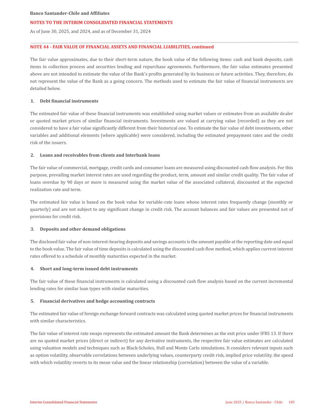 Banco Santander-Chile and Affiliates NOTES TO THE INTERIM CONSOLIDATED FINANCIAL STATEMENTS As of June 30, 2025, and 2024, and as of December 31, 2024 Interim Consolidated Financial Statements June 2025 / Banco Santander - Chile 185 NOTE 44 - FAIR VALUE OF FINANCIAL ASSETS AND FINANCIAL LIABILITIES, continued The fair value approximates, due to their short-term nature, the book value of the following items: cash and bank deposits, cash items in collection process and securities lending and repurchase agreements. Furthermore, the fair value estimates presented above are not intended to estimate the value of the Bank's profits generated by its business or future activities. They, therefore, do not represent the value of the Bank as a going concern. The methods used to estimate the fair value of financial instruments are detailed below. 1. Debt financial instruments The estimated fair value of these financial instruments was established using market values or estimates from an available dealer or quoted market prices of similar financial instruments. Investments are valued at carrying value (recorded) as they are not considered to have a fair value significantly different from their historical one. To estimate the fair value of debt investments, other variables and additional elements (where applicable) were considered, including the estimated prepayment rates and the credit risk of the issuers. 2. Loans and receivables from clients and Interbank loans The fair value of commercial, mortgage, credit cards and consumer loans are measured using discounted cash flow analysis. For this purpose, prevailing market interest rates are used regarding the product, term, amount and similar credit quality. The fair value of loans overdue by 90 days or more is measured using the market value of the associated collateral, discounted at the expected realization rate and term. The estimated fair value is based on the book value for variable-rate loans whose interest rates frequently change (monthly or quarterly) and are not subject to any significant change in credit risk. The account balances and fair values are presented net of provisions for credit risk. 3. Deposits and other demand obligations The disclosed fair value of non-interest-bearing deposits and savings accounts is the amount payable at the reporting date and equal to the book value. The fair value of time deposits is calculated using the discounted cash flow method, which applies current interest rates offered to a schedule of monthly maturities expected in the market. 4. Short and long-term issued debt instruments The fair value of these financial instruments is calculated using a discounted cash flow analysis based on the current incremental lending rates for similar loan types with similar maturities. 5. Financial derivatives and hedge accounting contracts The estimated fair value of foreign exchange forward contracts was calculated using quoted market prices for financial instruments with similar characteristics. The fair value of interest rate swaps represents the estimated amount the Bank determines as the exit price under IFRS 13. If there are no quoted market prices (direct or indirect) for any derivative instruments, the respective fair value estimates are calculated using valuation models and techniques such as Black-Scholes, Hull and Monte Carlo simulations. It considers relevant inputs such as option volatility, observable correlations between underlying values, counterparty credit risk, implied price volatility, the speed with which volatility reverts to its mean value and the linear relationship (correlation) between the value of a variable.