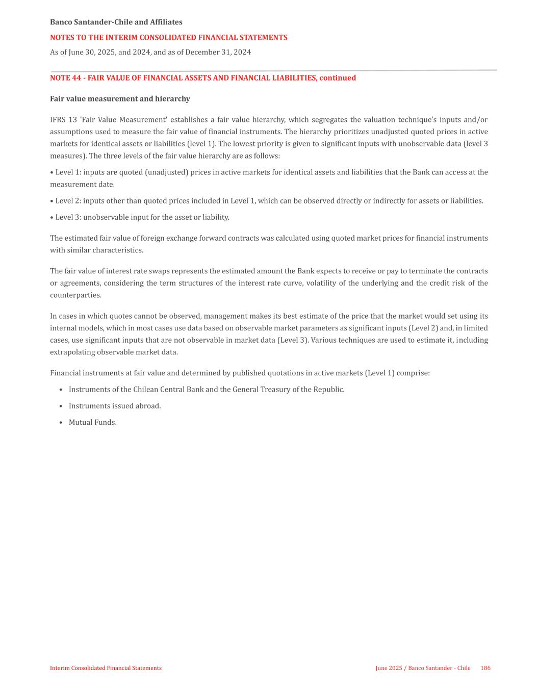 Banco Santander-Chile and Affiliates NOTES TO THE INTERIM CONSOLIDATED FINANCIAL STATEMENTS As of June 30, 2025, and 2024, and as of December 31, 2024 Interim Consolidated Financial Statements June 2025 / Banco Santander - Chile 186 NOTE 44 - FAIR VALUE OF FINANCIAL ASSETS AND FINANCIAL LIABILITIES, continued Fair value measurement and hierarchy IFRS 13 'Fair Value Measurement' establishes a fair value hierarchy, which segregates the valuation technique's inputs and/or assumptions used to measure the fair value of financial instruments. The hierarchy prioritizes unadjusted quoted prices in active markets for identical assets or liabilities (level 1). The lowest priority is given to significant inputs with unobservable data (level 3 measures). The three levels of the fair value hierarchy are as follows: ess at the measurement date. abilities. The estimated fair value of foreign exchange forward contracts was calculated using quoted market prices for financial instruments with similar characteristics. The fair value of interest rate swaps represents the estimated amount the Bank expects to receive or pay to terminate the contracts or agreements, considering the term structures of the interest rate curve, volatility of the underlying and the credit risk of the counterparties. In cases in which quotes cannot be observed, management makes its best estimate of the price that the market would set using its internal models, which in most cases use data based on observable market parameters as significant inputs (Level 2) and, in limited cases, use significant inputs that are not observable in market data (Level 3). Various techniques are used to estimate it, including extrapolating observable market data. Financial instruments at fair value and determined by published quotations in active markets (Level 1) comprise: Instruments of the Chilean Central Bank and the General Treasury of the Republic. Instruments issued abroad. Mutual Funds.
