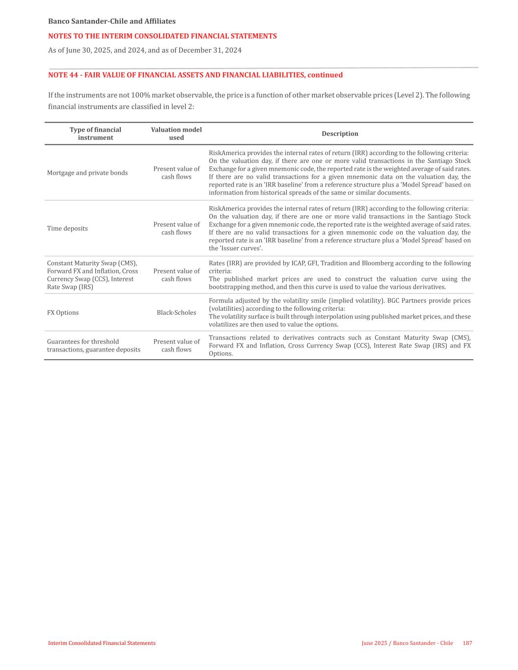 Banco Santander-Chile and Affiliates NOTES TO THE INTERIM CONSOLIDATED FINANCIAL STATEMENTS As of June 30, 2025, and 2024, and as of December 31, 2024 Interim Consolidated Financial Statements June 2025 / Banco Santander - Chile 187 NOTE 44 - FAIR VALUE OF FINANCIAL ASSETS AND FINANCIAL LIABILITIES, continued If the instruments are not 100% market observable, the price is a function of other market observable prices (Level 2). The following financial instruments are classified in level 2: Type of financial instrument Valuation model used Description Mortgage and private bonds Present value of cash flows RiskAmerica provides the internal rates of return (IRR) according to the following criteria: On the valuation day, if there are one or more valid transactions in the Santiago Stock Exchange for a given mnemonic code, the reported rate is the weighted average of said rates. If there are no valid transactions for a given mnemonic data on the valuation day, the reported rate is an 'IRR baseline' from a reference structure plus a 'Model Spread' based on information from historical spreads of the same or similar documents. Time deposits Present value of cash flows RiskAmerica provides the internal rates of return (IRR) according to the following criteria: On the valuation day, if there are one or more valid transactions in the Santiago Stock Exchange for a given mnemonic code, the reported rate is the weighted average of said rates. If there are no valid transactions for a given mnemonic code on the valuation day, the reported rate is an 'IRR baseline' from a reference structure plus a 'Model Spread' based on the 'Issuer curves'. Constant Maturity Swap (CMS), Forward FX and Inflation, Cross Currency Swap (CCS), Interest Rate Swap (IRS) Present value of cash flows Rates (IRR) are provided by ICAP, GFI, Tradition and Bloomberg according to the following criteria: The published market prices are used to construct the valuation curve using the bootstrapping method, and then this curve is used to value the various derivatives. FX Options Black-Scholes Formula adjusted by the volatility smile (implied volatility). BGC Partners provide prices (volatilities) according to the following criteria: The volatility surface is built through interpolation using published market prices, and these volatilizes are then used to value the options. Guarantees for threshold transactions, guarantee deposits Present value of cash flows Transactions related to derivatives contracts such as Constant Maturity Swap (CMS), Forward FX and Inflation, Cross Currency Swap (CCS), Interest Rate Swap (IRS) and FX Options.