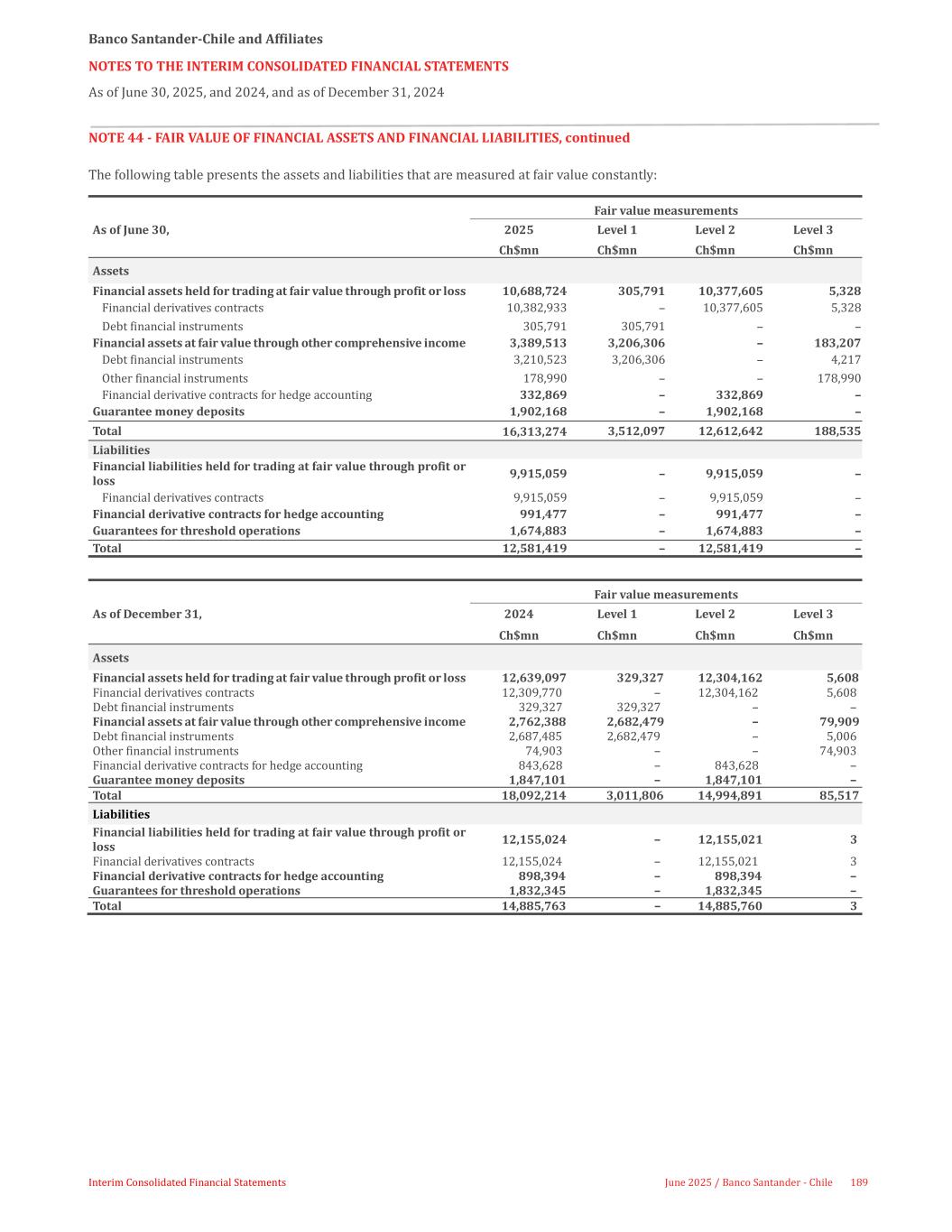 Banco Santander-Chile and Affiliates NOTES TO THE INTERIM CONSOLIDATED FINANCIAL STATEMENTS As of June 30, 2025, and 2024, and as of December 31, 2024 Interim Consolidated Financial Statements June 2025 / Banco Santander - Chile 189 NOTE 44 - FAIR VALUE OF FINANCIAL ASSETS AND FINANCIAL LIABILITIES, continued The following table presents the assets and liabilities that are measured at fair value constantly: Fair value measurements As of June 30, 2025 Level 1 Level 2 Level 3 Ch$mn Ch$mn Ch$mn Ch$mn Assets Financial assets held for trading at fair value through profit or loss 10,688,724 305,791 10,377,605 5,328 Financial derivatives contracts 10,382,933 10,377,605 5,328 Debt financial instruments 305,791 305,791 Financial assets at fair value through other comprehensive income 3,389,513 3,206,306 183,207 Debt financial instruments 3,210,523 3,206,306 4,217 Other financial instruments 178,990 178,990 Financial derivative contracts for hedge accounting 332,869 332,869 Guarantee money deposits 1,902,168 1,902,168 Total 16,313,274 3,512,097 12,612,642 188,535 Liabilities Financial liabilities held for trading at fair value through profit or loss 9,915,059 9,915,059 Financial derivatives contracts 9,915,059 9,915,059 Financial derivative contracts for hedge accounting 991,477 991,477 Guarantees for threshold operations 1,674,883 1,674,883 Total 12,581,419 12,581,419 Fair value measurements As of December 31, 2024 Level 1 Level 2 Level 3 Ch$mn Ch$mn Ch$mn Ch$mn Assets Financial assets held for trading at fair value through profit or loss 12,639,097 329,327 12,304,162 5,608 Financial derivatives contracts 12,309,770 12,304,162 5,608 Debt financial instruments 329,327 329,327 Financial assets at fair value through other comprehensive income 2,762,388 2,682,479 79,909 Debt financial instruments 2,687,485 2,682,479 5,006 Other financial instruments 74,903 74,903 Financial derivative contracts for hedge accounting 843,628 843,628 Guarantee money deposits 1,847,101 1,847,101 Total 18,092,214 3,011,806 14,994,891 85,517 Liabilities Financial liabilities held for trading at fair value through profit or loss 12,155,024 12,155,021 3 Financial derivatives contracts 12,155,024 12,155,021 3 Financial derivative contracts for hedge accounting 898,394 898,394 Guarantees for threshold operations 1,832,345 1,832,345 Total 14,885,763 14,885,760 3