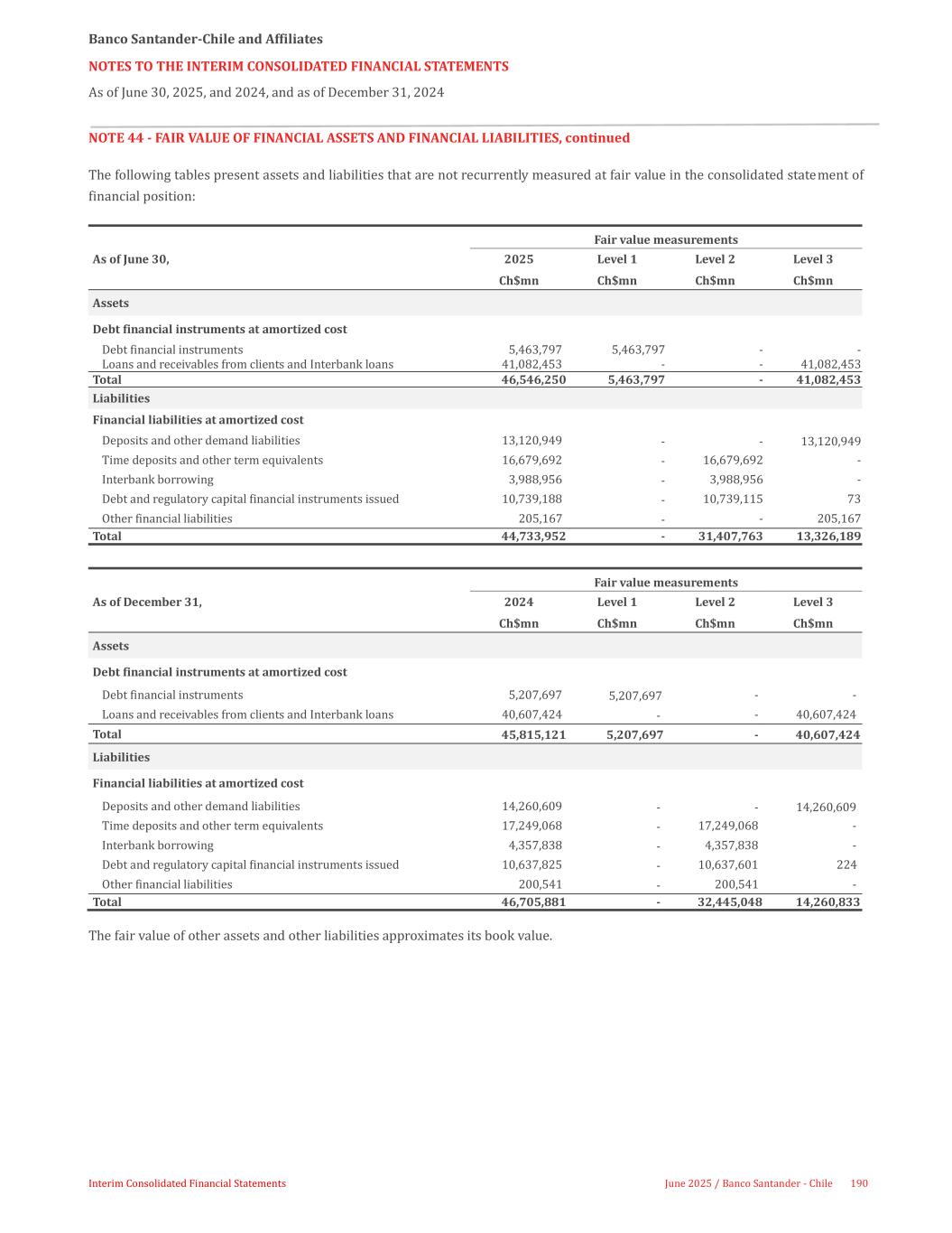 Banco Santander-Chile and Affiliates NOTES TO THE INTERIM CONSOLIDATED FINANCIAL STATEMENTS As of June 30, 2025, and 2024, and as of December 31, 2024 Interim Consolidated Financial Statements June 2025 / Banco Santander - Chile 190 NOTE 44 - FAIR VALUE OF FINANCIAL ASSETS AND FINANCIAL LIABILITIES, continued The following tables present assets and liabilities that are not recurrently measured at fair value in the consolidated statement of financial position: Fair value measurements As of June 30, 2025 Level 1 Level 2 Level 3 Ch$mn Ch$mn Ch$mn Ch$mn Assets Debt financial instruments at amortized cost Debt financial instruments 5,463,797 5,463,797 - - Loans and receivables from clients and Interbank loans 41,082,453 - - 41,082,453 Total 46,546,250 5,463,797 - 41,082,453 Liabilities Financial liabilities at amortized cost Deposits and other demand liabilities 13,120,949 - - 13,120,949 Time deposits and other term equivalents 16,679,692 - 16,679,692 - Interbank borrowing 3,988,956 - 3,988,956 - Debt and regulatory capital financial instruments issued 10,739,188 - 10,739,115 73 Other financial liabilities 205,167 - - 205,167 Total 44,733,952 - 31,407,763 13,326,189 Fair value measurements As of December 31, 2024 Level 1 Level 2 Level 3 Ch$mn Ch$mn Ch$mn Ch$mn Assets Debt financial instruments at amortized cost Debt financial instruments 5,207,697 5,207,697 - - Loans and receivables from clients and Interbank loans 40,607,424 - - 40,607,424 Total 45,815,121 5,207,697 - 40,607,424 Liabilities Financial liabilities at amortized cost Deposits and other demand liabilities 14,260,609 - - 14,260,609 Time deposits and other term equivalents 17,249,068 - 17,249,068 - Interbank borrowing 4,357,838 - 4,357,838 - Debt and regulatory capital financial instruments issued 10,637,825 - 10,637,601 224 Other financial liabilities 200,541 - 200,541 - Total 46,705,881 - 32,445,048 14,260,833 The fair value of other assets and other liabilities approximates its book value.