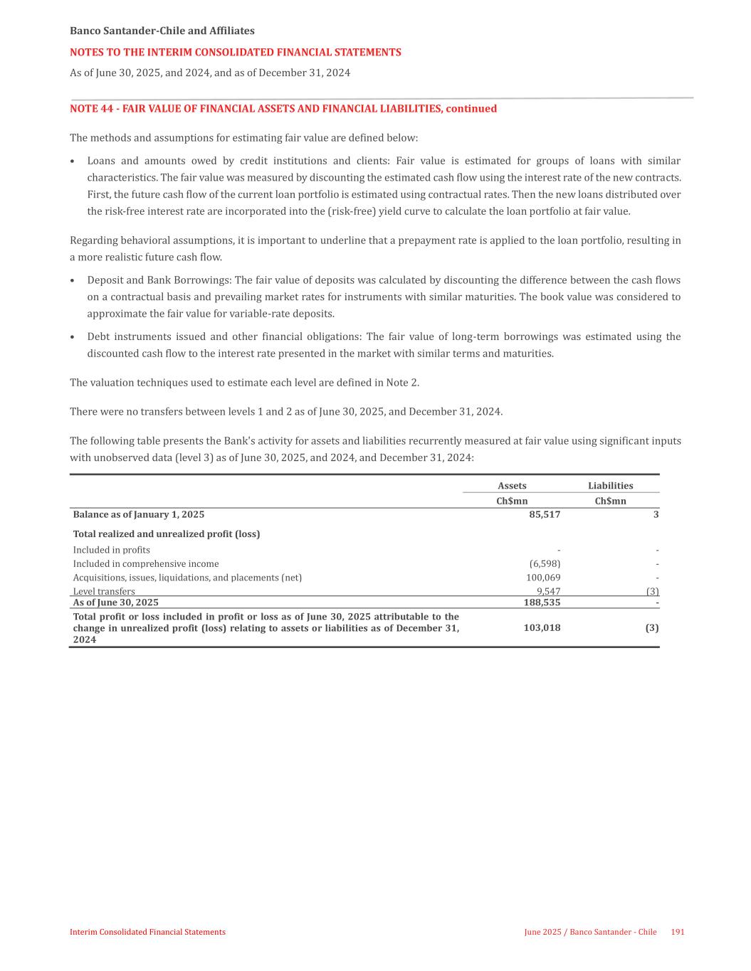 Banco Santander-Chile and Affiliates NOTES TO THE INTERIM CONSOLIDATED FINANCIAL STATEMENTS As of June 30, 2025, and 2024, and as of December 31, 2024 Interim Consolidated Financial Statements June 2025 / Banco Santander - Chile 191 NOTE 44 - FAIR VALUE OF FINANCIAL ASSETS AND FINANCIAL LIABILITIES, continued The methods and assumptions for estimating fair value are defined below: Loans and amounts owed by credit institutions and clients: Fair value is estimated for groups of loans with similar characteristics. The fair value was measured by discounting the estimated cash flow using the interest rate of the new contracts. First, the future cash flow of the current loan portfolio is estimated using contractual rates. Then the new loans distributed over the risk-free interest rate are incorporated into the (risk-free) yield curve to calculate the loan portfolio at fair value. Regarding behavioral assumptions, it is important to underline that a prepayment rate is applied to the loan portfolio, resulting in a more realistic future cash flow. Deposit and Bank Borrowings: The fair value of deposits was calculated by discounting the difference between the cash flows on a contractual basis and prevailing market rates for instruments with similar maturities. The book value was considered to approximate the fair value for variable-rate deposits. Debt instruments issued and other financial obligations: The fair value of long-term borrowings was estimated using the discounted cash flow to the interest rate presented in the market with similar terms and maturities. The valuation techniques used to estimate each level are defined in Note 2. There were no transfers between levels 1 and 2 as of June 30, 2025, and December 31, 2024. The following table presents the Bank's activity for assets and liabilities recurrently measured at fair value using significant inputs with unobserved data (level 3) as of June 30, 2025, and 2024, and December 31, 2024: Assets Liabilities Ch$mn Ch$mn Balance as of January 1, 2025 85,517 3 Total realized and unrealized profit (loss) Included in profits - - Included in comprehensive income (6,598) - Acquisitions, issues, liquidations, and placements (net) 100,069 - Level transfers 9,547 (3) As of June 30, 2025 188,535 - Total profit or loss included in profit or loss as of June 30, 2025 attributable to the change in unrealized profit (loss) relating to assets or liabilities as of December 31, 2024 103,018 (3)