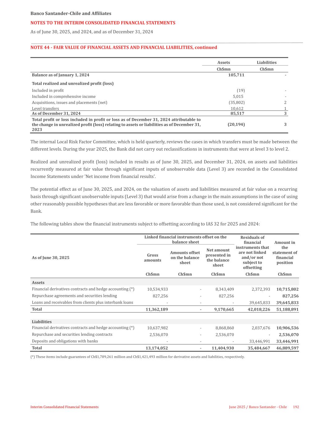 Banco Santander-Chile and Affiliates NOTES TO THE INTERIM CONSOLIDATED FINANCIAL STATEMENTS As of June 30, 2025, and 2024, and as of December 31, 2024 Interim Consolidated Financial Statements June 2025 / Banco Santander - Chile 192 NOTE 44 - FAIR VALUE OF FINANCIAL ASSETS AND FINANCIAL LIABILITIES, continued Assets Liabilities Ch$mn Ch$mn Balance as of January 1, 2024 105,711 - Total realized and unrealized profit (loss) Included in profit (19) - Included in comprehensive income 5,015 - Acquisitions, issues and placements (net) (35,802) 2 Level transfers 10,612 1 As of December 31, 2024 85,517 3 Total profit or loss included in profit or loss as of December 31, 2024 attributable to the change in unrealized profit (loss) relating to assets or liabilities as of December 31, 2023 (20,194) 3 The internal Local Risk Factor Committee, which is held quarterly, reviews the cases in which transfers must be made between the different levels. During the year 2025, the Bank did not carry out reclassifications in instruments that were at level 3 to level 2. Realized and unrealized profit (loss) included in results as of June 30, 2025, and December 31, 2024, on assets and liabilities recurrently measured at fair value through significant inputs of unobservable data (Level 3) are recorded in the Consolidated Income Statements under 'Net income from financial results'. The potential effect as of June 30, 2025, and 2024, on the valuation of assets and liabilities measured at fair value on a recurring basis through significant unobservable inputs (Level 3) that would arise from a change in the main assumptions in the case of using other reasonably possible hypotheses that are less favorable or more favorable than those used, is not considered significant for the Bank. The following tables show the financial instruments subject to offsetting according to IAS 32 for 2025 and 2024: Linked financial instruments offset on the balance sheet Residuals of financial instruments that are not linked and/or not subject to offsetting Amount in the statement of financial position As of June 30, 2025 Gross amounts Amounts offset on the balance sheet Net amount presented in the balance sheet Ch$mn Ch$mn Ch$mn Ch$mn Ch$mn Assets Financial derivatives contracts and hedge accounting (*) 10,534,933 - 8,343,409 2,372,393 10,715,802 Repurchase agreements and securities lending 827,256 - 827,256 - 827,256 Loans and receivables from clients plus interbank loans - - - 39,645,833 39,645,833 Total 11,362,189 - 9,170,665 42,018,226 51,188,891 Liabilities Financial derivatives contracts and hedge accounting (*) 10,637,982 - 8,868,860 2,037,676 10,906,536 Repurchase and securities lending contracts 2,536,070 - 2,536,070 - 2,536,070 Deposits and obligations with banks - - - 33,446,991 33,446,991 Total 13,174,052 - 11,404,930 35,484,667 46,889,597 (*) These items include guarantees of Ch$1,789,261 million and Ch$1,421,493 million for derivative assets and liabilities, respectively.