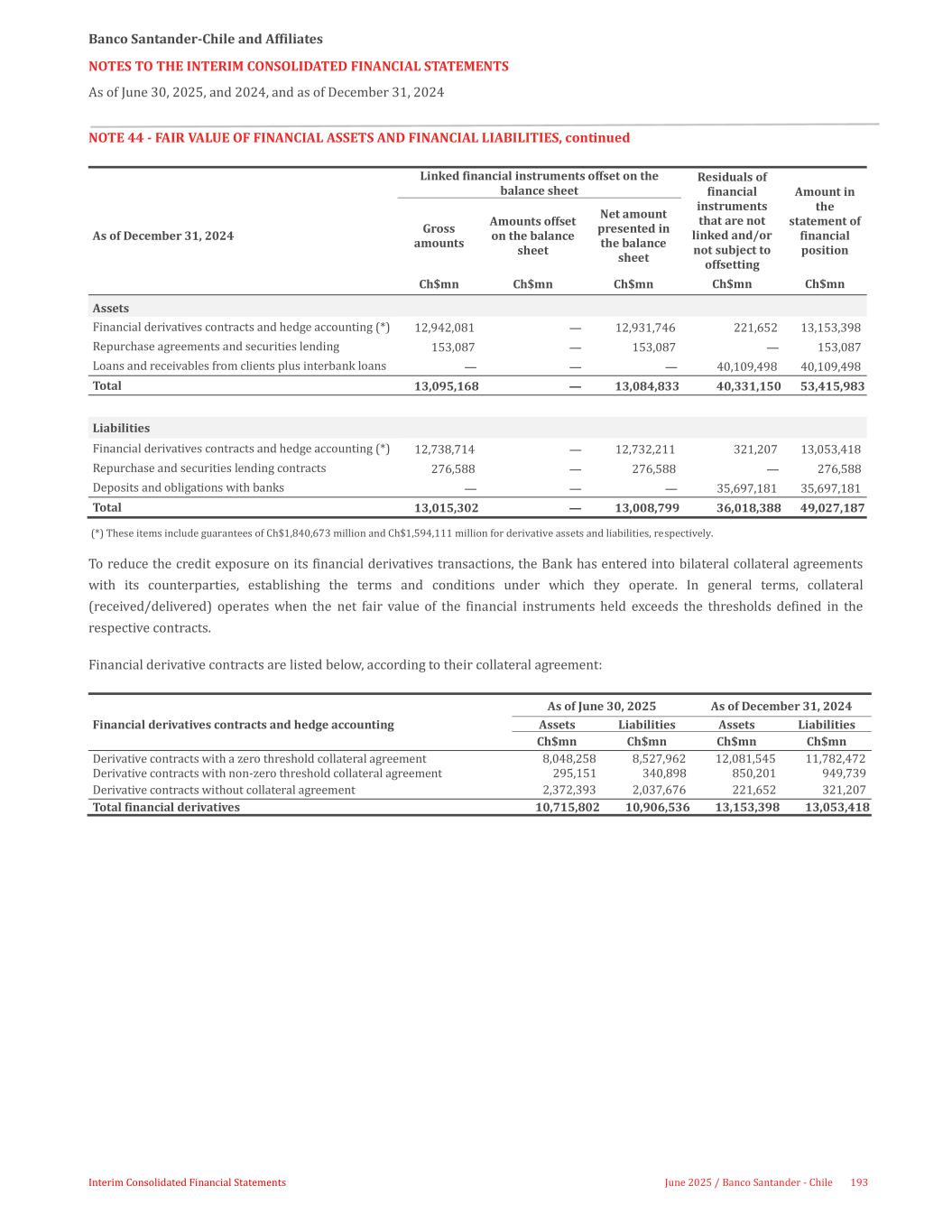 Banco Santander-Chile and Affiliates NOTES TO THE INTERIM CONSOLIDATED FINANCIAL STATEMENTS As of June 30, 2025, and 2024, and as of December 31, 2024 Interim Consolidated Financial Statements June 2025 / Banco Santander - Chile 193 NOTE 44 - FAIR VALUE OF FINANCIAL ASSETS AND FINANCIAL LIABILITIES, continued Linked financial instruments offset on the balance sheet Residuals of financial instruments that are not linked and/or not subject to offsetting Amount in the statement of financial position As of December 31, 2024 Gross amounts Amounts offset on the balance sheet Net amount presented in the balance sheet Ch$mn Ch$mn Ch$mn Ch$mn Ch$mn Assets Financial derivatives contracts and hedge accounting (*) 12,942,081 12,931,746 221,652 13,153,398 Repurchase agreements and securities lending 153,087 153,087 153,087 Loans and receivables from clients plus interbank loans 40,109,498 40,109,498 Total 13,095,168 13,084,833 40,331,150 53,415,983 Liabilities Financial derivatives contracts and hedge accounting (*) 12,738,714 12,732,211 321,207 13,053,418 Repurchase and securities lending contracts 276,588 276,588 276,588 Deposits and obligations with banks 35,697,181 35,697,181 Total 13,015,302 13,008,799 36,018,388 49,027,187 (*) These items include guarantees of Ch$1,840,673 million and Ch$1,594,111 million for derivative assets and liabilities, respectively. To reduce the credit exposure on its financial derivatives transactions, the Bank has entered into bilateral collateral agreements with its counterparties, establishing the terms and conditions under which they operate. In general terms, collateral (received/delivered) operates when the net fair value of the financial instruments held exceeds the thresholds defined in the respective contracts. Financial derivative contracts are listed below, according to their collateral agreement: As of June 30, 2025 As of December 31, 2024 Financial derivatives contracts and hedge accounting Assets Liabilities Assets Liabilities Ch$mn Ch$mn Ch$mn Ch$mn Derivative contracts with a zero threshold collateral agreement 8,048,258 8,527,962 12,081,545 11,782,472 Derivative contracts with non-zero threshold collateral agreement 295,151 340,898 850,201 949,739 Derivative contracts without collateral agreement 2,372,393 2,037,676 221,652 321,207 Total financial derivatives 10,715,802 10,906,536 13,153,398 13,053,418