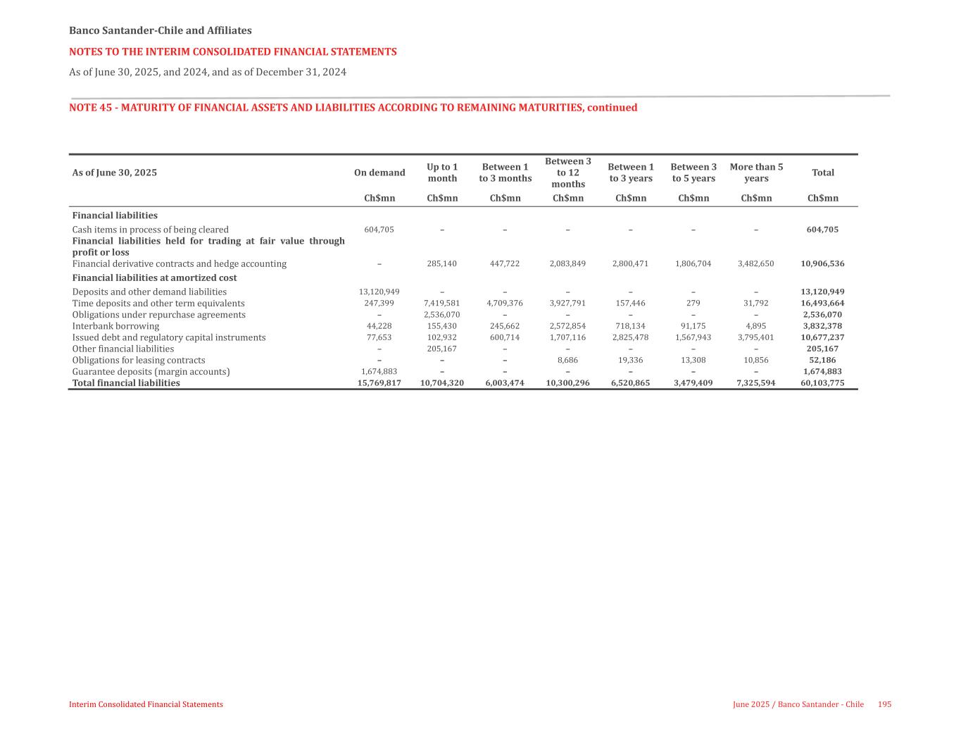 Banco Santander-Chile and Affiliates NOTES TO THE INTERIM CONSOLIDATED FINANCIAL STATEMENTS As of June 30, 2025, and 2024, and as of December 31, 2024 Interim Consolidated Financial Statements June 2025 / Banco Santander - Chile 195 NOTE 45 - MATURITY OF FINANCIAL ASSETS AND LIABILITIES ACCORDING TO REMAINING MATURITIES, continued As of June 30, 2025 On demand Up to 1 month Between 1 to 3 months Between 3 to 12 months Between 1 to 3 years Between 3 to 5 years More than 5 years Total Ch$mn Ch$mn Ch$mn Ch$mn Ch$mn Ch$mn Ch$mn Ch$mn Financial liabilities Cash items in process of being cleared 604,705 604,705 Financial liabilities held for trading at fair value through profit or loss Financial derivative contracts and hedge accounting 285,140 447,722 2,083,849 2,800,471 1,806,704 3,482,650 10,906,536 Financial liabilities at amortized cost Deposits and other demand liabilities 13,120,949 13,120,949 Time deposits and other term equivalents 247,399 7,419,581 4,709,376 3,927,791 157,446 279 31,792 16,493,664 Obligations under repurchase agreements 2,536,070 2,536,070 Interbank borrowing 44,228 155,430 245,662 2,572,854 718,134 91,175 4,895 3,832,378 Issued debt and regulatory capital instruments 77,653 102,932 600,714 1,707,116 2,825,478 1,567,943 3,795,401 10,677,237 Other financial liabilities 205,167 205,167 Obligations for leasing contracts 8,686 19,336 13,308 10,856 52,186 Guarantee deposits (margin accounts) 1,674,883 1,674,883 Total financial liabilities 15,769,817 10,704,320 6,003,474 10,300,296 6,520,865 3,479,409 7,325,594 60,103,775