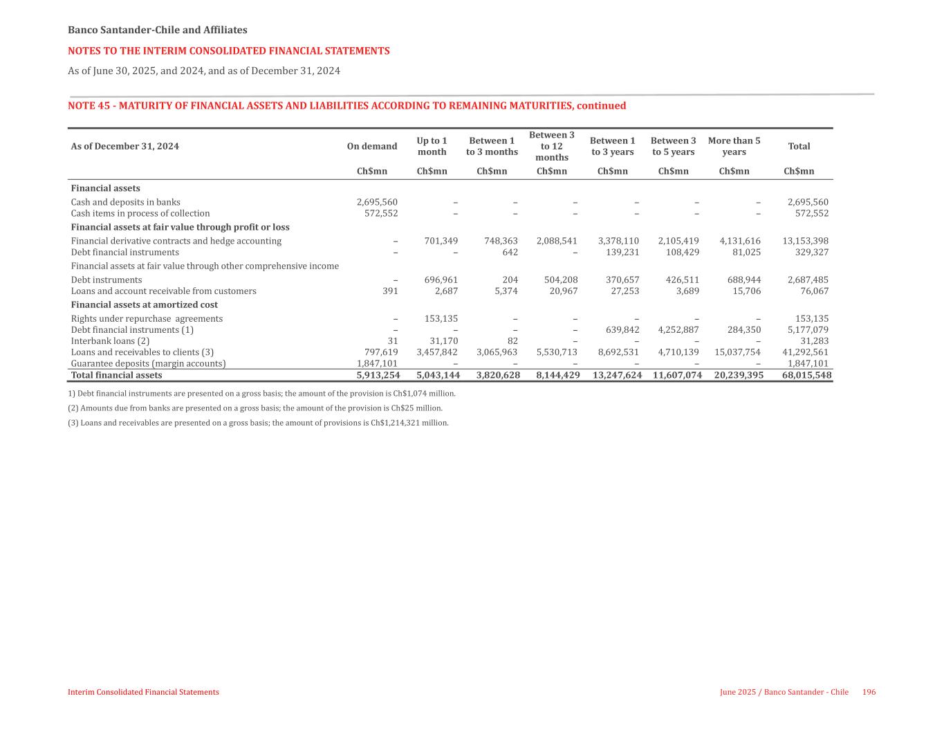 Banco Santander-Chile and Affiliates NOTES TO THE INTERIM CONSOLIDATED FINANCIAL STATEMENTS As of June 30, 2025, and 2024, and as of December 31, 2024 Interim Consolidated Financial Statements June 2025 / Banco Santander - Chile 196 NOTE 45 - MATURITY OF FINANCIAL ASSETS AND LIABILITIES ACCORDING TO REMAINING MATURITIES, continued As of December 31, 2024 On demand Up to 1 month Between 1 to 3 months Between 3 to 12 months Between 1 to 3 years Between 3 to 5 years More than 5 years Total Ch$mn Ch$mn Ch$mn Ch$mn Ch$mn Ch$mn Ch$mn Ch$mn Financial assets Cash and deposits in banks 2,695,560 2,695,560 Cash items in process of collection 572,552 572,552 Financial assets at fair value through profit or loss Financial derivative contracts and hedge accounting 701,349 748,363 2,088,541 3,378,110 2,105,419 4,131,616 13,153,398 Debt financial instruments 642 139,231 108,429 81,025 329,327 Financial assets at fair value through other comprehensive income Debt instruments 696,961 204 504,208 370,657 426,511 688,944 2,687,485 Loans and account receivable from customers 391 2,687 5,374 20,967 27,253 3,689 15,706 76,067 Financial assets at amortized cost Rights under repurchase agreements 153,135 153,135 Debt financial instruments (1) 639,842 4,252,887 284,350 5,177,079 Interbank loans (2) 31 31,170 82 31,283 Loans and receivables to clients (3) 797,619 3,457,842 3,065,963 5,530,713 8,692,531 4,710,139 15,037,754 41,292,561 Guarantee deposits (margin accounts) 1,847,101 1,847,101 Total financial assets 5,913,254 5,043,144 3,820,628 8,144,429 13,247,624 11,607,074 20,239,395 68,015,548 1) Debt financial instruments are presented on a gross basis; the amount of the provision is Ch$1,074 million. (2) Amounts due from banks are presented on a gross basis; the amount of the provision is Ch$25 million. (3) Loans and receivables are presented on a gross basis; the amount of provisions is Ch$1,214,321 million.
