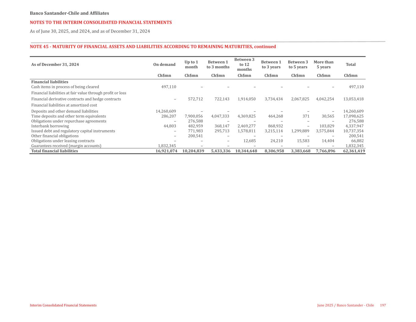 Banco Santander-Chile and Affiliates NOTES TO THE INTERIM CONSOLIDATED FINANCIAL STATEMENTS As of June 30, 2025, and 2024, and as of December 31, 2024 Interim Consolidated Financial Statements June 2025 / Banco Santander - Chile 197 NOTE 45 - MATURITY OF FINANCIAL ASSETS AND LIABILITIES ACCORDING TO REMAINING MATURITIES, continued As of December 31, 2024 On demand Up to 1 month Between 1 to 3 months Between 3 to 12 months Between 1 to 3 years Between 3 to 5 years More than 5 years Total Ch$mn Ch$mn Ch$mn Ch$mn Ch$mn Ch$mn Ch$mn Ch$mn Financial liabilities Cash items in process of being cleared 497,110 497,110 Financial liabilities at fair value through profit or loss Financial derivative contracts and hedge contracts 572,712 722,143 1,914,050 3,734,434 2,067,825 4,042,254 13,053,418 Financial liabilities at amortized cost Deposits and other demand liabilities 14,260,609 14,260,609 Time deposits and other term equivalents 286,207 7,900,056 4,047,333 4,369,825 464,268 371 30,565 17,098,625 Obligations under repurchase agreements 276,588 276,588 Interbank borrowing 44,803 482,959 368,147 2,469,277 868,932 103,829 4,337,947 Issued debt and regulatory capital instruments 771,983 295,713 1,578,811 3,215,114 1,299,889 3,575,844 10,737,354 Other financial obligations 200,541 200,541 Obligations under leasing contracts 12,685 24,210 15,583 14,404 66,882 Guarantees received (margin accounts) 1,832,345 1,832,345 Total financial liabilities 16,921,074 10,204,839 5,433,336 10,344,648 8,306,958 3,383,668 7,766,896 62,361,419