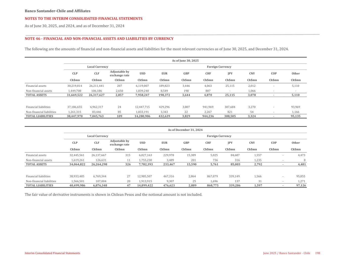 Banco Santander-Chile and Affiliates NOTES TO THE INTERIM CONSOLIDATED FINANCIAL STATEMENTS As of June 30, 2025, and 2024, and as of December 31, 2024 Interim Consolidated Financial Statements June 2025 / Banco Santander - Chile 198 NOTE 46 - FINANCIAL AND NON-FINANCIAL ASSETS AND LIABILITIES BY CURRENCY The following are the amounts of financial and non-financial assets and liabilities for the most relevant currencies as of June 30, 2025, and December 31, 2024. As of June 30, 2025 Local Currency Foreign Currency CLP CLF Adjustable by exchange rate USD EUR GBP CHF JPY CNY COP Other Ch$mn Ch$mn Ch$mn Ch$mn Ch$mn Ch$mn Ch$mn Ch$mn Ch$mn Ch$mn Ch$mn Financial assets 30,219,814 26,211,441 207 6,119,007 189,823 3,446 4,063 25,115 2,012 - 5,110 Non-financial assets 1,449,708 106,186 2,650 1,839,240 8,549 198 807 - 1,066 - - TOTAL ASSETS 31,669,522 26,317,627 2,857 7,958,247 198,372 3,644 4,870 25,115 3,078 - 5,110 Financial liabilities 37,186,655 6,962,317 24 12,447,715 429,296 3,807 941,969 307,684 3,270 - 93,969 Non-financial liabilities 1,261,315 83,446 85 1,833,191 3,343 22 2,267 821 54 - 1,166 TOTAL LIABILITIES 38,447,970 7,045,763 109 14,280,906 432,639 3,829 944,236 308,505 3,324 - 95,135 As of December 31, 2024 Local Currency Foreign Currency CLP CLF Adjustable by exchange rate USD EUR GBP CHF JPY CNY COP Other Ch$mn Ch$mn Ch$mn Ch$mn Ch$mn Ch$mn Ch$mn Ch$mn Ch$mn Ch$mn Ch$mn Financial assets 32,445,561 26,137,667 315 6,027,163 229,978 15,389 5,025 84,687 1,557 - 4,473 Non-financial assets 1,619,261 126,631 11 1,755,230 3,489 201 736 316 1,235 - 8 TOTAL ASSETS 34,064,822 26,264,298 326 7,782,393 233,467 15,590 5,761 85,003 2,792 - 4,481 Financial liabilities 38,933,485 6,769,344 27 12,985,507 467,316 2,864 867,079 339,149 1,566 - 95,855 Non-financial liabilities 1,566,501 107,004 20 1,913,915 9,307 25 1,696 137 31 - 1,271 TOTAL LIABILITIES 40,499,986 6,876,348 47 14,899,422 476,623 2,889 868,775 339,286 1,597 - 97,126 The fair value of derivative instruments is shown in Chilean Pesos and the notional amount is not included.