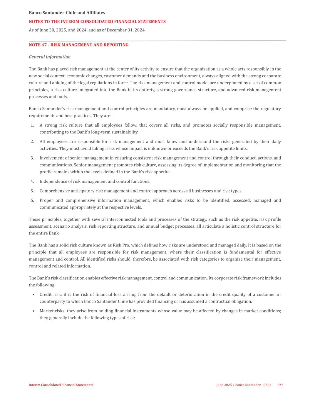 Banco Santander-Chile and Affiliates NOTES TO THE INTERIM CONSOLIDATED FINANCIAL STATEMENTS As of June 30, 2025, and 2024, and as of December 31, 2024 Interim Consolidated Financial Statements June 2025 / Banco Santander - Chile 199 NOTE 47 - RISK MANAGEMENT AND REPORTING General information The Bank has placed risk management at the center of its activity to ensure that the organization as a whole acts responsibly in the new social context, economic changes, customer demands and the business environment, always aligned with the strong corporate culture and abiding of the legal regulations in force. The risk management and control model are underpinned by a set of common principles, a risk culture integrated into the Bank in its entirety, a strong governance structure, and advanced risk management processes and tools. Banco Santander's risk management and control principles are mandatory, must always be applied, and comprise the regulatory requirements and best practices. They are: 1. A strong risk culture that all employees follow, that covers all risks, and promotes socially responsible management, contributing to the Bank's long-term sustainability. 2. All employees are responsible for risk management and must know and understand the risks generated by their daily activities. They must avoid taking risks whose impact is unknown or exceeds the Bank's risk appetite limits. 3. Involvement of senior management in ensuring consistent risk management and control through their conduct, actions, and communications. Senior management promotes risk culture, assessing its degree of implementation and monitoring that the profile remains within the levels defined in the Bank's risk appetite. 4. Independence of risk management and control functions. 5. Comprehensive anticipatory risk management and control approach across all businesses and risk types. 6. Proper and comprehensive information management, which enables risks to be identified, assessed, managed and communicated appropriately at the respective levels. These principles, together with several interconnected tools and processes of the strategy, such as the risk appetite, risk profile assessment, scenario analysis, risk reporting structure, and annual budget processes, all articulate a holistic control structure for the entire Bank. The Bank has a solid risk culture known as Risk Pro, which defines how risks are understood and managed daily. It is based on the principle that all employees are responsible for risk management, where their classification is fundamental for effective management and control. All identified risks should, therefore, be associated with risk categories to organize their management, control and related information. The Bank's risk classification enables effective risk management, control and communication. Its corporate risk framework includes the following: Credit risk: it is the risk of financial loss arising from the default or deterioration in the credit quality of a customer or counterparty to which Banco Santander Chile has provided financing or has assumed a contractual obligation. Market risks: they arise from holding financial instruments whose value may be affected by changes in market conditions; they generally include the following types of risk: