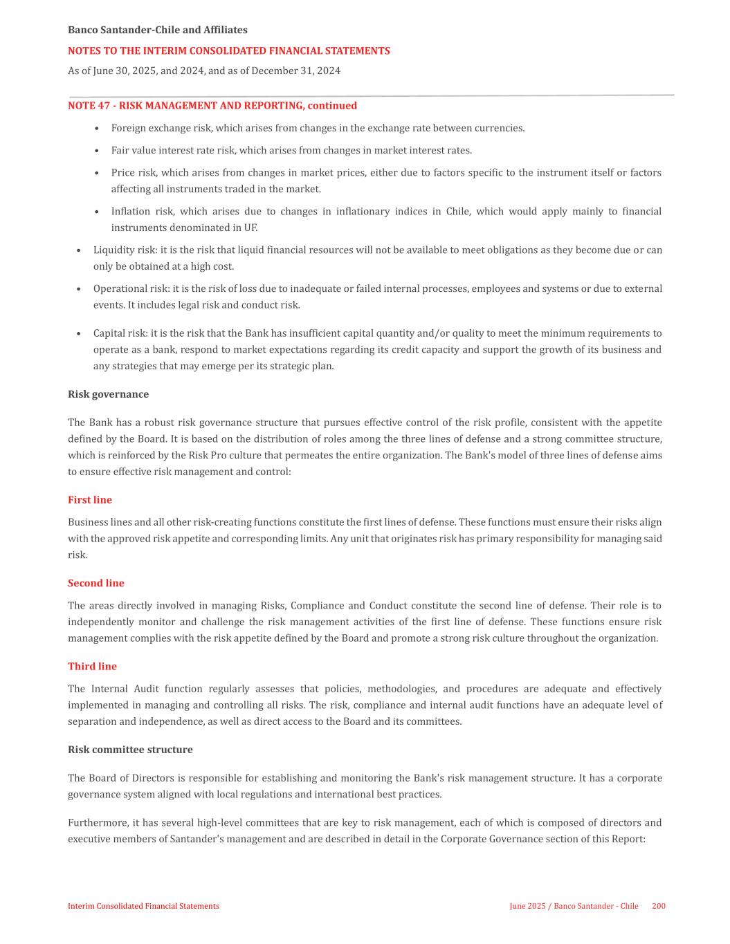 Banco Santander-Chile and Affiliates NOTES TO THE INTERIM CONSOLIDATED FINANCIAL STATEMENTS As of June 30, 2025, and 2024, and as of December 31, 2024 Interim Consolidated Financial Statements June 2025 / Banco Santander - Chile 200 NOTE 47 - RISK MANAGEMENT AND REPORTING, continued Foreign exchange risk, which arises from changes in the exchange rate between currencies. Fair value interest rate risk, which arises from changes in market interest rates. Price risk, which arises from changes in market prices, either due to factors specific to the instrument itself or factors affecting all instruments traded in the market. Inflation risk, which arises due to changes in inflationary indices in Chile, which would apply mainly to financial instruments denominated in UF. Liquidity risk: it is the risk that liquid financial resources will not be available to meet obligations as they become due or can only be obtained at a high cost. Operational risk: it is the risk of loss due to inadequate or failed internal processes, employees and systems or due to external events. It includes legal risk and conduct risk. Capital risk: it is the risk that the Bank has insufficient capital quantity and/or quality to meet the minimum requirements to operate as a bank, respond to market expectations regarding its credit capacity and support the growth of its business and any strategies that may emerge per its strategic plan. Risk governance The Bank has a robust risk governance structure that pursues effective control of the risk profile, consistent with the appetite defined by the Board. It is based on the distribution of roles among the three lines of defense and a strong committee structure, which is reinforced by the Risk Pro culture that permeates the entire organization. The Bank's model of three lines of defense aims to ensure effective risk management and control: First line Business lines and all other risk-creating functions constitute the first lines of defense. These functions must ensure their risks align with the approved risk appetite and corresponding limits. Any unit that originates risk has primary responsibility for managing said risk. Second line The areas directly involved in managing Risks, Compliance and Conduct constitute the second line of defense. Their role is to independently monitor and challenge the risk management activities of the first line of defense. These functions ensure risk management complies with the risk appetite defined by the Board and promote a strong risk culture throughout the organization. Third line The Internal Audit function regularly assesses that policies, methodologies, and procedures are adequate and effectively implemented in managing and controlling all risks. The risk, compliance and internal audit functions have an adequate level of separation and independence, as well as direct access to the Board and its committees. Risk committee structure The Board of Directors is responsible for establishing and monitoring the Bank's risk management structure. It has a corporate governance system aligned with local regulations and international best practices. Furthermore, it has several high-level committees that are key to risk management, each of which is composed of directors and executive members of Santander's management and are described in detail in the Corporate Governance section of this Report: