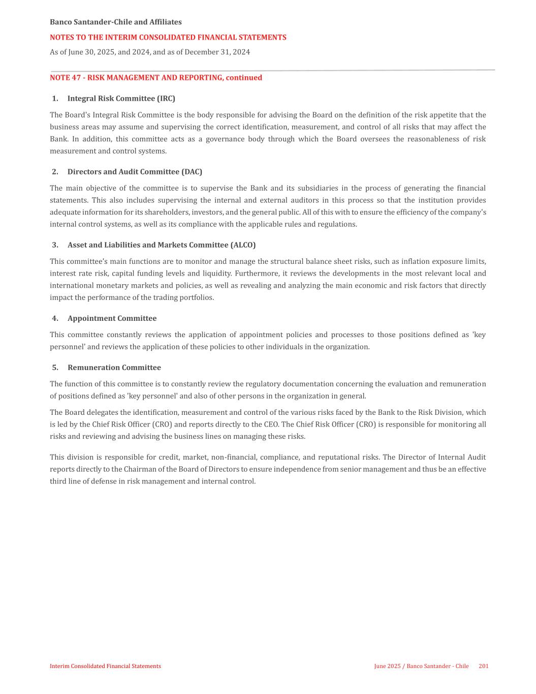 Banco Santander-Chile and Affiliates NOTES TO THE INTERIM CONSOLIDATED FINANCIAL STATEMENTS As of June 30, 2025, and 2024, and as of December 31, 2024 Interim Consolidated Financial Statements June 2025 / Banco Santander - Chile 201 NOTE 47 - RISK MANAGEMENT AND REPORTING, continued 1. Integral Risk Committee (IRC) The Board's Integral Risk Committee is the body responsible for advising the Board on the definition of the risk appetite that the business areas may assume and supervising the correct identification, measurement, and control of all risks that may affect the Bank. In addition, this committee acts as a governance body through which the Board oversees the reasonableness of risk measurement and control systems. 2. Directors and Audit Committee (DAC) The main objective of the committee is to supervise the Bank and its subsidiaries in the process of generating the financial statements. This also includes supervising the internal and external auditors in this process so that the institution provides adequate information for its shareholders, investors, and the general public. All of this with to ensure the efficiency of the company's internal control systems, as well as its compliance with the applicable rules and regulations. 3. Asset and Liabilities and Markets Committee (ALCO) ts, interest rate risk, capital funding levels and liquidity. Furthermore, it reviews the developments in the most relevant local and international monetary markets and policies, as well as revealing and analyzing the main economic and risk factors that directly impact the performance of the trading portfolios. 4. Appointment Committee This committee constantly reviews the application of appointment policies and processes to those positions defined as 'key personnel' and reviews the application of these policies to other individuals in the organization. 5. Remuneration Committee The function of this committee is to constantly review the regulatory documentation concerning the evaluation and remuneration of positions defined as 'key personnel' and also of other persons in the organization in general. The Board delegates the identification, measurement and control of the various risks faced by the Bank to the Risk Division, which is led by the Chief Risk Officer (CRO) and reports directly to the CEO. The Chief Risk Officer (CRO) is responsible for monitoring all risks and reviewing and advising the business lines on managing these risks. This division is responsible for credit, market, non-financial, compliance, and reputational risks. The Director of Internal Audit reports directly to the Chairman of the Board of Directors to ensure independence from senior management and thus be an effective third line of defense in risk management and internal control.