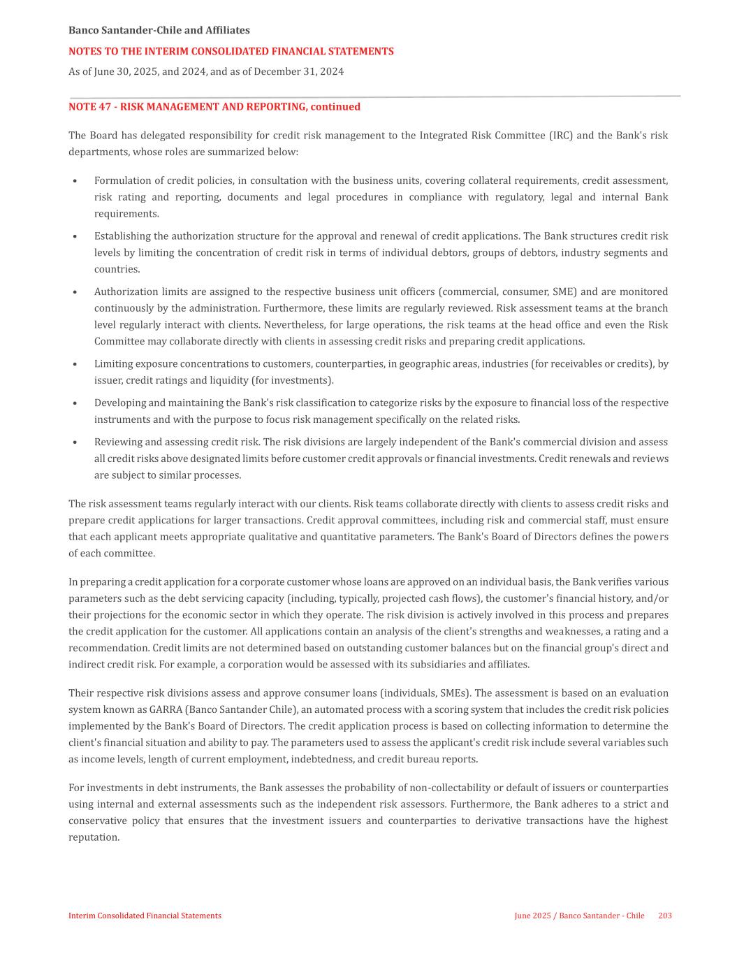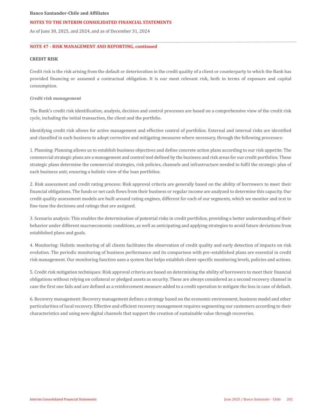 Banco Santander-Chile and Affiliates NOTES TO THE INTERIM CONSOLIDATED FINANCIAL STATEMENTS As of June 30, 2025, and 2024, and as of December 31, 2024 Interim Consolidated Financial Statements June 2025 / Banco Santander - Chile 202 NOTE 47 - RISK MANAGEMENT AND REPORTING, continued CREDIT RISK Credit risk is the risk arising from the default or deterioration in the credit quality of a client or counterparty to which the Bank has provided financing or assumed a contractual obligation. It is our most relevant risk, both in terms of exposure and capital consumption. Credit risk management The Bank's credit risk identification, analysis, decision and control processes are based on a comprehensive view of the credit risk cycle, including the initial transaction, the client and the portfolio. Identifying credit risk allows for active management and effective control of portfolios. External and internal risks are identified and classified in each business to adopt corrective and mitigating measures where necessary, through the following processes: 1. Planning: Planning allows us to establish business objectives and define concrete action plans according to our risk appetite. The commercial strategic plans are a management and control tool defined by the business and risk areas for our credit portfolios. These strategic plans determine the commercial strategies, risk policies, channels and infrastructure needed to fulfil the strategic plan of each business unit, ensuring a holistic view of the loan portfolios. 2. Risk assessment and credit rating process: Risk approval criteria are generally based on the ability of borrowers to meet their financial obligations. The funds or net cash flows from their business or regular income are analyzed to determine this capacity. Our credit quality assessment models are built around rating engines, different for each of our segments, which we monitor and test to fine-tune the decisions and ratings that are assigned. 3. Scenario analysis: This enables the determination of potential risks in credit portfolios, providing a better understanding of their behavior under different macroeconomic conditions, as well as anticipating and applying strategies to avoid future deviations from established plans and goals. 4. Monitoring: Holistic monitoring of all clients facilitates the observation of credit quality and early detection of impacts on risk evolution. The periodic monitoring of business performance and its comparison with pre-established plans are essential in credit risk management. Our monitoring function uses a system that helps establish client-specific monitoring levels, policies and actions. 5. Credit risk mitigation techniques: Risk approval criteria are based on determining the ability of borrowers to meet their financial obligations without relying on collateral or pledged assets as security. These are always considered as a second recovery channel in case the first one fails and are defined as a reinforcement measure added to a credit operation to mitigate the loss in case of default. 6. Recovery management: Recovery management defines a strategy based on the economic environment, business model and other particularities of local recovery. Effective and efficient recovery management requires segmenting our customers according to their characteristics and using new digital channels that support the creation of sustainable value through recoveries.