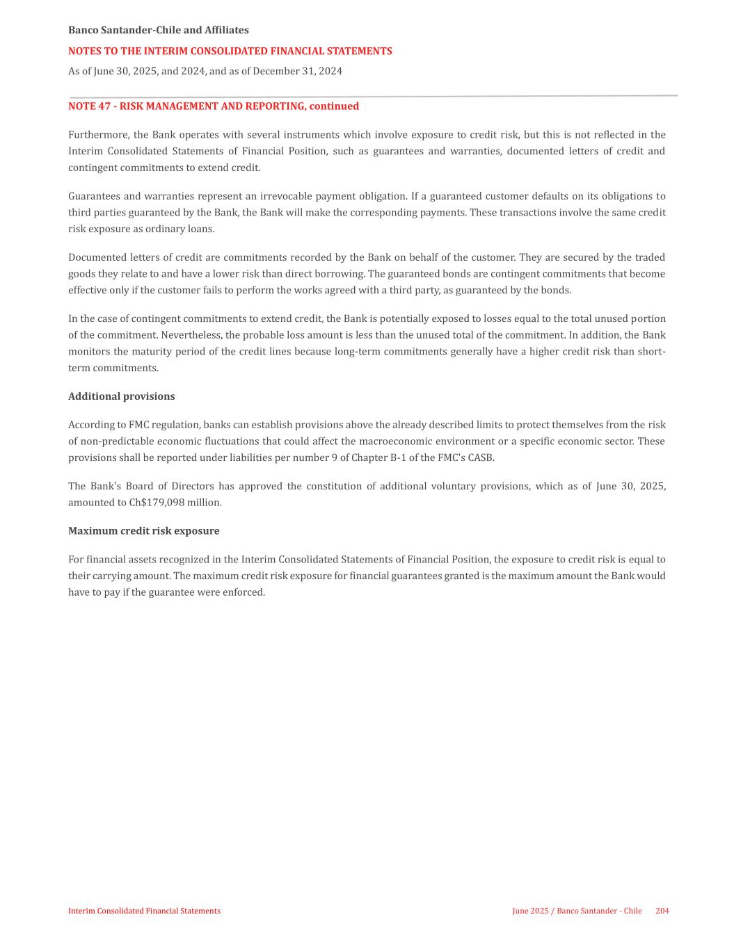 Banco Santander-Chile and Affiliates NOTES TO THE INTERIM CONSOLIDATED FINANCIAL STATEMENTS As of June 30, 2025, and 2024, and as of December 31, 2024 Interim Consolidated Financial Statements June 2025 / Banco Santander - Chile 204 NOTE 47 - RISK MANAGEMENT AND REPORTING, continued Furthermore, the Bank operates with several instruments which involve exposure to credit risk, but this is not reflected in the Interim Consolidated Statements of Financial Position, such as guarantees and warranties, documented letters of credit and contingent commitments to extend credit. Guarantees and warranties represent an irrevocable payment obligation. If a guaranteed customer defaults on its obligations to third parties guaranteed by the Bank, the Bank will make the corresponding payments. These transactions involve the same credit risk exposure as ordinary loans. Documented letters of credit are commitments recorded by the Bank on behalf of the customer. They are secured by the traded goods they relate to and have a lower risk than direct borrowing. The guaranteed bonds are contingent commitments that become effective only if the customer fails to perform the works agreed with a third party, as guaranteed by the bonds. In the case of contingent commitments to extend credit, the Bank is potentially exposed to losses equal to the total unused portion of the commitment. Nevertheless, the probable loss amount is less than the unused total of the commitment. In addition, the Bank monitors the maturity period of the credit lines because long-term commitments generally have a higher credit risk than short- term commitments. Additional provisions According to FMC regulation, banks can establish provisions above the already described limits to protect themselves from the risk of non-predictable economic fluctuations that could affect the macroeconomic environment or a specific economic sector. These provisions shall be reported under liabilities per number 9 of Chapter B-1 of the FMC's CASB. The Bank's Board of Directors has approved the constitution of additional voluntary provisions, which as of June 30, 2025, amounted to Ch$179,098 million. Maximum credit risk exposure For financial assets recognized in the Interim Consolidated Statements of Financial Position, the exposure to credit risk is equal to their carrying amount. The maximum credit risk exposure for financial guarantees granted is the maximum amount the Bank would have to pay if the guarantee were enforced.