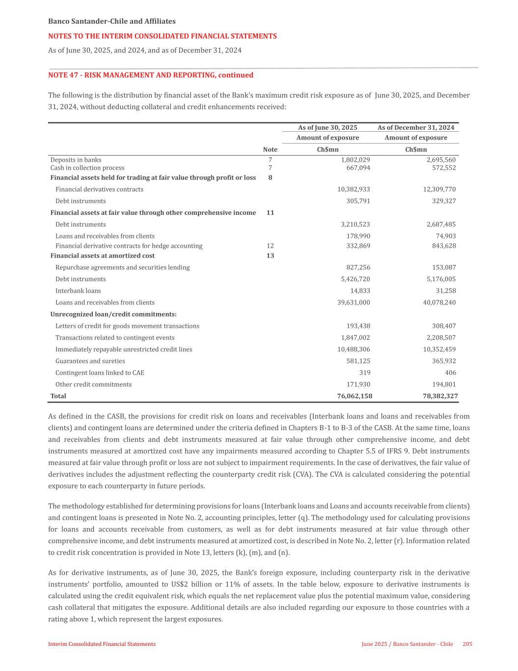 Banco Santander-Chile and Affiliates NOTES TO THE INTERIM CONSOLIDATED FINANCIAL STATEMENTS As of June 30, 2025, and 2024, and as of December 31, 2024 Interim Consolidated Financial Statements June 2025 / Banco Santander - Chile 205 NOTE 47 - RISK MANAGEMENT AND REPORTING, continued The following is the distribution by financial asset of the Bank's maximum credit risk exposure as of June 30, 2025, and December 31, 2024, without deducting collateral and credit enhancements received: As of June 30, 2025 As of December 31, 2024 Amount of exposure Amount of exposure Note Ch$mn Ch$mn Deposits in banks 7 1,802,029 2,695,560 Cash in collection process 7 667,094 572,552 Financial assets held for trading at fair value through profit or loss 8 Financial derivatives contracts 10,382,933 12,309,770 Debt instruments 305,791 329,327 Financial assets at fair value through other comprehensive income 11 Debt instruments 3,210,523 2,687,485 Loans and receivables from clients 178,990 74,903 Financial derivative contracts for hedge accounting 12 332,869 843,628 Financial assets at amortized cost 13 Repurchase agreements and securities lending 827,256 153,087 Debt instruments 5,426,720 5,176,005 Interbank loans 14,833 31,258 Loans and receivables from clients 39,631,000 40,078,240 Unrecognized loan/credit commitments: Letters of credit for goods movement transactions 193,438 308,407 Transactions related to contingent events 1,847,002 2,208,507 Immediately repayable unrestricted credit lines 10,488,306 10,352,459 Guarantees and sureties 581,125 365,932 Contingent loans linked to CAE 319 406 Other credit commitments 171,930 194,801 Total 76,062,158 78,382,327 As defined in the CASB, the provisions for credit risk on loans and receivables (Interbank loans and loans and receivables from clients) and contingent loans are determined under the criteria defined in Chapters B-1 to B-3 of the CASB. At the same time, loans and receivables from clients and debt instruments measured at fair value through other comprehensive income, and debt instruments measured at amortized cost have any impairments measured according to Chapter 5.5 of IFRS 9. Debt instruments measured at fair value through profit or loss are not subject to impairment requirements. In the case of derivatives, the fair value of derivatives includes the adjustment reflecting the counterparty credit risk (CVA). The CVA is calculated considering the potential exposure to each counterparty in future periods. The methodology established for determining provisions for loans (Interbank loans and Loans and accounts receivable from clients) and contingent loans is presented in Note No. 2, accounting principles, letter (q). The methodology used for calculating provisions for loans and accounts receivable from customers, as well as for debt instruments measured at fair value through other comprehensive income, and debt instruments measured at amortized cost, is described in Note No. 2, letter (r). Information related to credit risk concentration is provided in Note 13, letters (k), (m), and (n). As for derivative instruments, as of June 30, portfolio, amounted to US$2 billion or 11% of assets. In the table below, exposure to derivative instruments is calculated using the credit equivalent risk, which equals the net replacement value plus the potential maximum value, considering cash collateral that mitigates the exposure. Additional details are also included regarding our exposure to those countries with a rating above 1, which represent the largest exposures.