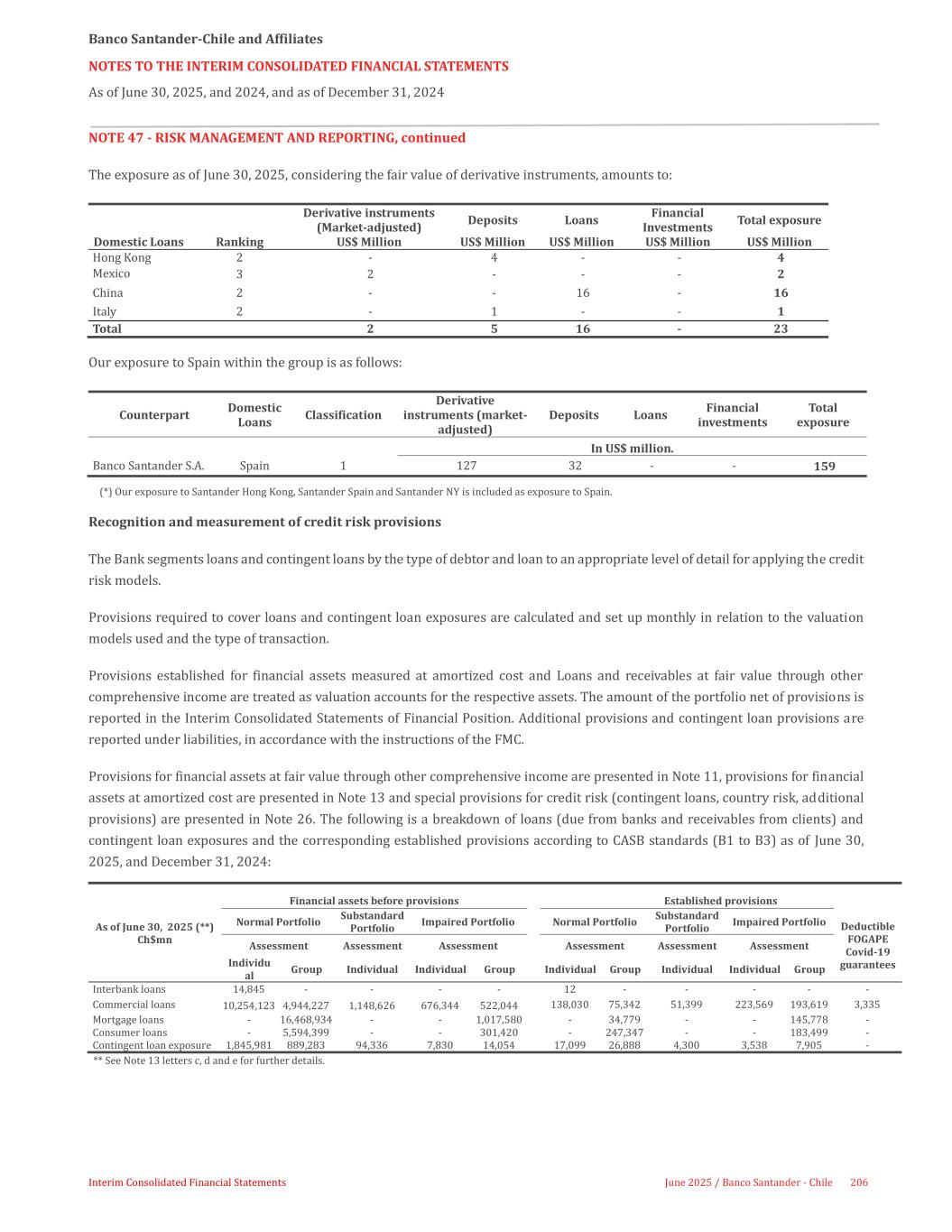 Banco Santander-Chile and Affiliates NOTES TO THE INTERIM CONSOLIDATED FINANCIAL STATEMENTS As of June 30, 2025, and 2024, and as of December 31, 2024 Interim Consolidated Financial Statements June 2025 / Banco Santander - Chile 206 NOTE 47 - RISK MANAGEMENT AND REPORTING, continued The exposure as of June 30, 2025, considering the fair value of derivative instruments, amounts to: Derivative instruments (Market-adjusted) Deposits Loans Financial Investments Total exposure Domestic Loans Ranking US$ Million US$ Million US$ Million US$ Million US$ Million Hong Kong 2 - 4 - - 4 Mexico 3 2 - - - 2 China 2 - - 16 - 16 Italy 2 - 1 - - 1 Total 2 5 16 - 23 Our exposure to Spain within the group is as follows: Counterpart Domestic Loans Classification Derivative instruments (market- adjusted) Deposits Loans Financial investments Total exposure In US$ million. Banco Santander S.A. Spain 1 127 32 - - 159 (*) Our exposure to Santander Hong Kong, Santander Spain and Santander NY is included as exposure to Spain. Recognition and measurement of credit risk provisions The Bank segments loans and contingent loans by the type of debtor and loan to an appropriate level of detail for applying the credit risk models. Provisions required to cover loans and contingent loan exposures are calculated and set up monthly in relation to the valuation models used and the type of transaction. Provisions established for financial assets measured at amortized cost and Loans and receivables at fair value through other comprehensive income are treated as valuation accounts for the respective assets. The amount of the portfolio net of provisions is reported in the Interim Consolidated Statements of Financial Position. Additional provisions and contingent loan provisions are reported under liabilities, in accordance with the instructions of the FMC. Provisions for financial assets at fair value through other comprehensive income are presented in Note 11, provisions for financial assets at amortized cost are presented in Note 13 and special provisions for credit risk (contingent loans, country risk, additional provisions) are presented in Note 26. The following is a breakdown of loans (due from banks and receivables from clients) and contingent loan exposures and the corresponding established provisions according to CASB standards (B1 to B3) as of June 30, 2025, and December 31, 2024: As of June 30, 2025 (**) Ch$mn Financial assets before provisions Established provisions Normal Portfolio Substandard Portfolio Impaired Portfolio Normal Portfolio Substandard Portfolio Impaired Portfolio Deductible FOGAPE Covid-19 guarantees Assessment Assessment Assessment Assessment Assessment Assessment Individu al Group Individual Individual Group Individual Group Individual Individual Group Interbank loans 14,845 - - - - 12 - - - - - Commercial loans 10,254,123 4,944,227 1,148,626 676,344 522,044 138,030 75,342 51,399 223,569 193,619 3,335 Mortgage loans - 16,468,934 - - 1,017,580 - 34,779 - - 145,778 - Consumer loans - 5,594,399 - - 301,420 - 247,347 - - 183,499 - Contingent loan exposure 1,845,981 889,283 94,336 7,830 14,054 17,099 26,888 4,300 3,538 7,905 - ** See Note 13 letters c, d and e for further details.