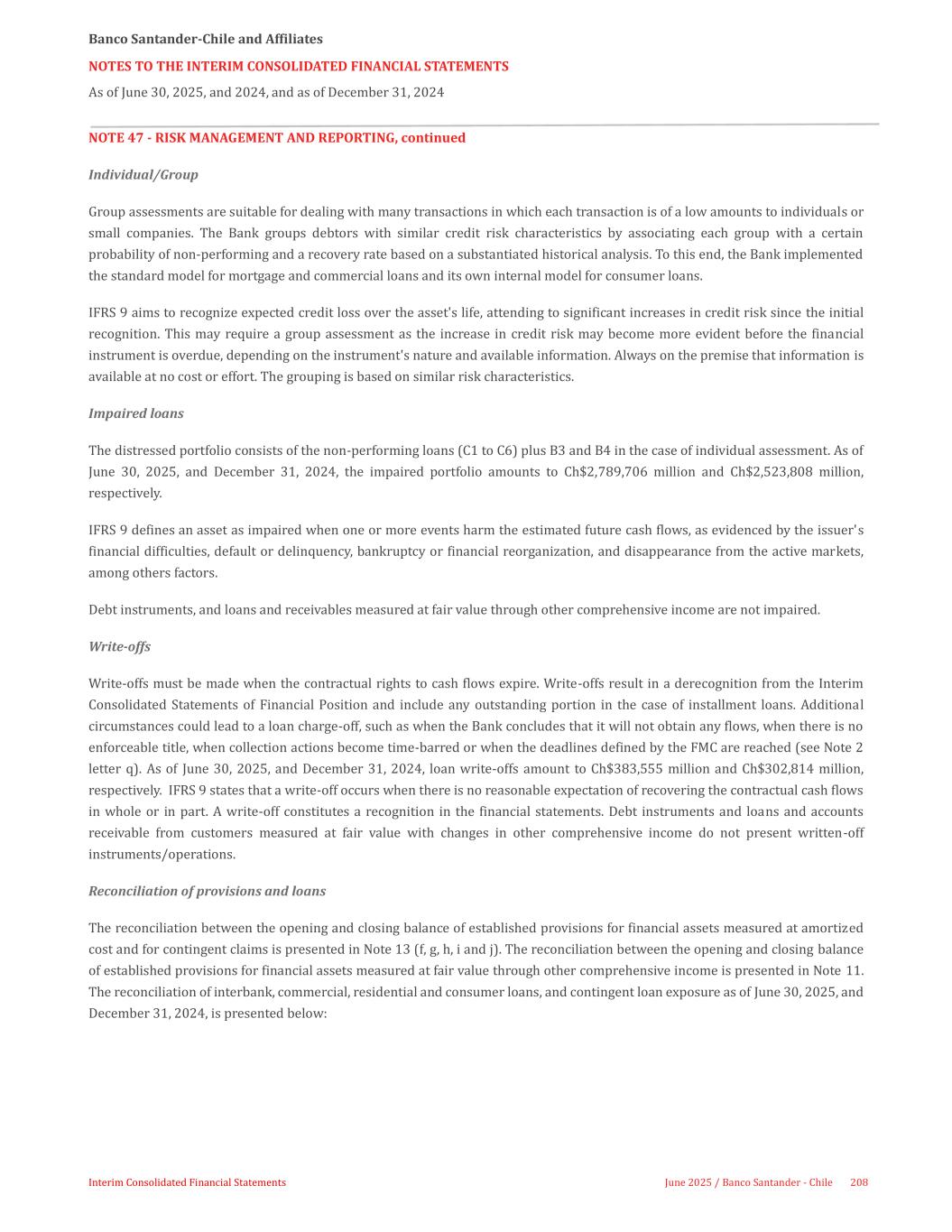 Banco Santander-Chile and Affiliates NOTES TO THE INTERIM CONSOLIDATED FINANCIAL STATEMENTS As of June 30, 2025, and 2024, and as of December 31, 2024 Interim Consolidated Financial Statements June 2025 / Banco Santander - Chile 208 NOTE 47 - RISK MANAGEMENT AND REPORTING, continued Individual/Group Group assessments are suitable for dealing with many transactions in which each transaction is of a low amounts to individuals or small companies. The Bank groups debtors with similar credit risk characteristics by associating each group with a certain probability of non-performing and a recovery rate based on a substantiated historical analysis. To this end, the Bank implemented the standard model for mortgage and commercial loans and its own internal model for consumer loans. IFRS 9 aims to recognize expected credit loss over the asset's life, attending to significant increases in credit risk since the initial recognition. This may require a group assessment as the increase in credit risk may become more evident before the financial instrument is overdue, depending on the instrument's nature and available information. Always on the premise that information is available at no cost or effort. The grouping is based on similar risk characteristics. Impaired loans The distressed portfolio consists of the non-performing loans (C1 to C6) plus B3 and B4 in the case of individual assessment. As of June 30, 2025, and December 31, 2024, the impaired portfolio amounts to Ch$2,789,706 million and Ch$2,523,808 million, respectively. IFRS 9 defines an asset as impaired when one or more events harm the estimated future cash flows, as evidenced by the issuer's financial difficulties, default or delinquency, bankruptcy or financial reorganization, and disappearance from the active markets, among others factors. Debt instruments, and loans and receivables measured at fair value through other comprehensive income are not impaired. Write-offs Write-offs must be made when the contractual rights to cash flows expire. Write-offs result in a derecognition from the Interim Consolidated Statements of Financial Position and include any outstanding portion in the case of installment loans. Additional circumstances could lead to a loan charge-off, such as when the Bank concludes that it will not obtain any flows, when there is no enforceable title, when collection actions become time-barred or when the deadlines defined by the FMC are reached (see Note 2 letter q). As of June 30, 2025, and December 31, 2024, loan write-offs amount to Ch$383,555 million and Ch$302,814 million, respectively. IFRS 9 states that a write-off occurs when there is no reasonable expectation of recovering the contractual cash flows in whole or in part. A write-off constitutes a recognition in the financial statements. Debt instruments and loans and accounts receivable from customers measured at fair value with changes in other comprehensive income do not present written-off instruments/operations. Reconciliation of provisions and loans The reconciliation between the opening and closing balance of established provisions for financial assets measured at amortized cost and for contingent claims is presented in Note 13 (f, g, h, i and j). The reconciliation between the opening and closing balance of established provisions for financial assets measured at fair value through other comprehensive income is presented in Note 11. The reconciliation of interbank, commercial, residential and consumer loans, and contingent loan exposure as of June 30, 2025, and December 31, 2024, is presented below: