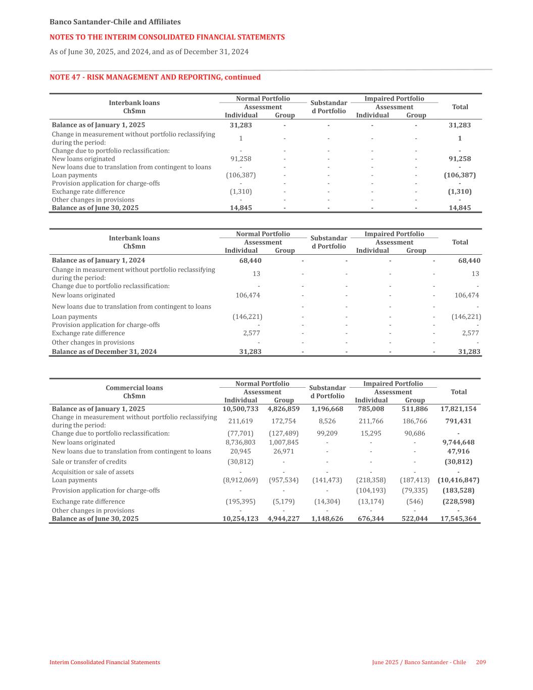 Banco Santander-Chile and Affiliates NOTES TO THE INTERIM CONSOLIDATED FINANCIAL STATEMENTS As of June 30, 2025, and 2024, and as of December 31, 2024 Interim Consolidated Financial Statements June 2025 / Banco Santander - Chile 209 NOTE 47 - RISK MANAGEMENT AND REPORTING, continued Interbank loans Ch$mn Normal Portfolio Substandar d Portfolio Impaired Portfolio Total Assessment Assessment Individual Group Individual Group Balance as of January 1, 2025 31,283 - - - - 31,283 Change in measurement without portfolio reclassifying during the period: 1 - - - - 1 Change due to portfolio reclassification: - - - - - - New loans originated 91,258 - - - - 91,258 New loans due to translation from contingent to loans - - - - - - Loan payments (106,387) - - - - (106,387) Provision application for charge-offs - - - - - - Exchange rate difference (1,310) - - - - (1,310) Other changes in provisions - - - - - - Balance as of June 30, 2025 14,845 - - - - 14,845 Interbank loans Ch$mn Normal Portfolio Substandar d Portfolio Impaired Portfolio Total Assessment Assessment Individual Group Individual Group Balance as of January 1, 2024 68,440 - - - - 68,440 Change in measurement without portfolio reclassifying during the period: 13 - - - - 13 Change due to portfolio reclassification: - - - - - - New loans originated 106,474 - - - - 106,474 New loans due to translation from contingent to loans - - - - - Loan payments (146,221) - - - - (146,221) Provision application for charge-offs - - - - - - Exchange rate difference 2,577 - - - - 2,577 Other changes in provisions - - - - - - Balance as of December 31, 2024 31,283 - - - - 31,283 Commercial loans Ch$mn Normal Portfolio Substandar d Portfolio Impaired Portfolio Total Assessment Assessment Individual Group Individual Group Balance as of January 1, 2025 10,500,733 4,826,859 1,196,668 785,008 511,886 17,821,154 Change in measurement without portfolio reclassifying during the period: 211,619 172,754 8,526 211,766 186,766 791,431 Change due to portfolio reclassification: (77,701) (127,489) 99,209 15,295 90,686 - New loans originated 8,736,803 1,007,845 - - - 9,744,648 New loans due to translation from contingent to loans 20,945 26,971 - - - 47,916 Sale or transfer of credits (30,812) - - - - (30,812) Acquisition or sale of assets - - - - - - Loan payments (8,912,069) (957,534) (141,473) (218,358) (187,413) (10,416,847) Provision application for charge-offs - - - (104,193) (79,335) (183,528) Exchange rate difference (195,395) (5,179) (14,304) (13,174) (546) (228,598) Other changes in provisions - - - - - - Balance as of June 30, 2025 10,254,123 4,944,227 1,148,626 676,344 522,044 17,545,364