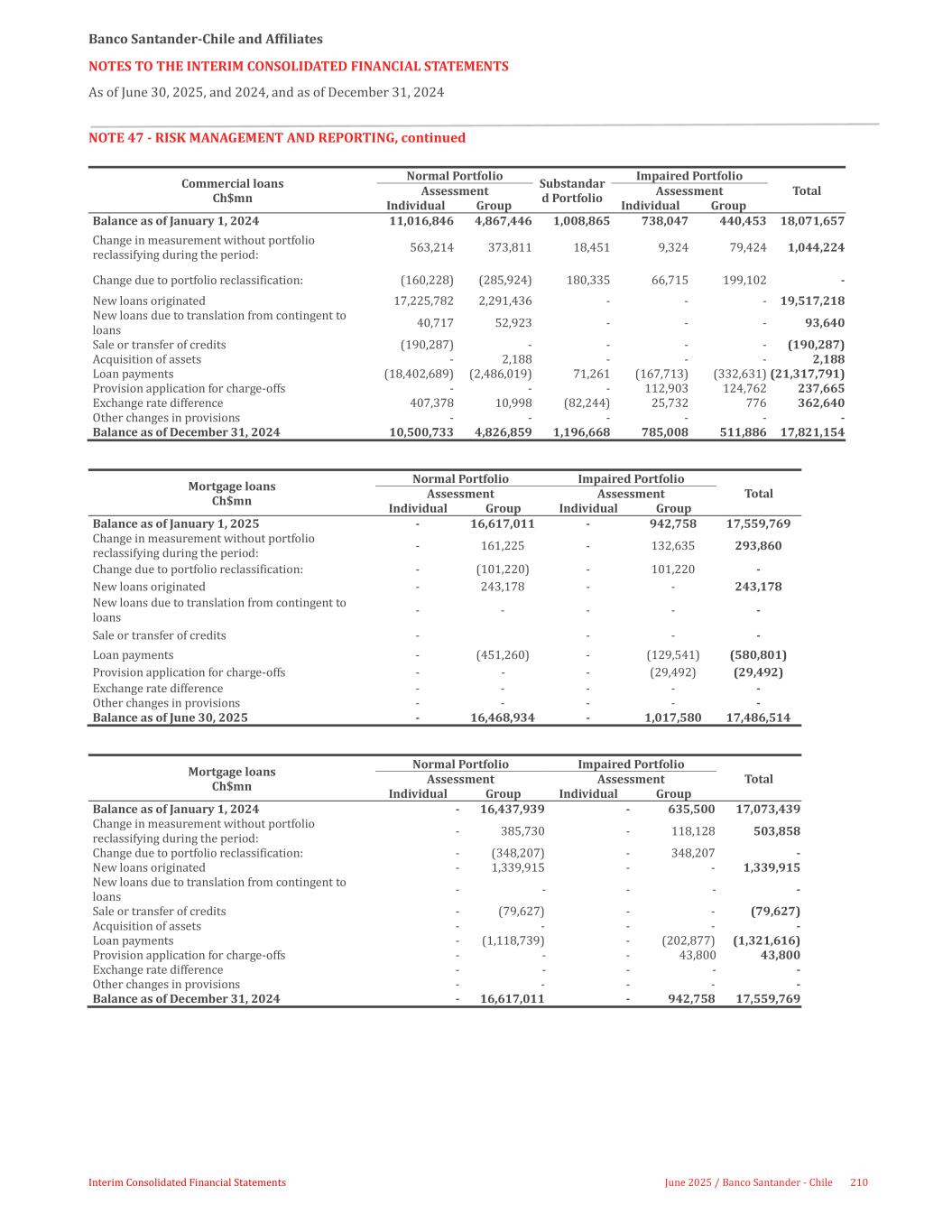Banco Santander-Chile and Affiliates NOTES TO THE INTERIM CONSOLIDATED FINANCIAL STATEMENTS As of June 30, 2025, and 2024, and as of December 31, 2024 Interim Consolidated Financial Statements June 2025 / Banco Santander - Chile 210 NOTE 47 - RISK MANAGEMENT AND REPORTING, continued Commercial loans Ch$mn Normal Portfolio Substandar d Portfolio Impaired Portfolio Total Assessment Assessment Individual Group Individual Group Balance as of January 1, 2024 11,016,846 4,867,446 1,008,865 738,047 440,453 18,071,657 Change in measurement without portfolio reclassifying during the period: 563,214 373,811 18,451 9,324 79,424 1,044,224 Change due to portfolio reclassification: (160,228) (285,924) 180,335 66,715 199,102 - New loans originated 17,225,782 2,291,436 - - - 19,517,218 New loans due to translation from contingent to loans 40,717 52,923 - - - 93,640 Sale or transfer of credits (190,287) - - - - (190,287) Acquisition of assets - 2,188 - - - 2,188 Loan payments (18,402,689) (2,486,019) 71,261 (167,713) (332,631) (21,317,791) Provision application for charge-offs - - - 112,903 124,762 237,665 Exchange rate difference 407,378 10,998 (82,244) 25,732 776 362,640 Other changes in provisions - - - - - - Balance as of December 31, 2024 10,500,733 4,826,859 1,196,668 785,008 511,886 17,821,154 Mortgage loans Ch$mn Normal Portfolio Impaired Portfolio Total Assessment Assessment Individual Group Individual Group Balance as of January 1, 2025 - 16,617,011 - 942,758 17,559,769 Change in measurement without portfolio reclassifying during the period: - 161,225 - 132,635 293,860 Change due to portfolio reclassification: - (101,220) - 101,220 - New loans originated - 243,178 - - 243,178 New loans due to translation from contingent to loans - - - - - Sale or transfer of credits - - - - Loan payments - (451,260) - (129,541) (580,801) Provision application for charge-offs - - - (29,492) (29,492) Exchange rate difference - - - - - Other changes in provisions - - - - - Balance as of June 30, 2025 - 16,468,934 - 1,017,580 17,486,514 Mortgage loans Ch$mn Normal Portfolio Impaired Portfolio Total Assessment Assessment Individual Group Individual Group Balance as of January 1, 2024 - 16,437,939 - 635,500 17,073,439 Change in measurement without portfolio reclassifying during the period: - 385,730 - 118,128 503,858 Change due to portfolio reclassification: - (348,207) - 348,207 - New loans originated - 1,339,915 - - 1,339,915 New loans due to translation from contingent to loans - - - - - Sale or transfer of credits - (79,627) - - (79,627) Acquisition of assets - - - - - Loan payments - (1,118,739) - (202,877) (1,321,616) Provision application for charge-offs - - - 43,800 43,800 Exchange rate difference - - - - - Other changes in provisions - - - - - Balance as of December 31, 2024 - 16,617,011 - 942,758 17,559,769