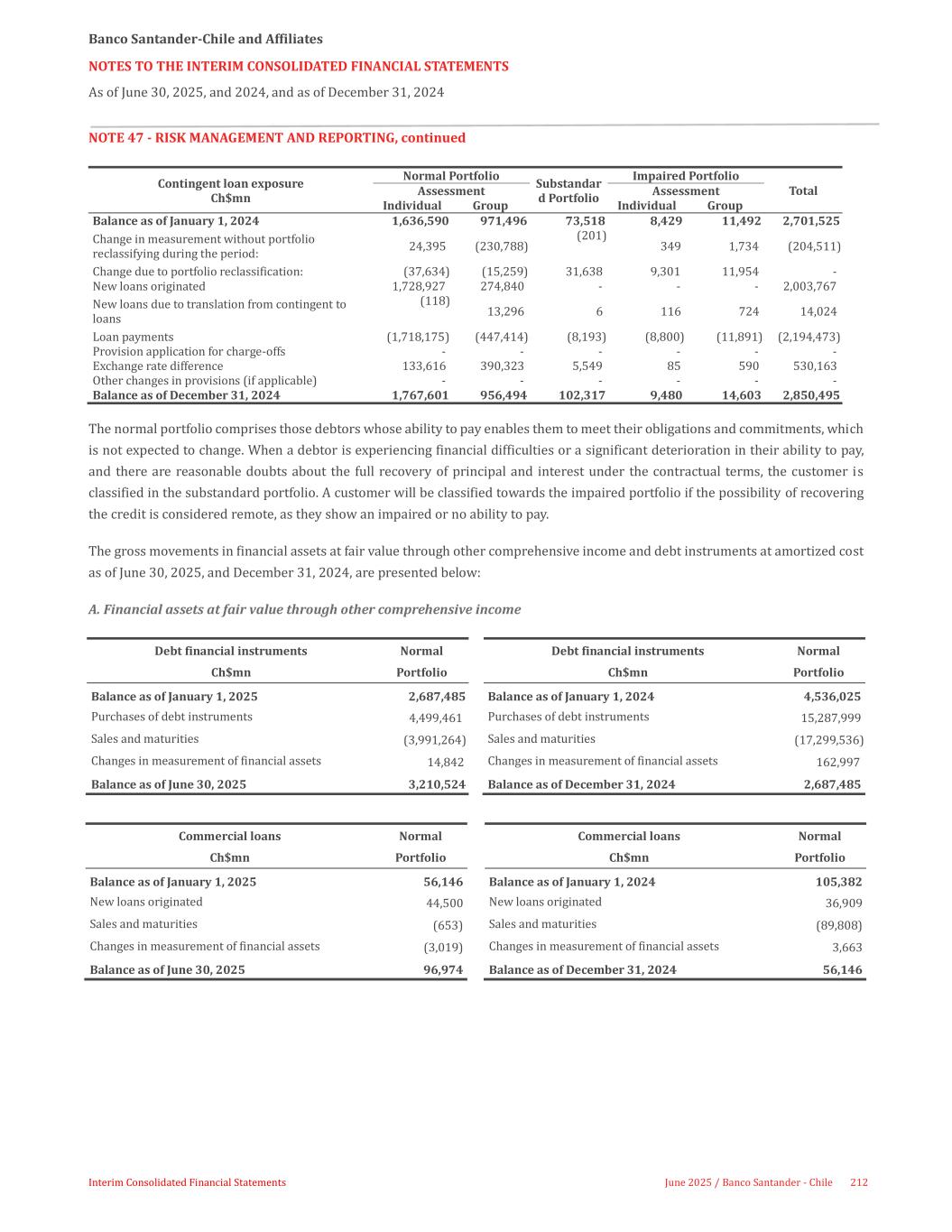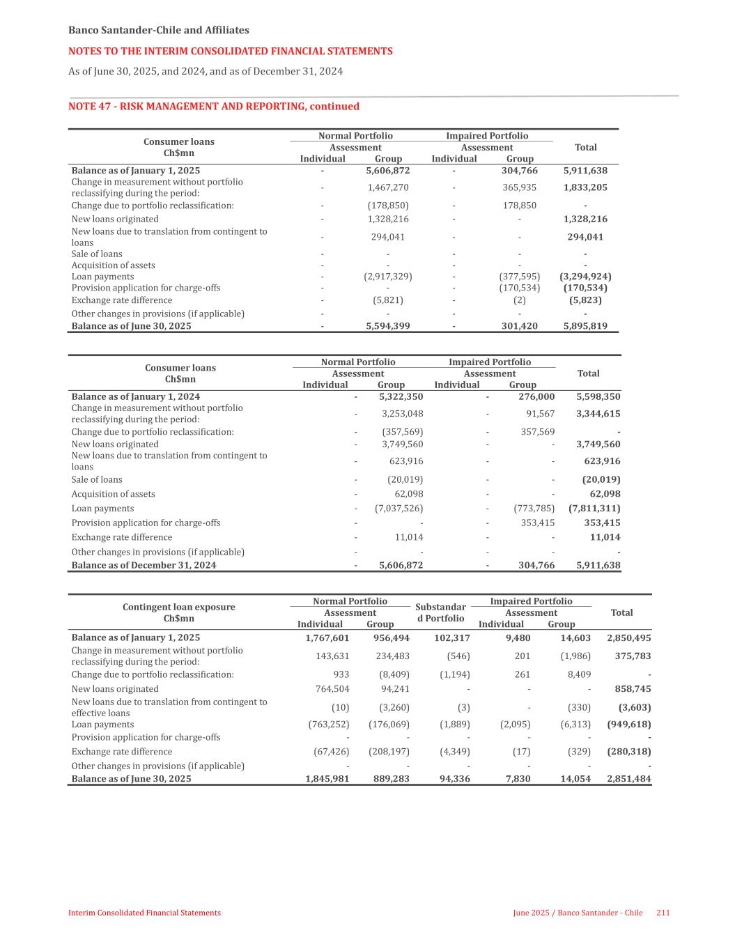 Banco Santander-Chile and Affiliates NOTES TO THE INTERIM CONSOLIDATED FINANCIAL STATEMENTS As of June 30, 2025, and 2024, and as of December 31, 2024 Interim Consolidated Financial Statements June 2025 / Banco Santander - Chile 211 NOTE 47 - RISK MANAGEMENT AND REPORTING, continued Consumer loans Ch$mn Normal Portfolio Impaired Portfolio Total Assessment Assessment Individual Group Individual Group Balance as of January 1, 2025 - 5,606,872 - 304,766 5,911,638 Change in measurement without portfolio reclassifying during the period: - 1,467,270 - 365,935 1,833,205 Change due to portfolio reclassification: - (178,850) - 178,850 - New loans originated - 1,328,216 - - 1,328,216 New loans due to translation from contingent to loans - 294,041 - - 294,041 Sale of loans - - - - - Acquisition of assets - - - - - Loan payments - (2,917,329) - (377,595) (3,294,924) Provision application for charge-offs - - - (170,534) (170,534) Exchange rate difference - (5,821) - (2) (5,823) Other changes in provisions (if applicable) - - - - - Balance as of June 30, 2025 - 5,594,399 - 301,420 5,895,819 Consumer loans Ch$mn Normal Portfolio Impaired Portfolio Total Assessment Assessment Individual Group Individual Group Balance as of January 1, 2024 - 5,322,350 - 276,000 5,598,350 Change in measurement without portfolio reclassifying during the period: - 3,253,048 - 91,567 3,344,615 Change due to portfolio reclassification: - (357,569) - 357,569 - New loans originated - 3,749,560 - - 3,749,560 New loans due to translation from contingent to loans - 623,916 - - 623,916 Sale of loans - (20,019) - - (20,019) Acquisition of assets - 62,098 - - 62,098 Loan payments - (7,037,526) - (773,785) (7,811,311) Provision application for charge-offs - - - 353,415 353,415 Exchange rate difference - 11,014 - - 11,014 Other changes in provisions (if applicable) - - - - - Balance as of December 31, 2024 - 5,606,872 - 304,766 5,911,638 Contingent loan exposure Ch$mn Normal Portfolio Substandar d Portfolio Impaired Portfolio Total Assessment Assessment Individual Group Individual Group Balance as of January 1, 2025 1,767,601 956,494 102,317 9,480 14,603 2,850,495 Change in measurement without portfolio reclassifying during the period: 143,631 234,483 (546) 201 (1,986) 375,783 Change due to portfolio reclassification: 933 (8,409) (1,194) 261 8,409 - New loans originated 764,504 94,241 - - - 858,745 New loans due to translation from contingent to effective loans (10) (3,260) (3) - (330) (3,603) Loan payments (763,252) (176,069) (1,889) (2,095) (6,313) (949,618) Provision application for charge-offs - - - - - - Exchange rate difference (67,426) (208,197) (4,349) (17) (329) (280,318) Other changes in provisions (if applicable) - - - - - - Balance as of June 30, 2025 1,845,981 889,283 94,336 7,830 14,054 2,851,484