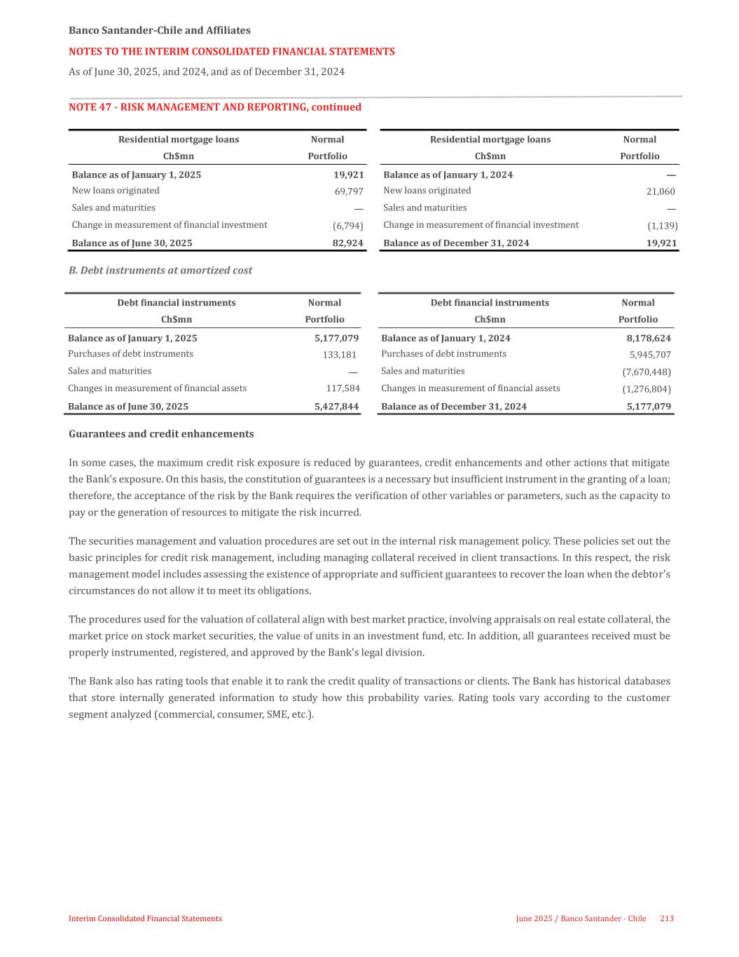 Banco Santander-Chile and Affiliates NOTES TO THE INTERIM CONSOLIDATED FINANCIAL STATEMENTS As of June 30, 2025, and 2024, and as of December 31, 2024 Interim Consolidated Financial Statements June 2025 / Banco Santander - Chile 213 NOTE 47 - RISK MANAGEMENT AND REPORTING, continued Residential mortgage loans Normal Residential mortgage loans Normal Ch$mn Portfolio Ch$mn Portfolio Balance as of January 1, 2025 19,921 Balance as of January 1, 2024 New loans originated 69,797 New loans originated 21,060 Sales and maturities Sales and maturities Change in measurement of financial investment (6,794) Change in measurement of financial investment (1,139) Balance as of June 30, 2025 82,924 Balance as of December 31, 2024 19,921 B. Debt instruments at amortized cost Debt financial instruments Normal Debt financial instruments Normal Ch$mn Portfolio Ch$mn Portfolio Balance as of January 1, 2025 5,177,079 Balance as of January 1, 2024 8,178,624 Purchases of debt instruments 133,181 Purchases of debt instruments 5,945,707 Sales and maturities Sales and maturities (7,670,448) Changes in measurement of financial assets 117,584 Changes in measurement of financial assets (1,276,804) Balance as of June 30, 2025 5,427,844 Balance as of December 31, 2024 5,177,079 Guarantees and credit enhancements In some cases, the maximum credit risk exposure is reduced by guarantees, credit enhancements and other actions that mitigate the Bank's exposure. On this basis, the constitution of guarantees is a necessary but insufficient instrument in the granting of a loan; therefore, the acceptance of the risk by the Bank requires the verification of other variables or parameters, such as the capacity to pay or the generation of resources to mitigate the risk incurred. The securities management and valuation procedures are set out in the internal risk management policy. These policies set out the basic principles for credit risk management, including managing collateral received in client transactions. In this respect, the risk management model includes assessing the existence of appropriate and sufficient guarantees to recover the loan when the debtor's circumstances do not allow it to meet its obligations. The procedures used for the valuation of collateral align with best market practice, involving appraisals on real estate collateral, the market price on stock market securities, the value of units in an investment fund, etc. In addition, all guarantees received must be properly instrumented, registered, and approved by the Bank's legal division. The Bank also has rating tools that enable it to rank the credit quality of transactions or clients. The Bank has historical databases that store internally generated information to study how this probability varies. Rating tools vary according to the customer segment analyzed (commercial, consumer, SME, etc.).