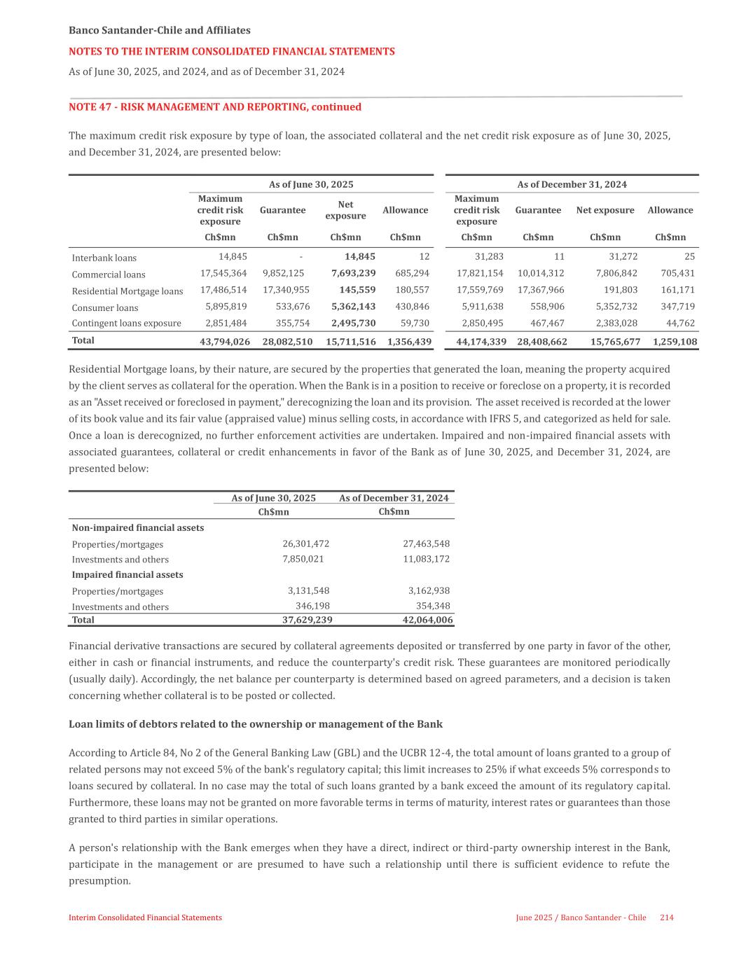 Banco Santander-Chile and Affiliates NOTES TO THE INTERIM CONSOLIDATED FINANCIAL STATEMENTS As of June 30, 2025, and 2024, and as of December 31, 2024 Interim Consolidated Financial Statements June 2025 / Banco Santander - Chile 214 NOTE 47 - RISK MANAGEMENT AND REPORTING, continued The maximum credit risk exposure by type of loan, the associated collateral and the net credit risk exposure as of June 30, 2025, and December 31, 2024, are presented below: As of June 30, 2025 As of December 31, 2024 Maximum credit risk exposure Guarantee Net exposure Allowance Maximum credit risk exposure Guarantee Net exposure Allowance Ch$mn Ch$mn Ch$mn Ch$mn Ch$mn Ch$mn Ch$mn Ch$mn Interbank loans 14,845 - 14,845 12 31,283 11 31,272 25 Commercial loans 17,545,364 9,852,125 7,693,239 685,294 17,821,154 10,014,312 7,806,842 705,431 Residential Mortgage loans 17,486,514 17,340,955 145,559 180,557 17,559,769 17,367,966 191,803 161,171 Consumer loans 5,895,819 533,676 5,362,143 430,846 5,911,638 558,906 5,352,732 347,719 Contingent loans exposure 2,851,484 355,754 2,495,730 59,730 2,850,495 467,467 2,383,028 44,762 Total 43,794,026 28,082,510 15,711,516 1,356,439 44,174,339 28,408,662 15,765,677 1,259,108 Residential Mortgage loans, by their nature, are secured by the properties that generated the loan, meaning the property acquired by the client serves as collateral for the operation. When the Bank is in a position to receive or foreclose on a property, it is recorded as an "Asset received or foreclosed in payment," derecognizing the loan and its provision. The asset received is recorded at the lower of its book value and its fair value (appraised value) minus selling costs, in accordance with IFRS 5, and categorized as held for sale. Once a loan is derecognized, no further enforcement activities are undertaken. Impaired and non-impaired financial assets with associated guarantees, collateral or credit enhancements in favor of the Bank as of June 30, 2025, and December 31, 2024, are presented below: As of June 30, 2025 As of December 31, 2024 Ch$mn Ch$mn Non-impaired financial assets Properties/mortgages 26,301,472 27,463,548 Investments and others 7,850,021 11,083,172 Impaired financial assets Properties/mortgages 3,131,548 3,162,938 Investments and others 346,198 354,348 Total 37,629,239 42,064,006 Financial derivative transactions are secured by collateral agreements deposited or transferred by one party in favor of the other, either in cash or financial instruments, and reduce the counterparty's credit risk. These guarantees are monitored periodically (usually daily). Accordingly, the net balance per counterparty is determined based on agreed parameters, and a decision is taken concerning whether collateral is to be posted or collected. Loan limits of debtors related to the ownership or management of the Bank According to Article 84, No 2 of the General Banking Law (GBL) and the UCBR 12-4, the total amount of loans granted to a group of related persons may not exceed 5% of the bank's regulatory capital; this limit increases to 25% if what exceeds 5% corresponds to loans secured by collateral. In no case may the total of such loans granted by a bank exceed the amount of its regulatory capital. Furthermore, these loans may not be granted on more favorable terms in terms of maturity, interest rates or guarantees than those granted to third parties in similar operations. A person's relationship with the Bank emerges when they have a direct, indirect or third-party ownership interest in the Bank, participate in the management or are presumed to have such a relationship until there is sufficient evidence to refute the presumption.