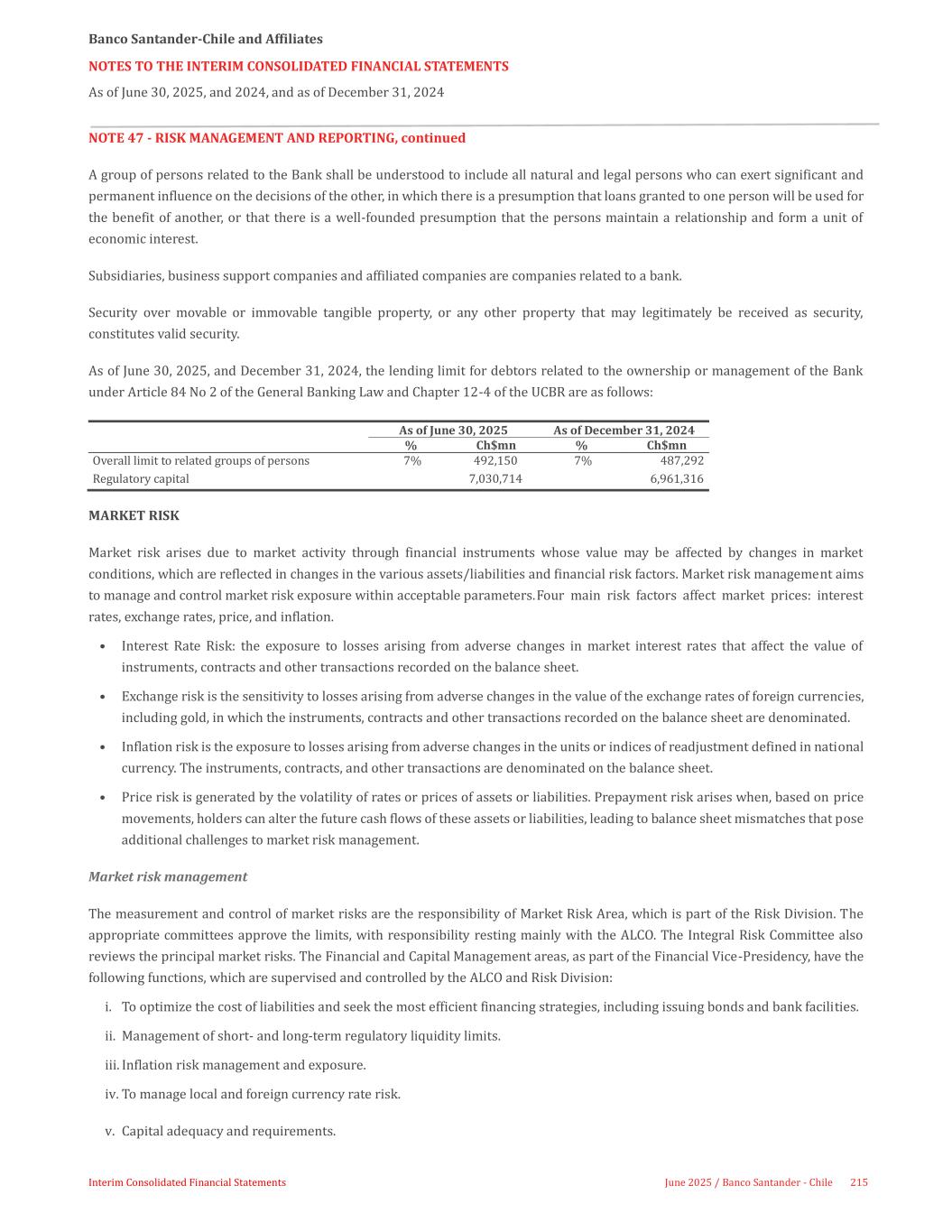 Banco Santander-Chile and Affiliates NOTES TO THE INTERIM CONSOLIDATED FINANCIAL STATEMENTS As of June 30, 2025, and 2024, and as of December 31, 2024 Interim Consolidated Financial Statements June 2025 / Banco Santander - Chile 215 NOTE 47 - RISK MANAGEMENT AND REPORTING, continued A group of persons related to the Bank shall be understood to include all natural and legal persons who can exert significant and permanent influence on the decisions of the other, in which there is a presumption that loans granted to one person will be used for the benefit of another, or that there is a well-founded presumption that the persons maintain a relationship and form a unit of economic interest. Subsidiaries, business support companies and affiliated companies are companies related to a bank. Security over movable or immovable tangible property, or any other property that may legitimately be received as security, constitutes valid security. As of June 30, 2025, and December 31, 2024, the lending limit for debtors related to the ownership or management of the Bank under Article 84 No 2 of the General Banking Law and Chapter 12-4 of the UCBR are as follows: As of June 30, 2025 As of December 31, 2024 % Ch$mn % Ch$mn Overall limit to related groups of persons 7% 492,150 7% 487,292 Regulatory capital 7,030,714 6,961,316 MARKET RISK Market risk arises due to market activity through financial instruments whose value may be affected by changes in market conditions, which are reflected in changes in the various assets/liabilities and financial risk factors. Market risk management aims to manage and control market risk exposure within acceptable parameters. Four main risk factors affect market prices: interest rates, exchange rates, price, and inflation. Interest Rate Risk: the exposure to losses arising from adverse changes in market interest rates that affect the value of instruments, contracts and other transactions recorded on the balance sheet. Exchange risk is the sensitivity to losses arising from adverse changes in the value of the exchange rates of foreign currencies, including gold, in which the instruments, contracts and other transactions recorded on the balance sheet are denominated. Inflation risk is the exposure to losses arising from adverse changes in the units or indices of readjustment defined in national currency. The instruments, contracts, and other transactions are denominated on the balance sheet. Price risk is generated by the volatility of rates or prices of assets or liabilities. Prepayment risk arises when, based on price movements, holders can alter the future cash flows of these assets or liabilities, leading to balance sheet mismatches that pose additional challenges to market risk management. Market risk management The measurement and control of market risks are the responsibility of Market Risk Area, which is part of the Risk Division. The appropriate committees approve the limits, with responsibility resting mainly with the ALCO. The Integral Risk Committee also reviews the principal market risks. The Financial and Capital Management areas, as part of the Financial Vice-Presidency, have the following functions, which are supervised and controlled by the ALCO and Risk Division: i. To optimize the cost of liabilities and seek the most efficient financing strategies, including issuing bonds and bank facilities. ii. Management of short- and long-term regulatory liquidity limits. iii. Inflation risk management and exposure. iv. To manage local and foreign currency rate risk. v. Capital adequacy and requirements.