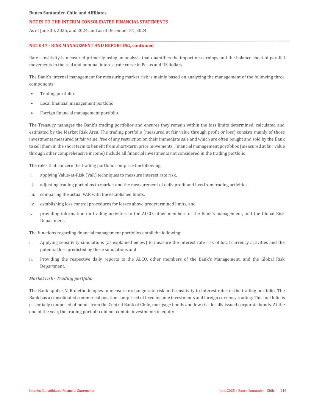 Banco Santander-Chile and Affiliates NOTES TO THE INTERIM CONSOLIDATED FINANCIAL STATEMENTS As of June 30, 2025, and 2024, and as of December 31, 2024 Interim Consolidated Financial Statements June 2025 / Banco Santander - Chile 216 NOTE 47 - RISK MANAGEMENT AND REPORTING, continued Rate sensitivity is measured primarily using an analysis that quantifies the impact on earnings and the balance sheet of parallel movements in the real and nominal interest rate curve in Pesos and US dollars. The Bank's internal management for measuring market risk is mainly based on analyzing the management of the following three components: Trading portfolio. Local financial management portfolio. Foreign financial management portfolio. The Treasury manages the Bank's trading portfolios and ensures they remain within the loss limits determined, calculated and estimated by the Market Risk Area. The trading portfolio (measured at fair value through profit or loss) consists mainly of those investments measured at fair value, free of any restriction on their immediate sale and which are often bought and sold by the Bank to sell them in the short term to benefit from short-term price movements. Financial management portfolios (measured at fair value through other comprehensive income) include all financial investments not considered in the trading portfolio. The roles that concern the trading portfolio comprise the following: i. applying Value-at-Risk (VaR) techniques to measure interest rate risk, ii. adjusting trading portfolios to market and the measurement of daily profit and loss from trading activities, iii. comparing the actual VAR with the established limits, iv. establishing loss control procedures for losses above predetermined limits, and v. providing information on trading activities to the ALCO, other members of the Bank's management, and the Global Risk Department. The functions regarding financial management portfolios entail the following: i. Applying sensitivity simulations (as explained below) to measure the interest rate risk of local currency activities and the potential loss predicted by these simulations and ii. Providing the respective daily reports to the ALCO, other members of the Bank's Management, and the Global Risk Department. Market risk - Trading portfolio The Bank applies VaR methodologies to measure exchange rate risk and sensitivity to interest rates of the trading portfolio. The Bank has a consolidated commercial position comprised of fixed income investments and foreign currency trading. This portfolio is essentially composed of bonds from the Central Bank of Chile, mortgage bonds and low risk locally issued corporate bonds. At the end of the year, the trading portfolio did not contain investments in equity.