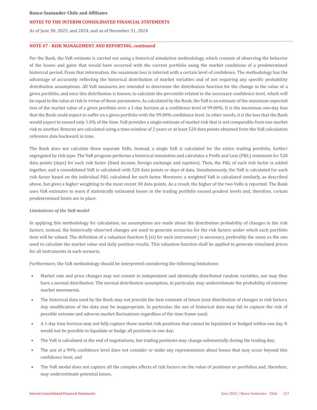 Banco Santander-Chile and Affiliates NOTES TO THE INTERIM CONSOLIDATED FINANCIAL STATEMENTS As of June 30, 2025, and 2024, and as of December 31, 2024 Interim Consolidated Financial Statements June 2025 / Banco Santander - Chile 217 NOTE 47 - RISK MANAGEMENT AND REPORTING, continued For the Bank, the VaR estimate is carried out using a historical simulation methodology, which consists of observing the behavior of the losses and gains that would have occurred with the current portfolio using the market conditions of a predetermined historical period. From that information, the maximum loss is inferred with a certain level of confidence. The methodology has the advantage of accurately reflecting the historical distribution of market variables and of not requiring any specific probability distribution assumptions. All VaR measures are intended to determine the distribution function for the change in the value of a given portfolio, and once this distribution is known, to calculate the percentile related to the necessary confidence level, which will be equal to the value at risk in virtue of those parameters. As calculated by the Bank, the VaR is an estimate of the maximum expected loss of the market value of a given portfolio over a 1-day horizon at a confidence level of 99.00%. It is the maximum one-day loss that the Bank could expect to suffer on a given portfolio with the 99.00% confidence level. In other words, it is the loss that the Bank would expect to exceed only 1.0% of the time. VaR provides a single estimate of market risk that is not comparable from one market risk to another. Returns are calculated using a time window of 2 years or at least 520 data points obtained from the VaR calculation reference date backward in time. The Bank does not calculate three separate VaRs. Instead, a single VaR is calculated for the entire trading portfolio, further segregated by risk type. The VaR program performs a historical simulation and calculates a Profit and Loss (P&L) statement for 520 data points (days) for each risk factor (fixed income, foreign exchange and equities). Then, the P&L of each risk factor is added together, and a consolidated VaR is calculated with 520 data points or days of data. Simultaneously, the VaR is calculated for each risk factor based on the individual P&L calculated for each factor. Moreover, a weighted VaR is calculated similarly, as described above, but gives a higher weighting to the most recent 30 data points. As a result, the higher of the two VaRs is reported. The Bank uses VaR estimates to warn if statistically estimated losses in the trading portfolio exceed prudent levels and, therefore, certain predetermined limits are in place. Limitations of the VaR model In applying this methodology for calculation, no assumptions are made about the distribution probability of changes in the risk factors; instead, the historically observed changes are used to generate scenarios for the risk factors under which each portfolio item will be valued. The definition of a valuation function fj (xi) for each instrument j is necessary, preferably the same as the one used to calculate the market value and daily position results. This valuation function shall be applied to generate simulated prices for all instruments in each scenario. Furthermore, the VaR methodology should be interpreted considering the following limitations: Market rate and price changes may not consist in independent and identically distributed random variables, nor may they have a normal distribution. The normal distribution assumption, in particular, may underestimate the probability of extreme market movements. The historical data used by the Bank may not provide the best estimate of future joint distribution of changes in risk factors. Any modification of the data may be inappropriate. In particular, the use of historical data may fail to capture the risk of possible extreme and adverse market fluctuations regardless of the time frame used; A 1-day time horizon may not fully capture those market risk positions that cannot be liquidated or hedged within one day. It would not be possible to liquidate or hedge all positions in one day; The VaR is calculated at the end of negotiations, but trading positions may change substantially during the trading day; The use of a 99% confidence level does not consider or make any representation about losses that may occur beyond this confidence level, and The VaR model does not capture all the complex effects of risk factors on the value of positions or portfolios and, therefore, may underestimate potential losses.