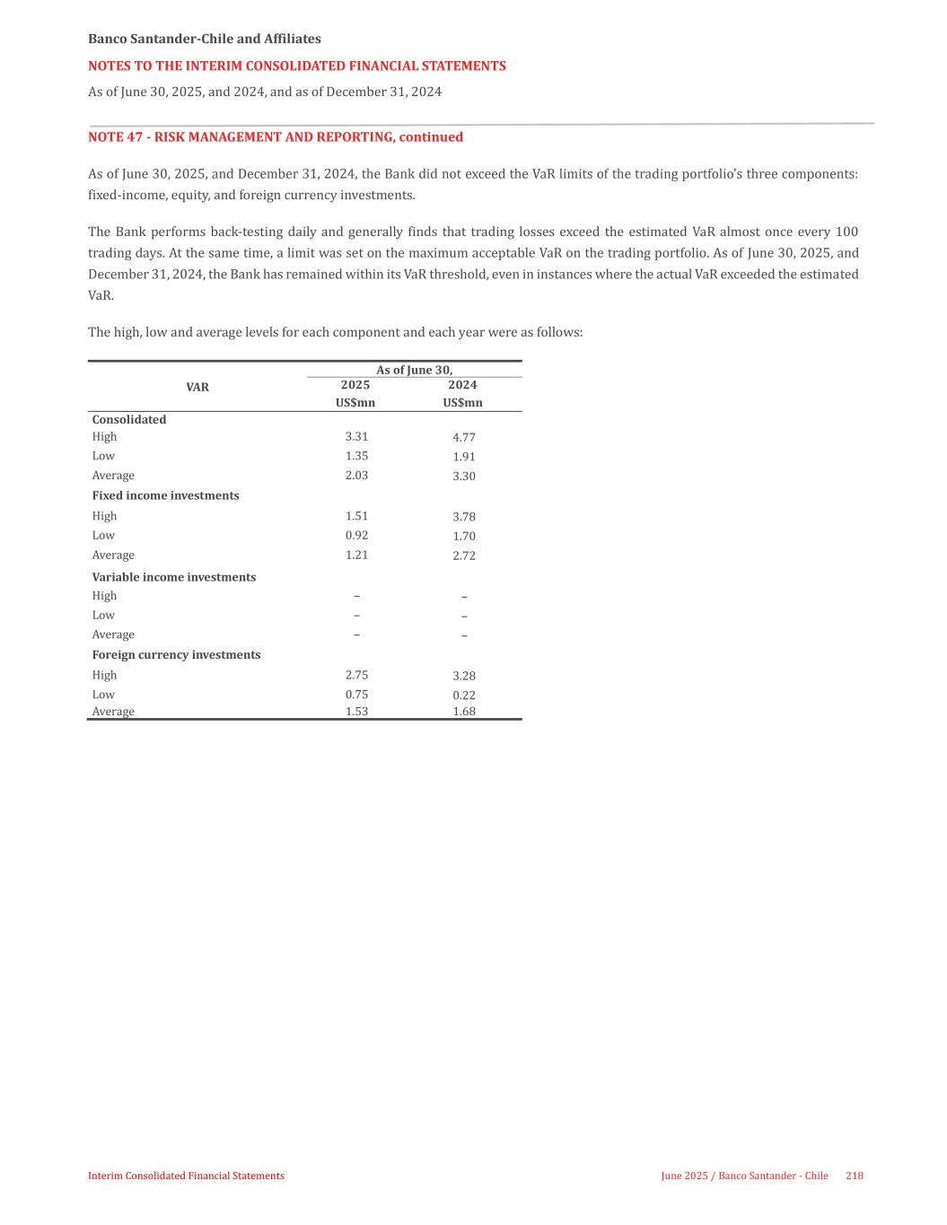 Banco Santander-Chile and Affiliates NOTES TO THE INTERIM CONSOLIDATED FINANCIAL STATEMENTS As of June 30, 2025, and 2024, and as of December 31, 2024 Interim Consolidated Financial Statements June 2025 / Banco Santander - Chile 218 NOTE 47 - RISK MANAGEMENT AND REPORTING, continued As of June 30, fixed-income, equity, and foreign currency investments. The Bank performs back-testing daily and generally finds that trading losses exceed the estimated VaR almost once every 100 trading days. At the same time, a limit was set on the maximum acceptable VaR on the trading portfolio. As of June 30, 2025, and December 31, 2024, the Bank has remained within its VaR threshold, even in instances where the actual VaR exceeded the estimated VaR. The high, low and average levels for each component and each year were as follows: VAR As of June 30, 2025 2024 US$mn US$mn Consolidated High 3.31 4.77 Low 1.35 1.91 Average 2.03 3.30 Fixed income investments High 1.51 3.78 Low 0.92 1.70 Average 1.21 2.72 Variable income investments High Low Average Foreign currency investments High 2.75 3.28 Low 0.75 0.22 Average 1.53 1.68