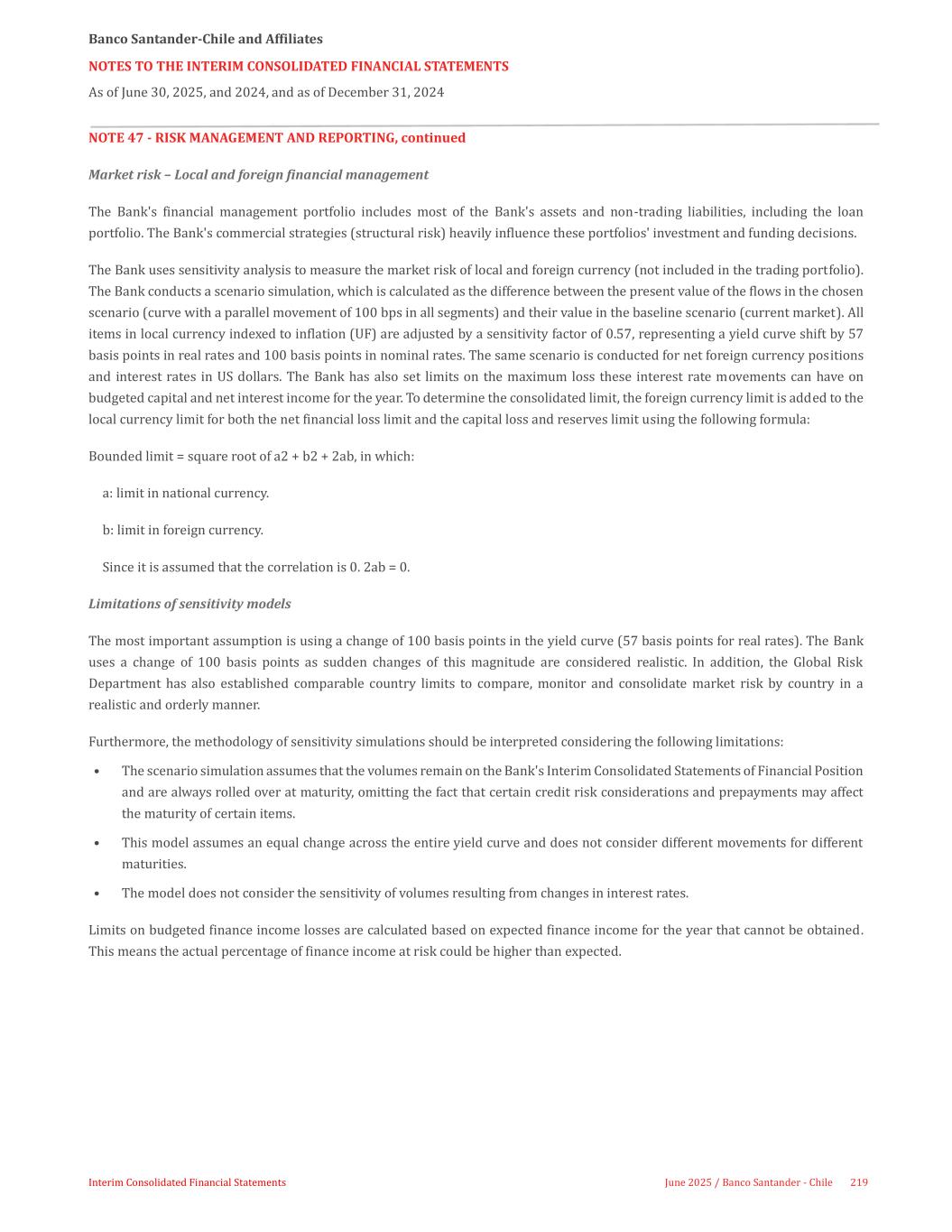 Banco Santander-Chile and Affiliates NOTES TO THE INTERIM CONSOLIDATED FINANCIAL STATEMENTS As of June 30, 2025, and 2024, and as of December 31, 2024 Interim Consolidated Financial Statements June 2025 / Banco Santander - Chile 219 NOTE 47 - RISK MANAGEMENT AND REPORTING, continued Market risk Local and foreign financial management The Bank's financial management portfolio includes most of the Bank's assets and non-trading liabilities, including the loan portfolio. The Bank's commercial strategies (structural risk) heavily influence these portfolios' investment and funding decisions. The Bank uses sensitivity analysis to measure the market risk of local and foreign currency (not included in the trading portfolio). The Bank conducts a scenario simulation, which is calculated as the difference between the present value of the flows in the chosen scenario (curve with a parallel movement of 100 bps in all segments) and their value in the baseline scenario (current market). All items in local currency indexed to inflation (UF) are adjusted by a sensitivity factor of 0.57, representing a yield curve shift by 57 basis points in real rates and 100 basis points in nominal rates. The same scenario is conducted for net foreign currency positions and interest rates in US dollars. The Bank has also set limits on the maximum loss these interest rate movements can have on budgeted capital and net interest income for the year. To determine the consolidated limit, the foreign currency limit is added to the local currency limit for both the net financial loss limit and the capital loss and reserves limit using the following formula: Bounded limit = square root of a2 + b2 + 2ab, in which: a: limit in national currency. b: limit in foreign currency. Since it is assumed that the correlation is 0. 2ab = 0. Limitations of sensitivity models The most important assumption is using a change of 100 basis points in the yield curve (57 basis points for real rates). The Bank uses a change of 100 basis points as sudden changes of this magnitude are considered realistic. In addition, the Global Risk Department has also established comparable country limits to compare, monitor and consolidate market risk by country in a realistic and orderly manner. Furthermore, the methodology of sensitivity simulations should be interpreted considering the following limitations: The scenario simulation assumes that the volumes remain on the Bank's Interim Consolidated Statements of Financial Position and are always rolled over at maturity, omitting the fact that certain credit risk considerations and prepayments may affect the maturity of certain items. This model assumes an equal change across the entire yield curve and does not consider different movements for different maturities. The model does not consider the sensitivity of volumes resulting from changes in interest rates. Limits on budgeted finance income losses are calculated based on expected finance income for the year that cannot be obtained. This means the actual percentage of finance income at risk could be higher than expected.