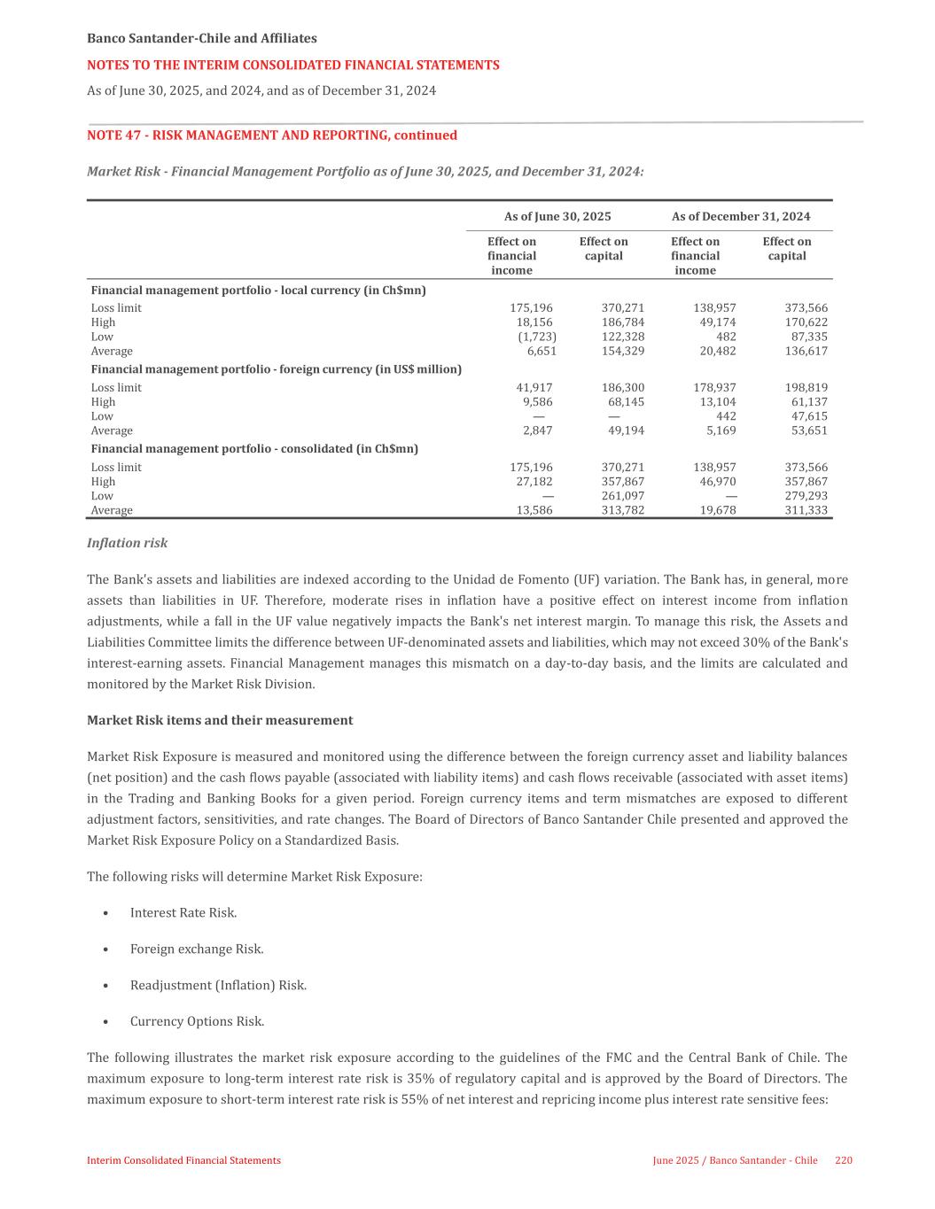Banco Santander-Chile and Affiliates NOTES TO THE INTERIM CONSOLIDATED FINANCIAL STATEMENTS As of June 30, 2025, and 2024, and as of December 31, 2024 Interim Consolidated Financial Statements June 2025 / Banco Santander - Chile 220 NOTE 47 - RISK MANAGEMENT AND REPORTING, continued Market Risk - Financial Management Portfolio as of June 30, 2025, and December 31, 2024: As of June 30, 2025 As of December 31, 2024 Effect on financial income Effect on capital Effect on financial income Effect on capital Financial management portfolio - local currency (in Ch$mn) Loss limit 175,196 370,271 138,957 373,566 High 18,156 186,784 49,174 170,622 Low (1,723) 122,328 482 87,335 Average 6,651 154,329 20,482 136,617 Financial management portfolio - foreign currency (in US$ million) Loss limit 41,917 186,300 178,937 198,819 High 9,586 68,145 13,104 61,137 Low 442 47,615 Average 2,847 49,194 5,169 53,651 Financial management portfolio - consolidated (in Ch$mn) Loss limit 175,196 370,271 138,957 373,566 High 27,182 357,867 46,970 357,867 Low 261,097 279,293 Average 13,586 313,782 19,678 311,333 Inflation risk The Bank's assets and liabilities are indexed according to the Unidad de Fomento (UF) variation. The Bank has, in general, more assets than liabilities in UF. Therefore, moderate rises in inflation have a positive effect on interest income from inflation adjustments, while a fall in the UF value negatively impacts the Bank's net interest margin. To manage this risk, the Assets and Liabilities Committee limits the difference between UF-denominated assets and liabilities, which may not exceed 30% of the Bank's interest-earning assets. Financial Management manages this mismatch on a day-to-day basis, and the limits are calculated and monitored by the Market Risk Division. Market Risk items and their measurement Market Risk Exposure is measured and monitored using the difference between the foreign currency asset and liability balances (net position) and the cash flows payable (associated with liability items) and cash flows receivable (associated with asset items) in the Trading and Banking Books for a given period. Foreign currency items and term mismatches are exposed to different adjustment factors, sensitivities, and rate changes. The Board of Directors of Banco Santander Chile presented and approved the Market Risk Exposure Policy on a Standardized Basis. The following risks will determine Market Risk Exposure: Interest Rate Risk. Foreign exchange Risk. Readjustment (Inflation) Risk. Currency Options Risk. The following illustrates the market risk exposure according to the guidelines of the FMC and the Central Bank of Chile. The maximum exposure to long-term interest rate risk is 35% of regulatory capital and is approved by the Board of Directors. The maximum exposure to short-term interest rate risk is 55% of net interest and repricing income plus interest rate sensitive fees: