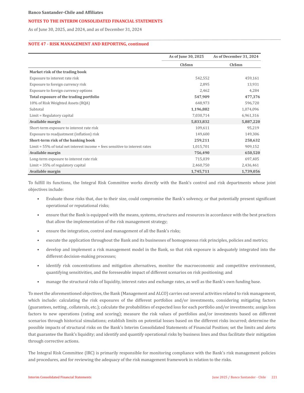 Banco Santander-Chile and Affiliates NOTES TO THE INTERIM CONSOLIDATED FINANCIAL STATEMENTS As of June 30, 2025, and 2024, and as of December 31, 2024 Interim Consolidated Financial Statements June 2025 / Banco Santander - Chile 221 NOTE 47 - RISK MANAGEMENT AND REPORTING, continued As of June 30, 2025 As of December 31, 2024 Ch$mn Ch$mn Market risk of the trading book Exposure to interest rate risk 542,552 459,161 Exposure to foreign currency risk 2,895 13,931 Exposure to foreign currency options 2,462 4,284 Total exposure of the trading portfolio 547,909 477,376 10% of Risk Weighted Assets (RQA) 648,973 596,720 Subtotal 1,196,882 1,074,096 Limit = Regulatory capital 7,030,714 6,961,316 Available margin 5,833,832 5,887,220 Short-term exposure to interest rate risk 109,611 95,219 Exposure to readjustment (inflation) risk 149,600 149,306 Short-term risk of the banking book 259,211 258,632 Limit = 55% of total net interest income + fees sensitive to interest rates 1,015,701 909,152 Available margin 756,490 650,520 Long-term exposure to interest rate risk 715,039 697,405 Limit = 35% of regulatory capital 2,460,750 2,436,461 Available margin 1,745,711 1,739,056 To fulfill its functions, the Integral Risk Committee works directly with the Bank's control and risk departments whose joint objectives include: Evaluate those risks that, due to their size, could compromise the Bank's solvency, or that potentially present significant operational or reputational risks; ensure that the Bank is equipped with the means, systems, structures and resources in accordance with the best practices that allow the implementation of the risk management strategy; ensure the integration, control and management of all the Bank's risks; execute the application throughout the Bank and its businesses of homogeneous risk principles, policies and metrics; develop and implement a risk management model in the Bank, so that risk exposure is adequately integrated into the different decision-making processes; identify risk concentrations and mitigation alternatives, monitor the macroeconomic and competitive environment, quantifying sensitivities, and the foreseeable impact of different scenarios on risk positioning; and manage the structural risks of liquidity, interest rates and exchange rates, as well as the Bank's own funding base. To meet the aforementioned objectives, the Bank (Management and ALCO) carries out several activities related to risk management, which include: calculating the risk exposures of the different portfolios and/or investments, considering mitigating factors (guarantees, netting , collaterals, etc.); calculate the probabilities of expected loss for each portfolio and/or investments; assign loss factors to new operations (rating and scoring); measure the risk values of portfolios and/or investments based on different scenarios through historical simulations; establish limits on potential losses based on the different risks incurred; determine the possible impacts of structural risks on the Bank's Interim Consolidated Statements of Financial Position; set the limits and alerts that guarantee the Bank's liquidity; and identify and quantify operational risks by business lines and thus facilitate their mitigation through corrective actions. The Integral Risk Committee (IRC) is primarily responsible for monitoring compliance with the Bank's risk management policies and procedures, and for reviewing the adequacy of the risk management framework in relation to the risks.