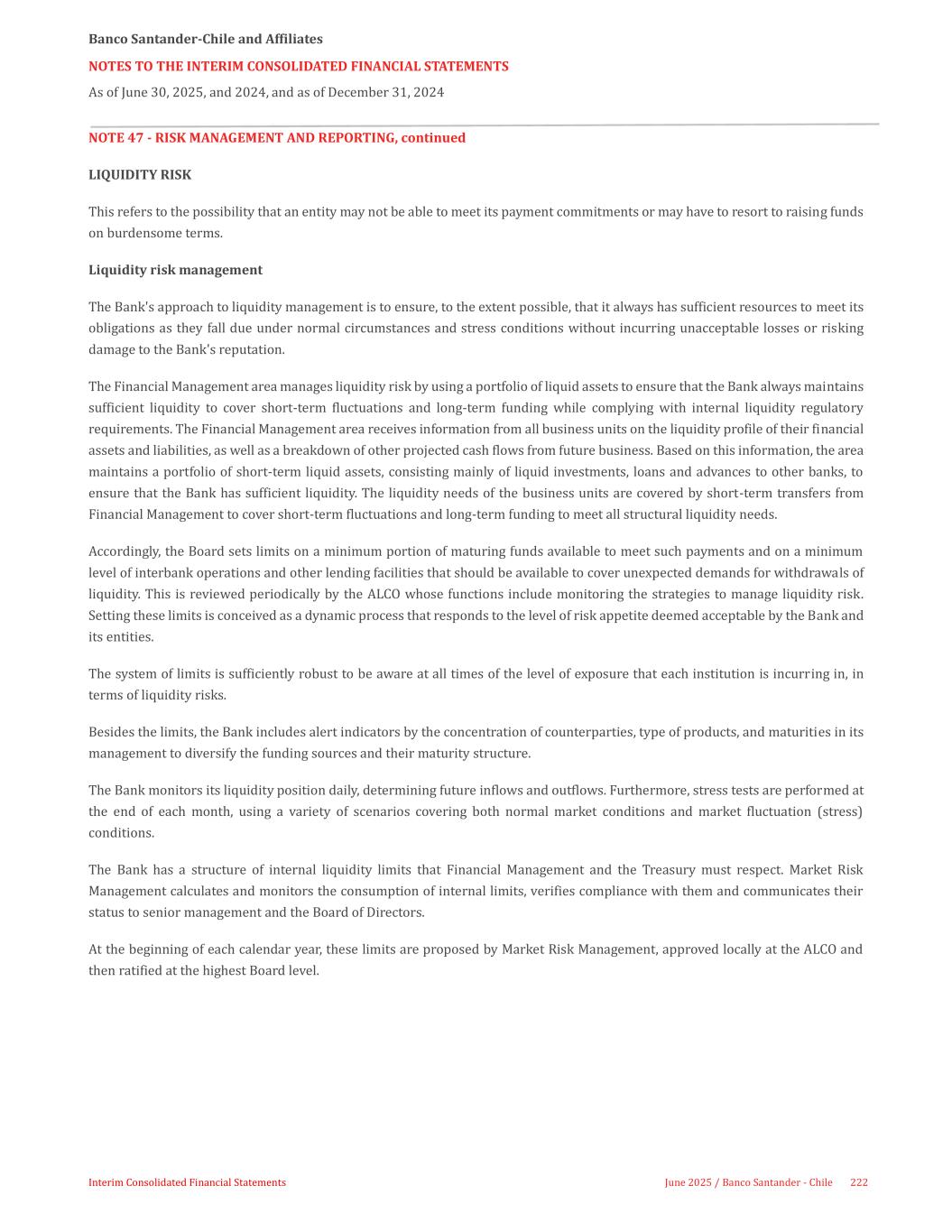 Banco Santander-Chile and Affiliates NOTES TO THE INTERIM CONSOLIDATED FINANCIAL STATEMENTS As of June 30, 2025, and 2024, and as of December 31, 2024 Interim Consolidated Financial Statements June 2025 / Banco Santander - Chile 222 NOTE 47 - RISK MANAGEMENT AND REPORTING, continued LIQUIDITY RISK This refers to the possibility that an entity may not be able to meet its payment commitments or may have to resort to raising funds on burdensome terms. Liquidity risk management The Bank's approach to liquidity management is to ensure, to the extent possible, that it always has sufficient resources to meet its obligations as they fall due under normal circumstances and stress conditions without incurring unacceptable losses or risking damage to the Bank's reputation. The Financial Management area manages liquidity risk by using a portfolio of liquid assets to ensure that the Bank always maintains sufficient liquidity to cover short-term fluctuations and long-term funding while complying with internal liquidity regulatory requirements. The Financial Management area receives information from all business units on the liquidity profile of their financial assets and liabilities, as well as a breakdown of other projected cash flows from future business. Based on this information, the area maintains a portfolio of short-term liquid assets, consisting mainly of liquid investments, loans and advances to other banks, to ensure that the Bank has sufficient liquidity. The liquidity needs of the business units are covered by short-term transfers from Financial Management to cover short-term fluctuations and long-term funding to meet all structural liquidity needs. Accordingly, the Board sets limits on a minimum portion of maturing funds available to meet such payments and on a minimum level of interbank operations and other lending facilities that should be available to cover unexpected demands for withdrawals of liquidity. This is reviewed periodically by the ALCO whose functions include monitoring the strategies to manage liquidity risk. Setting these limits is conceived as a dynamic process that responds to the level of risk appetite deemed acceptable by the Bank and its entities. The system of limits is sufficiently robust to be aware at all times of the level of exposure that each institution is incurring in, in terms of liquidity risks. Besides the limits, the Bank includes alert indicators by the concentration of counterparties, type of products, and maturities in its management to diversify the funding sources and their maturity structure. The Bank monitors its liquidity position daily, determining future inflows and outflows. Furthermore, stress tests are performed at the end of each month, using a variety of scenarios covering both normal market conditions and market fluctuation (stress) conditions. The Bank has a structure of internal liquidity limits that Financial Management and the Treasury must respect. Market Risk Management calculates and monitors the consumption of internal limits, verifies compliance with them and communicates their status to senior management and the Board of Directors. At the beginning of each calendar year, these limits are proposed by Market Risk Management, approved locally at the ALCO and then ratified at the highest Board level.