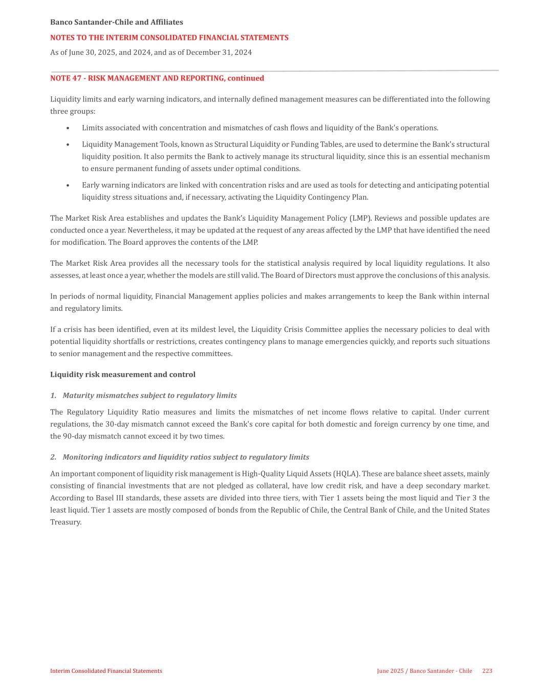 Banco Santander-Chile and Affiliates NOTES TO THE INTERIM CONSOLIDATED FINANCIAL STATEMENTS As of June 30, 2025, and 2024, and as of December 31, 2024 Interim Consolidated Financial Statements June 2025 / Banco Santander - Chile 223 NOTE 47 - RISK MANAGEMENT AND REPORTING, continued Liquidity limits and early warning indicators, and internally defined management measures can be differentiated into the following three groups: Limits associated with concentration and mismatches of cash flows and liquidity of the Bank's operations. Liquidity Management Tools, known as Structural Liquidity or Funding Tables, are used to determine the Bank's structural liquidity position. It also permits the Bank to actively manage its structural liquidity, since this is an essential mechanism to ensure permanent funding of assets under optimal conditions. Early warning indicators are linked with concentration risks and are used as tools for detecting and anticipating potential liquidity stress situations and, if necessary, activating the Liquidity Contingency Plan. conducted once a year. Nevertheless, it may be updated at the request of any areas affected by the LMP that have identified the need for modification. The Board approves the contents of the LMP. The Market Risk Area provides all the necessary tools for the statistical analysis required by local liquidity regulations. It also assesses, at least once a year, whether the models are still valid. The Board of Directors must approve the conclusions of this analysis. In periods of normal liquidity, Financial Management applies policies and makes arrangements to keep the Bank within internal and regulatory limits. If a crisis has been identified, even at its mildest level, the Liquidity Crisis Committee applies the necessary policies to deal with potential liquidity shortfalls or restrictions, creates contingency plans to manage emergencies quickly, and reports such situations to senior management and the respective committees. Liquidity risk measurement and control 1. Maturity mismatches subject to regulatory limits The Regulatory Liquidity Ratio measures and limits the mismatches of net income flows relative to capital. Under current regulations, the 30-day mismatch cannot exceed the Bank's core capital for both domestic and foreign currency by one time, and the 90-day mismatch cannot exceed it by two times. 2. Monitoring indicators and liquidity ratios subject to regulatory limits An important component of liquidity risk management is High-Quality Liquid Assets (HQLA). These are balance sheet assets, mainly consisting of financial investments that are not pledged as collateral, have low credit risk, and have a deep secondary market. According to Basel III standards, these assets are divided into three tiers, with Tier 1 assets being the most liquid and Tier 3 the least liquid. Tier 1 assets are mostly composed of bonds from the Republic of Chile, the Central Bank of Chile, and the United States Treasury.