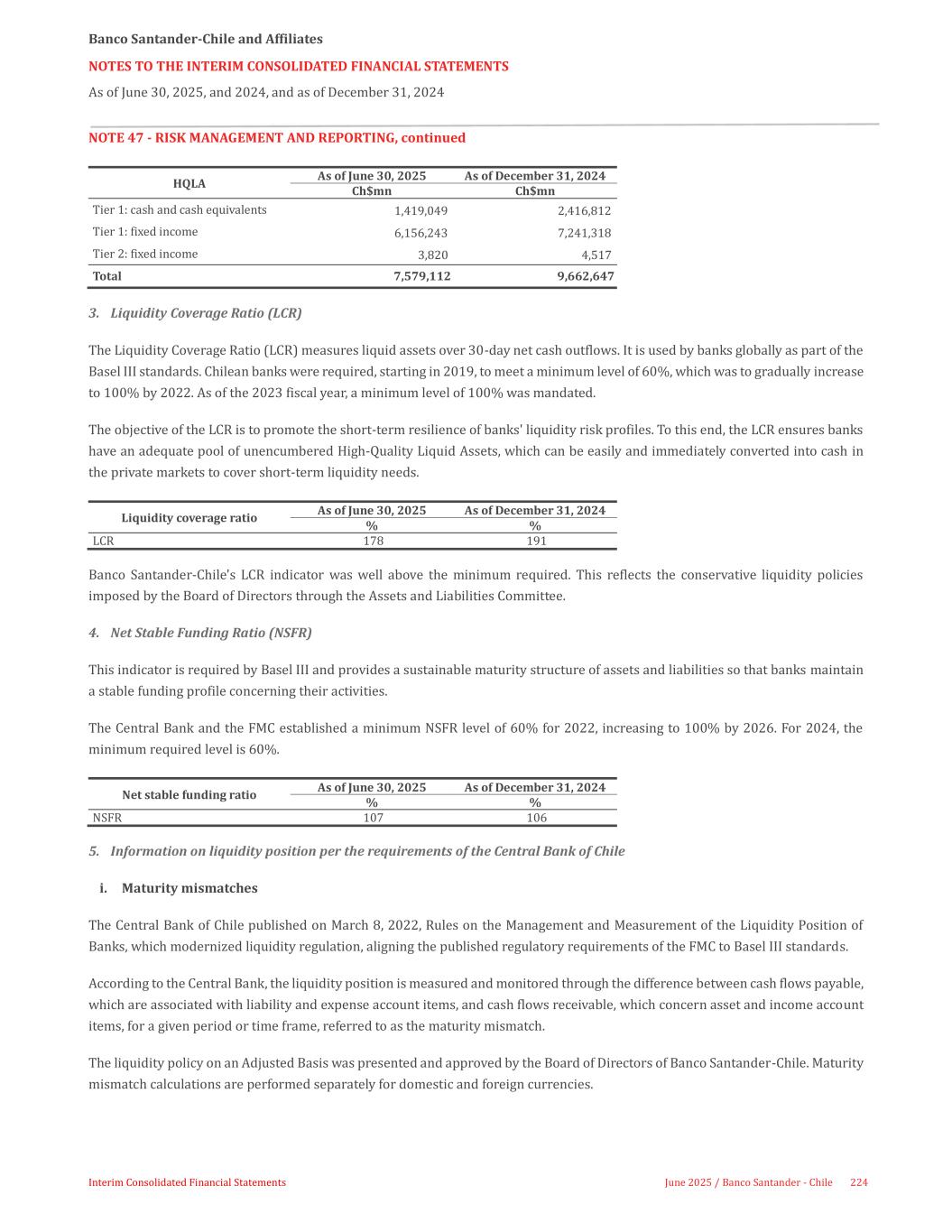 Banco Santander-Chile and Affiliates NOTES TO THE INTERIM CONSOLIDATED FINANCIAL STATEMENTS As of June 30, 2025, and 2024, and as of December 31, 2024 Interim Consolidated Financial Statements June 2025 / Banco Santander - Chile 224 NOTE 47 - RISK MANAGEMENT AND REPORTING, continued HQLA As of June 30, 2025 As of December 31, 2024 Ch$mn Ch$mn Tier 1: cash and cash equivalents 1,419,049 2,416,812 Tier 1: fixed income 6,156,243 7,241,318 Tier 2: fixed income 3,820 4,517 Total 7,579,112 9,662,647 3. Liquidity Coverage Ratio (LCR) The Liquidity Coverage Ratio (LCR) measures liquid assets over 30-day net cash outflows. It is used by banks globally as part of the Basel III standards. Chilean banks were required, starting in 2019, to meet a minimum level of 60%, which was to gradually increase to 100% by 2022. As of the 2023 fiscal year, a minimum level of 100% was mandated. The objective of the LCR is to promote the short-term resilience of banks' liquidity risk profiles. To this end, the LCR ensures banks have an adequate pool of unencumbered High-Quality Liquid Assets, which can be easily and immediately converted into cash in the private markets to cover short-term liquidity needs. Liquidity coverage ratio As of June 30, 2025 As of December 31, 2024 % % LCR 178 191 Banco Santander-Chile's LCR indicator was well above the minimum required. This reflects the conservative liquidity policies imposed by the Board of Directors through the Assets and Liabilities Committee. 4. Net Stable Funding Ratio (NSFR) This indicator is required by Basel III and provides a sustainable maturity structure of assets and liabilities so that banks maintain a stable funding profile concerning their activities. The Central Bank and the FMC established a minimum NSFR level of 60% for 2022, increasing to 100% by 2026. For 2024, the minimum required level is 60%. Net stable funding ratio As of June 30, 2025 As of December 31, 2024 % % NSFR 107 106 5. Information on liquidity position per the requirements of the Central Bank of Chile i. Maturity mismatches The Central Bank of Chile published on March 8, 2022, Rules on the Management and Measurement of the Liquidity Position of Banks, which modernized liquidity regulation, aligning the published regulatory requirements of the FMC to Basel III standards. According to the Central Bank, the liquidity position is measured and monitored through the difference between cash flows payable, which are associated with liability and expense account items, and cash flows receivable, which concern asset and income account items, for a given period or time frame, referred to as the maturity mismatch. The liquidity policy on an Adjusted Basis was presented and approved by the Board of Directors of Banco Santander-Chile. Maturity mismatch calculations are performed separately for domestic and foreign currencies.